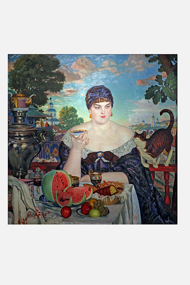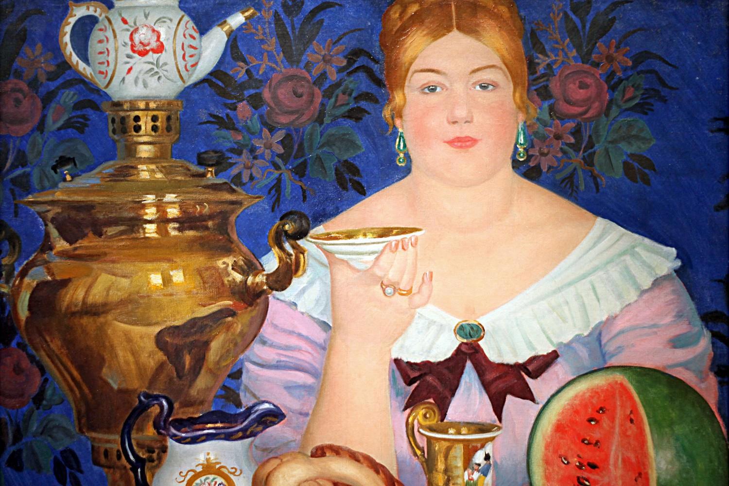 Среди купчих наиболее известна «Купчиха за чаем», написанная Кустодиевым в 1918-м году. Чаепитие являлось для художника одной из якорных, сакральных тем, неоднократно повторяясь в произведениях, наполненных образами застолья, крепкой и дружной семьи. Чинное времяпровождение с чашкой в руках стало для Кустодиева образом умиротворения в душах тех, кто достиг достатка, покоя и внутренней гармонии. Такие люди исполняют своеобразный ритуал благополучного единения не только со своими близкими, но и со своей судьбой, жизнью, миром, всем человечеством.