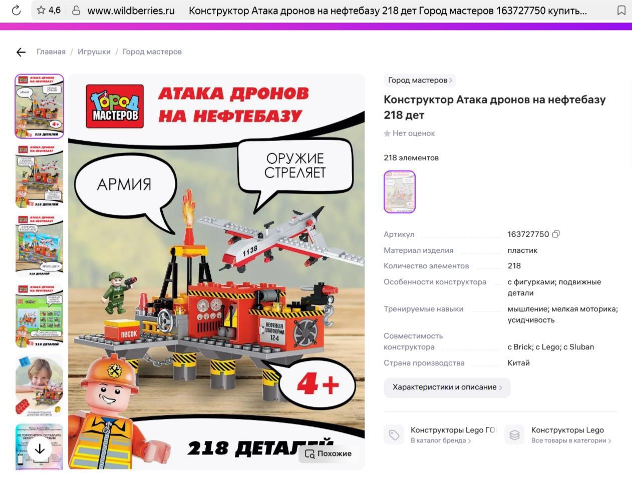 Автор: Михаил ПоляковСделал новый рассказ «Атака дронов» и решил проверить, есть ли рассказы или другая литература с таким же названием. Аллюзию с одной из частей саги «Звёздных войн» вполне уже мог кто-то использовать раньше. Практически сразу наталкиваюсь на конструктор «Атака дронов на нефтебазу», конструктор для детей от 4-х лет на ВБ.