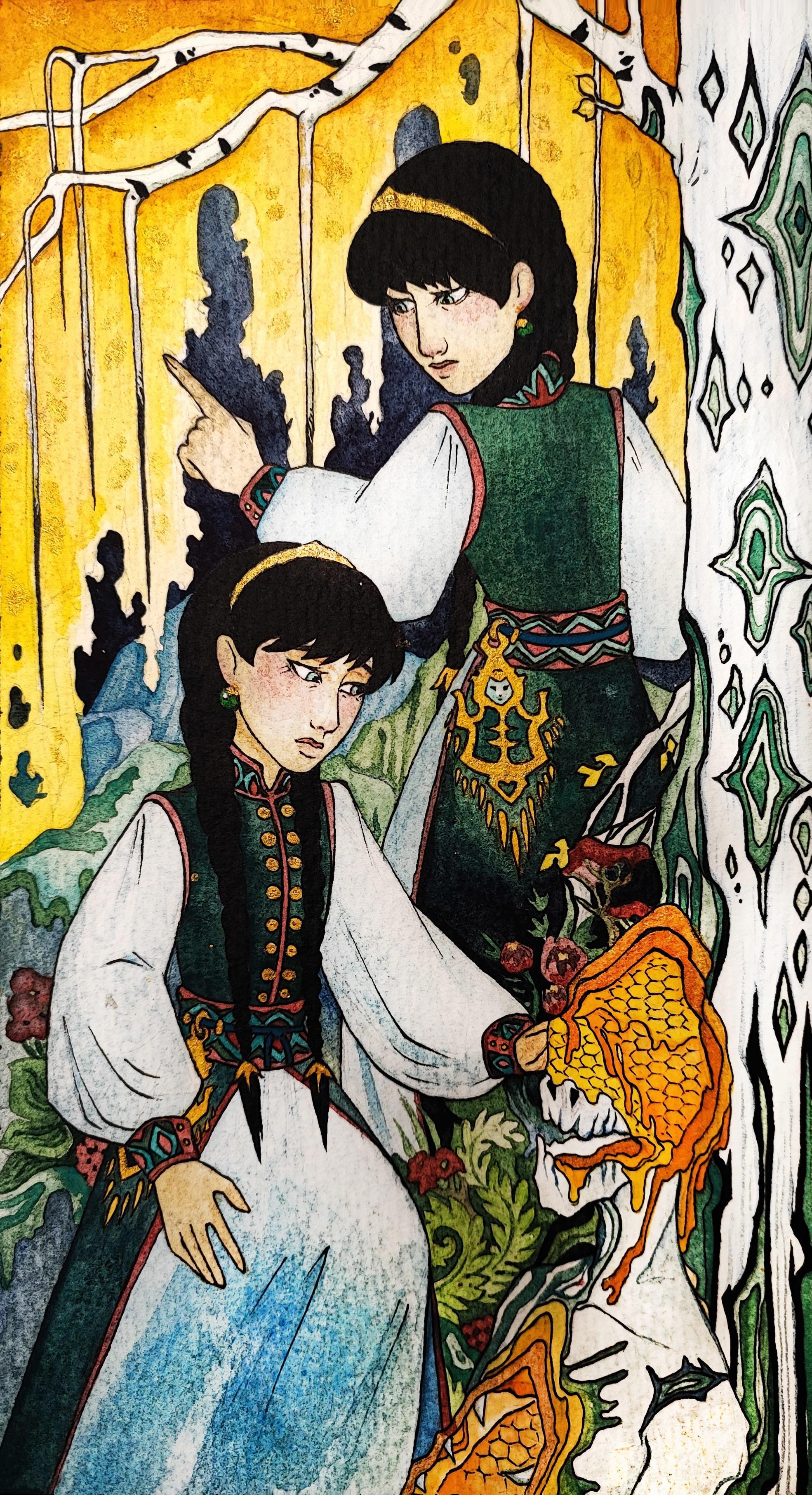Автор: Дарья РомановаУ меня уже есть ч/б иллюстрации к "Трем колесам", но недавно захотелось сделать еще и акварельный арт к главе "Близнецы" - тем более, что сказочно-билибинское настроение истории к этому располагает.