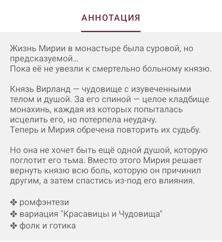 Одно автор упустила: зачем она написала про цветок, найденный в пруду, если потом никак не использовала? А ведь это ретелинг Красавицы и Чудовища. Ещё бы хотелось чтобы про Карачуна раскрыли побольше тему. И не понравилась вставка с фем повесткой, а я считаю это именно она и есть. Потому что в те времена бояре не стали бы слушать какую-то там монахиню, да ещё соглашаться. Ну и сама ситуация: героиня защищает князя :) (рука-лицо), хотя героиня написана адекватной.