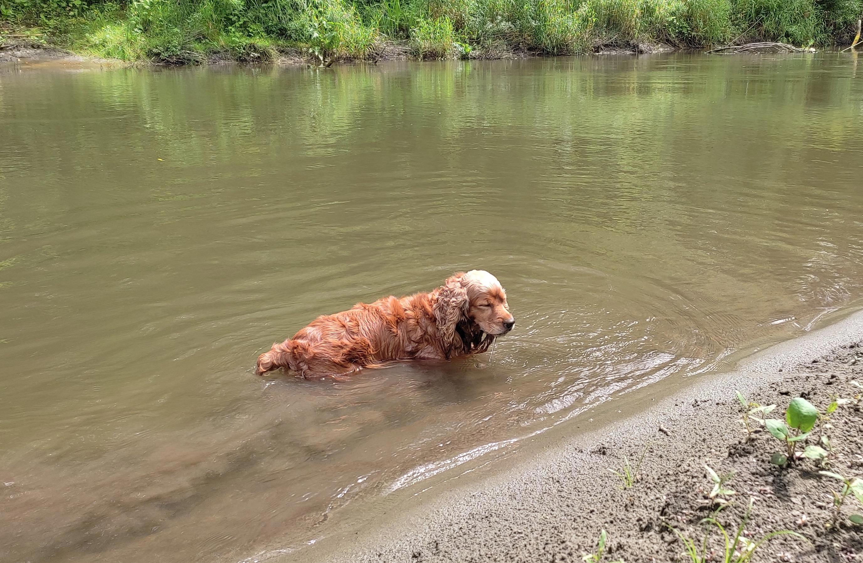Пока мы накачивали лодку и готовились к старту, Дулька не выдержала и сама сунулась в воду. А потом, мокрая и вся в песке, как ни в чем не бывало залезла на корму.