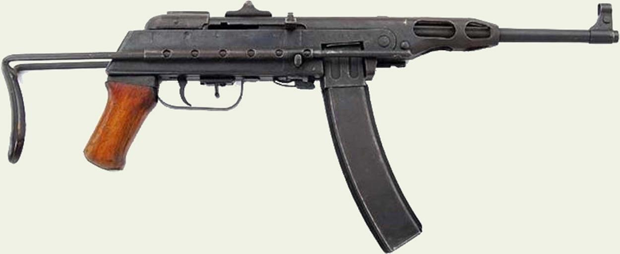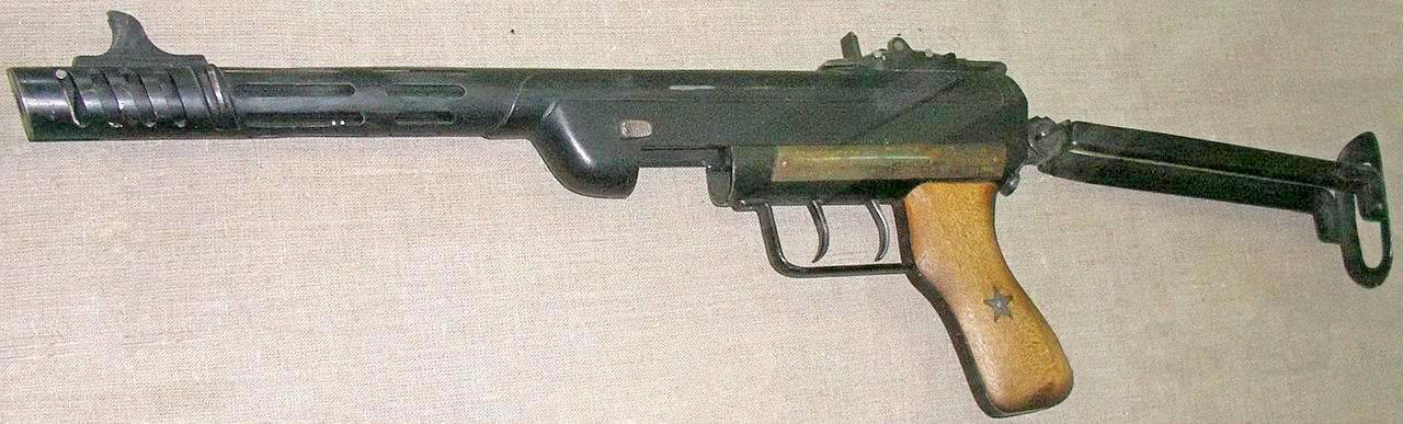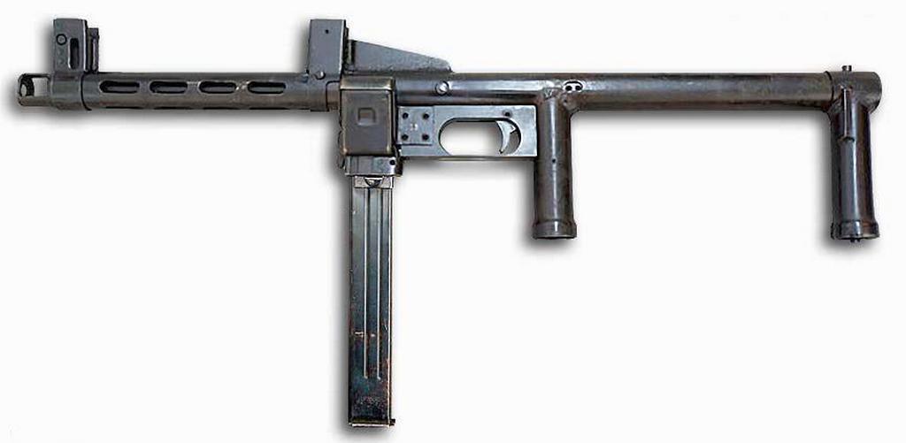 Здесь основой для конструкции явно послужили ППД и ППШ. Похоже, что и магазин полагался оттуда же. Предусмотрена не только защита руки, но и дульный компенсатор. Обратите внимание на две спусковые скобы. Одна из них для автоматического огня, другая – для одиночного. Интересно то, что скорострельность данного образца была почти в два раза меньше, чем у «пожирателя патронов» ППШ.