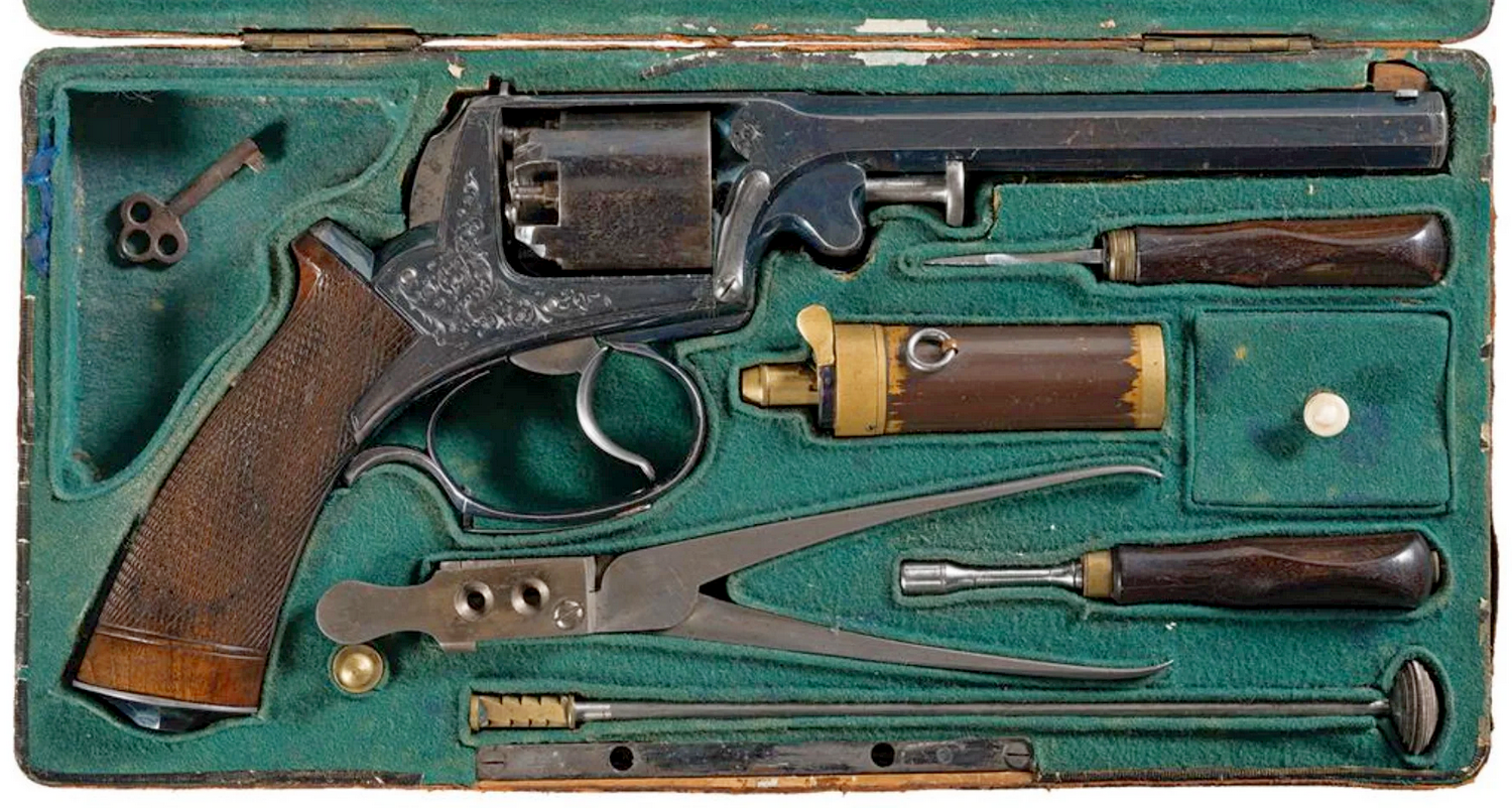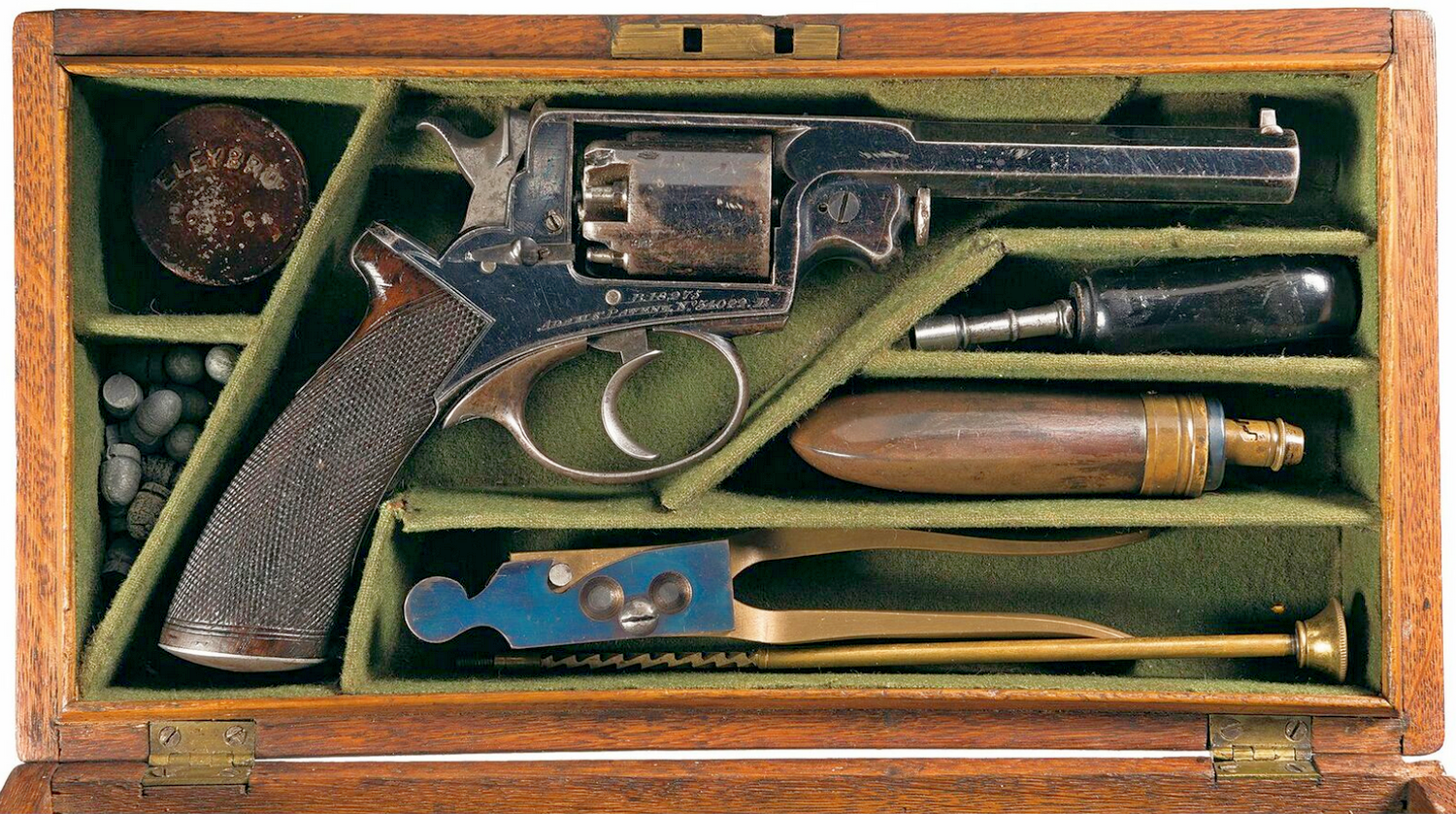 то грубых мужских игрушек для его арсенала, уже сделанных конструкторами и производителями, ему хватит. Есть, кажется всё. Буквально на любой вкус и размер. Иногда даже из-за этого возникают небольшие казусы. Вот недавно среди образцов, представленных на одном аукционе для коллекционеров оружия, промелькнул образец, подписанный как «Неизвестный револьвер калибра 10 мм 1862 года». Смотрю это я на него, и действительно возникает какое-то странное ощущение. Вроде бы что-то похожее я уже видел, но тут это вроде бы и не оно. Действительно – угол наклона рукоятки, как револьверов «Ле Ма», но конструкция явно другая. И что это за зверь такой, что его даже специалисты не смогли опознать? Вот он, в подарочной коробочке с всеми прибамбасами:
