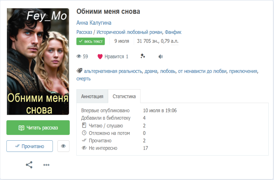 Добавлено 9 июля и уже аж 17! отметок "Не интересно". Я в принципе понимаю, что многим не заходят определённые жанры, но лично прочитав весь рассказ не согласен с таким незаслуженным пренебрежением. Я знаю, что "Не интересно" не является "дизлайком", но читатели иногда отталкиваются от этого пункта в статистике книги. Честно признаюсь, не читал других произведений этого автора, но конкретно этот рассказ мне бы хотелось поддержать.