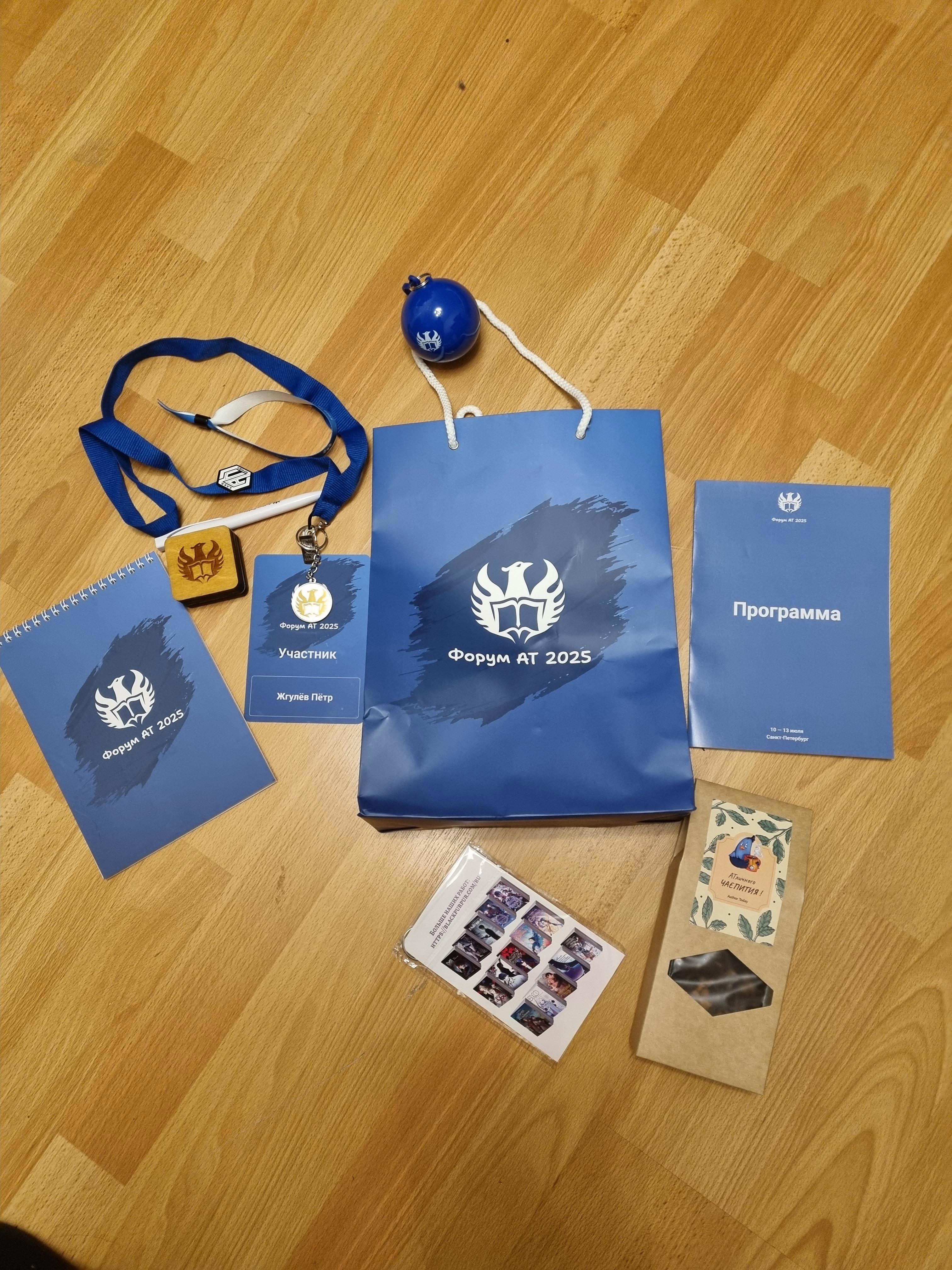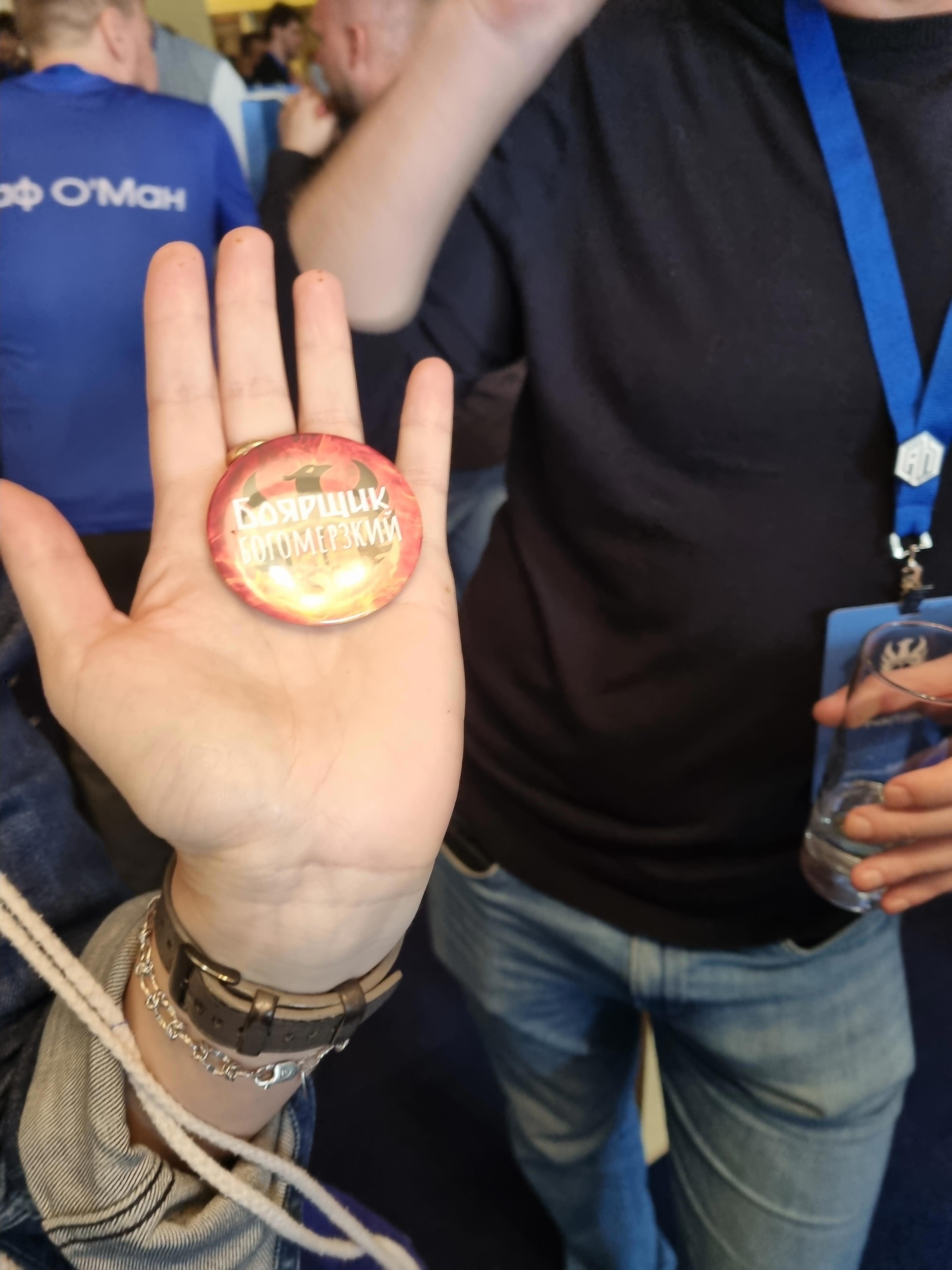 Там я получил симпатичный пакет, внутри которого оказался чай, шарик, ручка, блокнот, програмка, брелок от студии, создающей комиксы + браслет-пропуск. Тут была куча народу и я впервые увидел вживую Дмитрия Мазурова — одного из членов АЛКО-проды. И Дмитрий выдал мне изготовленный по его заказу клубный значок)