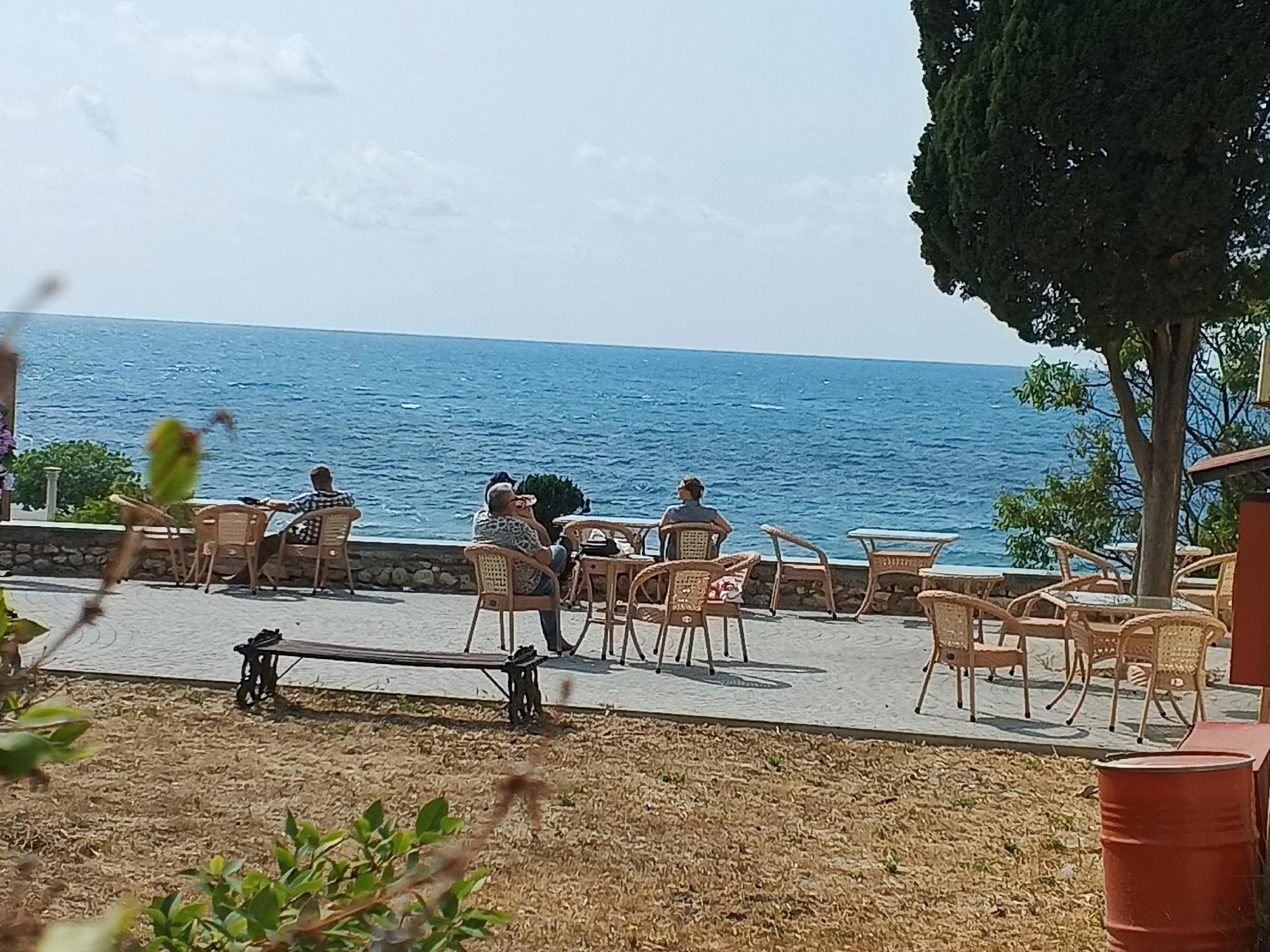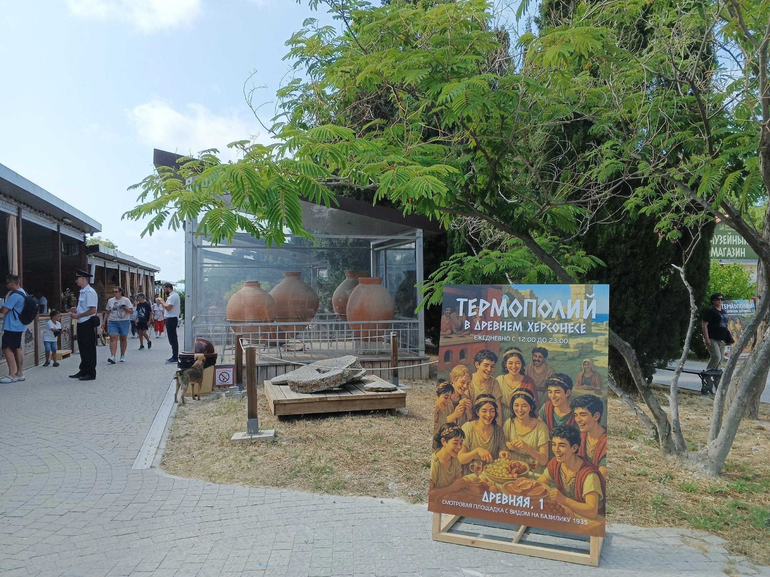 Как выяснилось аллея претерпела изменения. По одной стороне так и остались музейные экспонаты. только теперь вместо слабеньких навесиков здесь сделаны хорошие добротные крыши, а вместо стен стекло. Теперь на древние предметы не попадают дождь, снег , пыль, да и от прямых лучей солнца они защищены. А напротив расположился ряд термополий. Небольших пунктов общественного питания. Сразу скажу, цены здесь вполне приемлемые. Гораздо более щадящие чем в Новом Херсонесе. Врать не буду, они несколько выше, чем по городу, но вполне посильные. Есть на любой кошелёк и вкус.