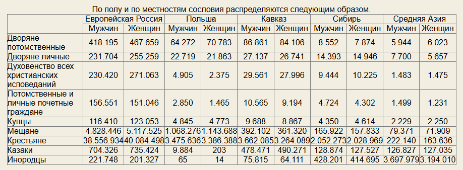 Автор: MorcelebЕсли обратиться к дореволюционной статистике (поскольку многие у нас не верят статистике советской), то население Российской Империи распределялось по сословиям (перепись 1897 года) следующим образом: