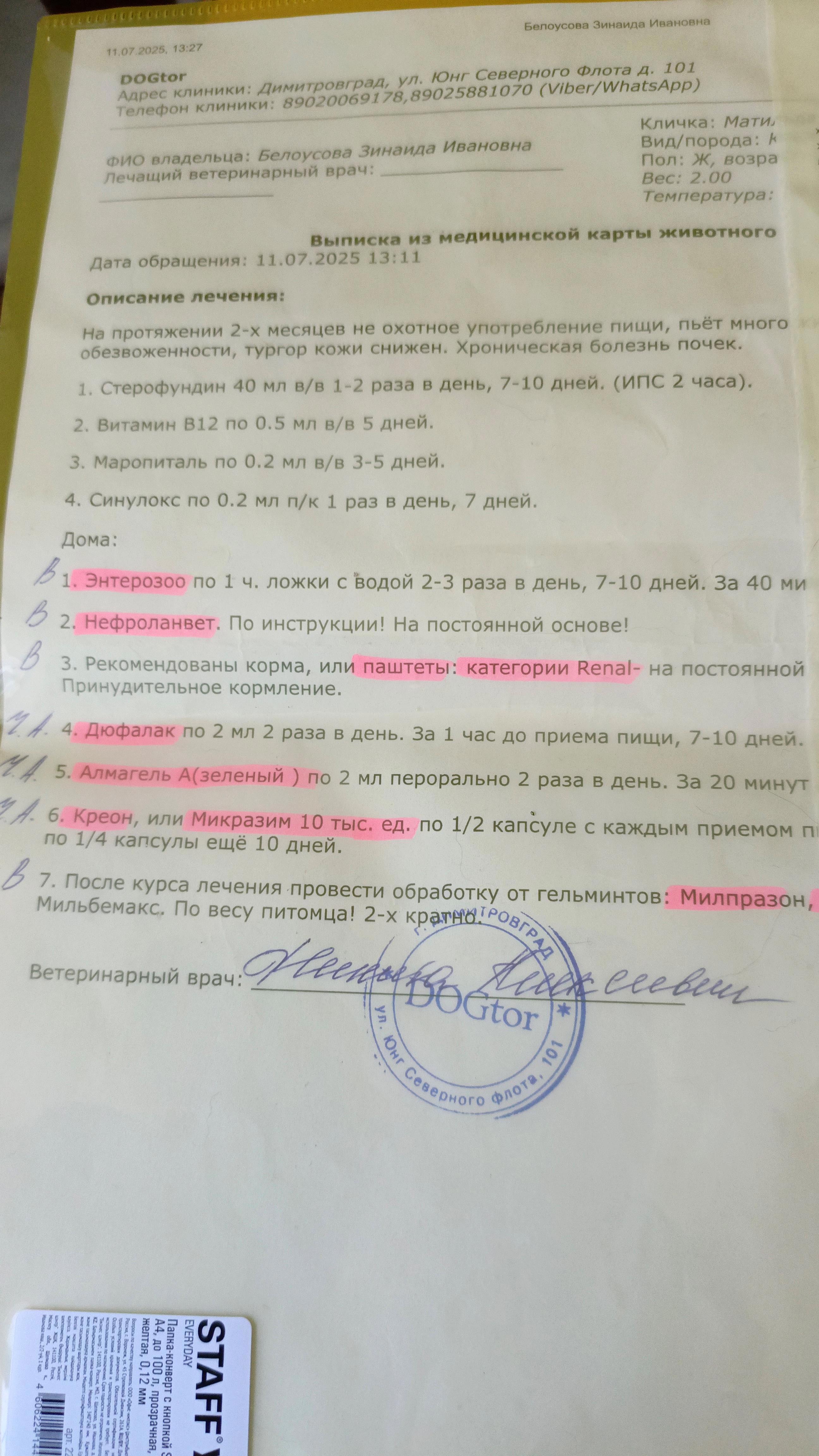 первичный осмотр анализы и лекарство вышло 5к и последующие капельницы и уколы 7 приемов по 1070 . Матильду отец подобрал на улице и стала членом семьи сердечко разрывается