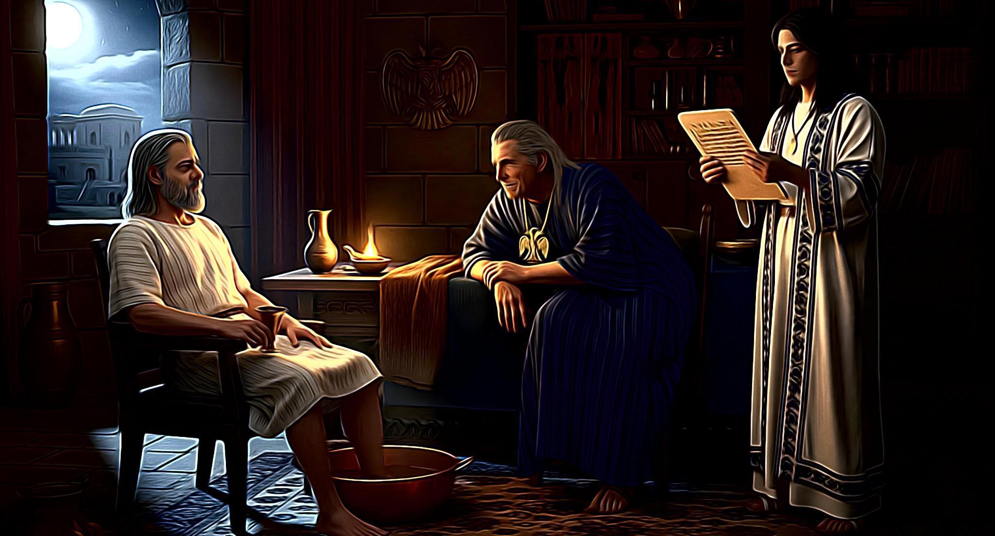 Хаттусили вернулся домой. Он болен, проблемы с ногами. Вот он отпаривает их в медном тазу, слушая Хастияра. Курунта читает донесение из западных земель. Табличка великовата, ну да ладно.