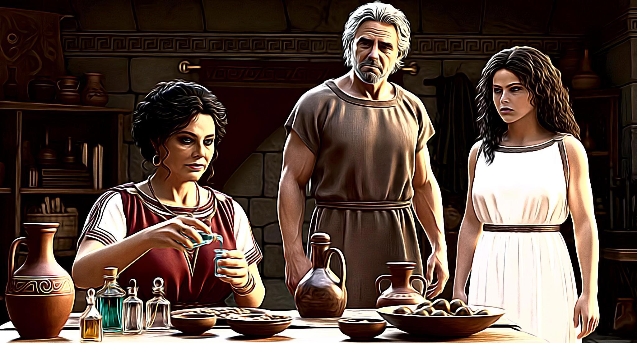 Амфитея занялась парфюмерным бизнесом. Сын Эсим - моряк. Пятнадцатилетняя Антиклея - на выданье, завидная невеста.