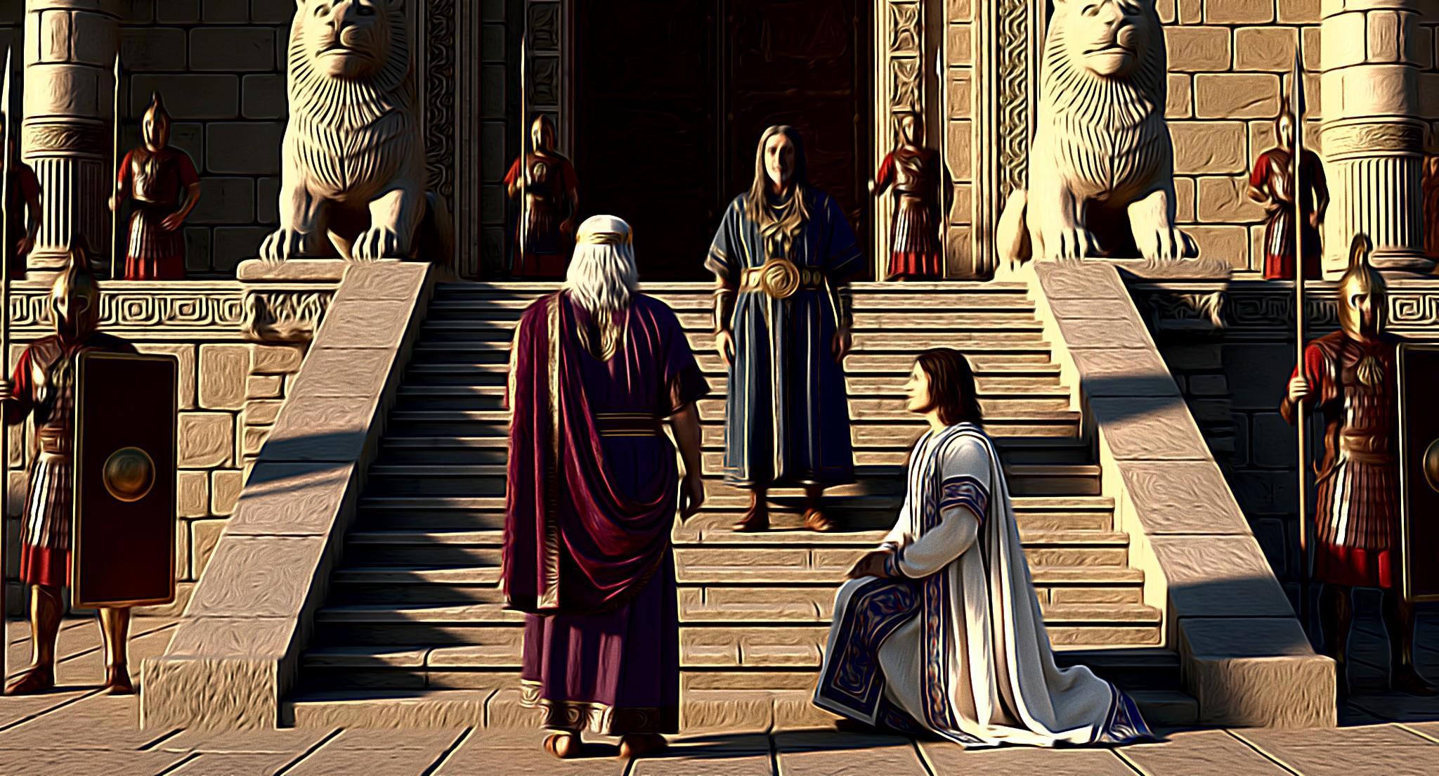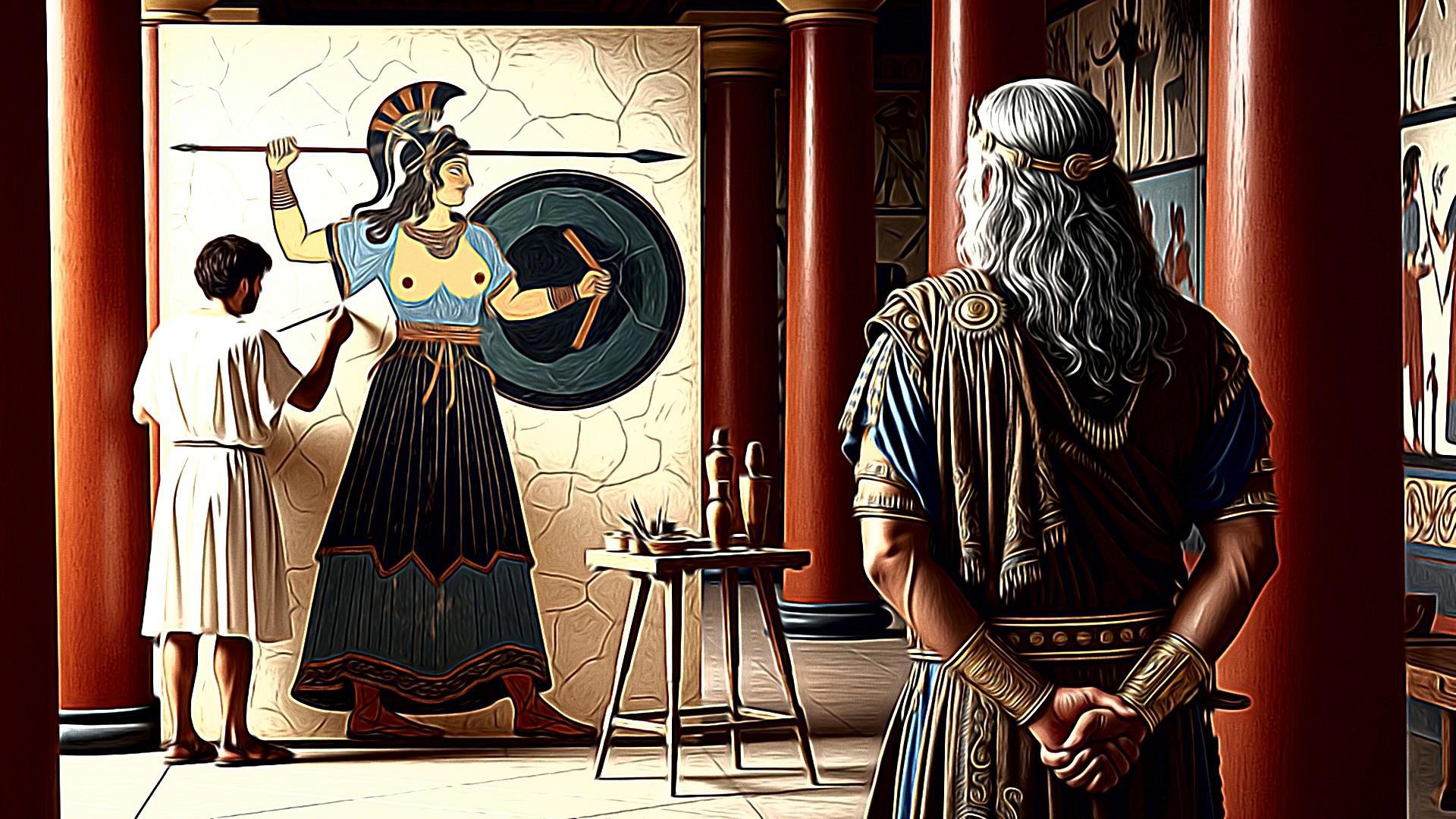 Сам ванакт Эврисфей уже весьма немолод и озабочен престолонаследием. У него всего один ребёнок - дочь Адмета. Он выдал её за Капрея, сына Пелопса (Атрей - его младший брат, Пелопс известен тем, что настрогал 100500 детей). Вот Эврисфей наблюдает за созданием портрета дочери в образе некоей воительницы. Мы все тут видим Владычицу Атану, но об этом лучше не говорить вслух.