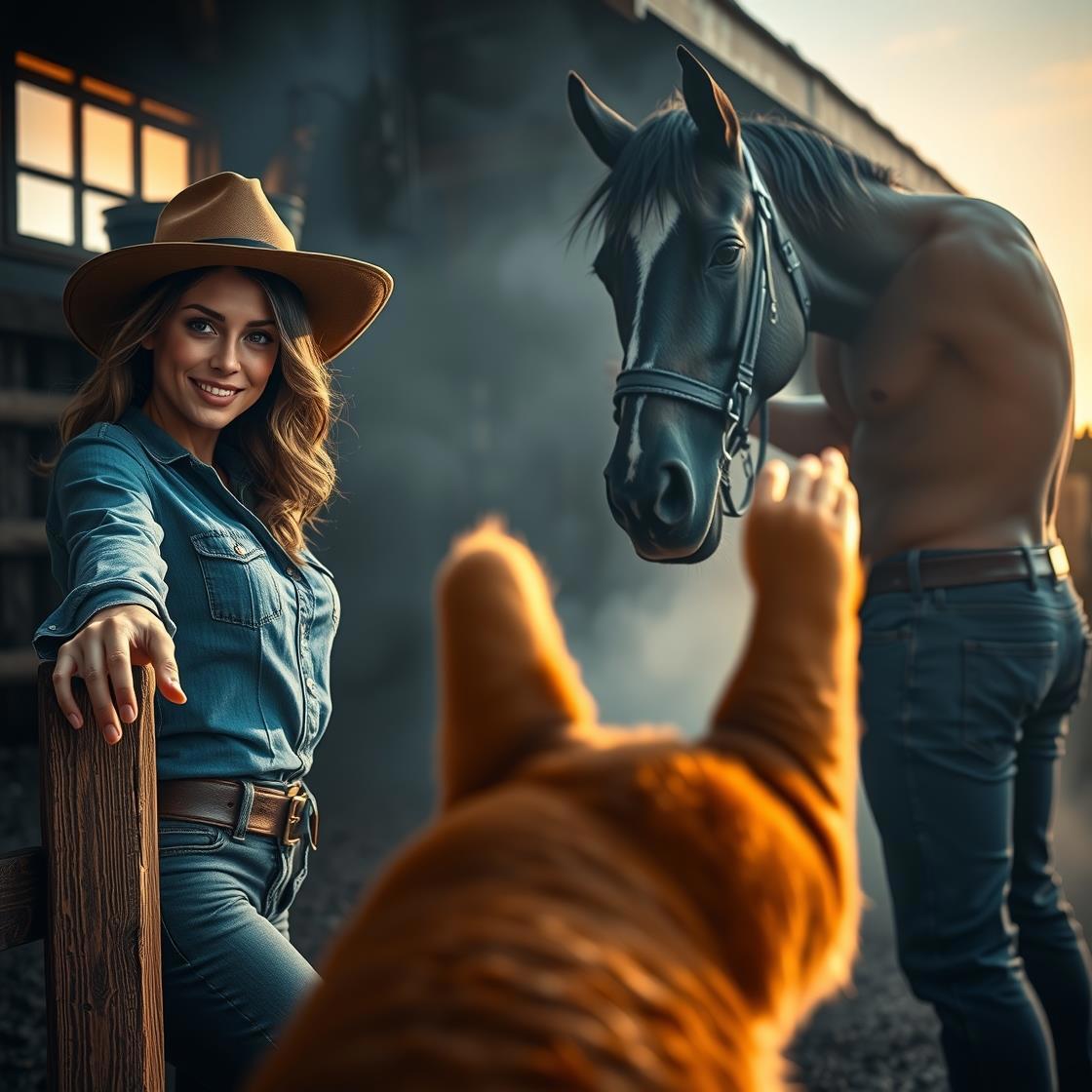 Неожиданная фантазия от нейросети, но передний план куда волшебнее. Мне показалось, или же кот весьма скептически оценивает потенциал ковбоя?