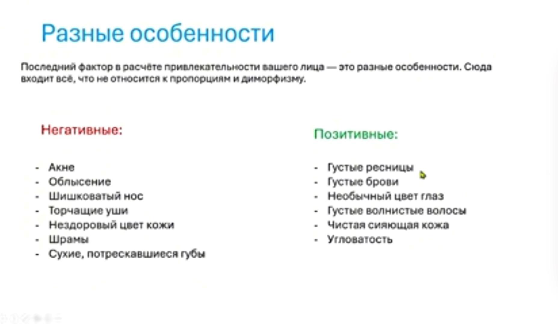 Он, в целом, утверждает, что само восприятие собственной привлекательности всегда завышено. Привлекательное мужское лицо — компактное, грубо говоря, не слишком длинное. И при всех прочих моментах, лёгкая небритость делает лицо более привлекательным, чем чисто выбритое. Вклад бороды в привлекательность зависит от типа лица — брутальное лицо борода делает ещё более брутальным, а женственному, в целом, на пользу. А наиболее привлекательными у мужчины кажутся волосы средней длины. При этом для оценки привлекательности селфи не годится — телефон искажает пропорции, нужен портрет с некоторого расстояния