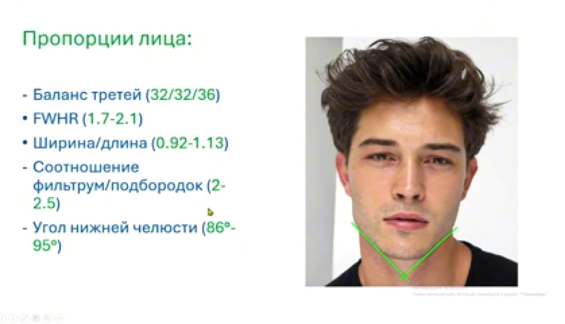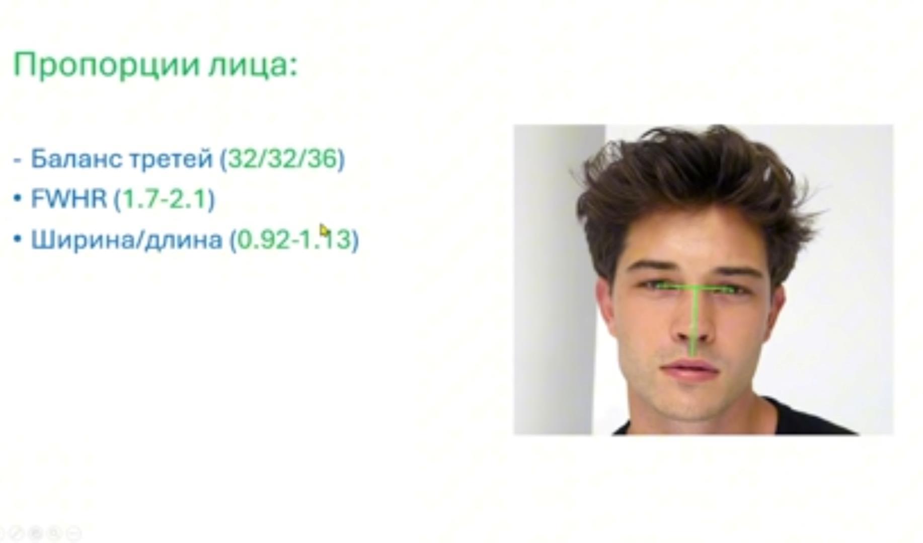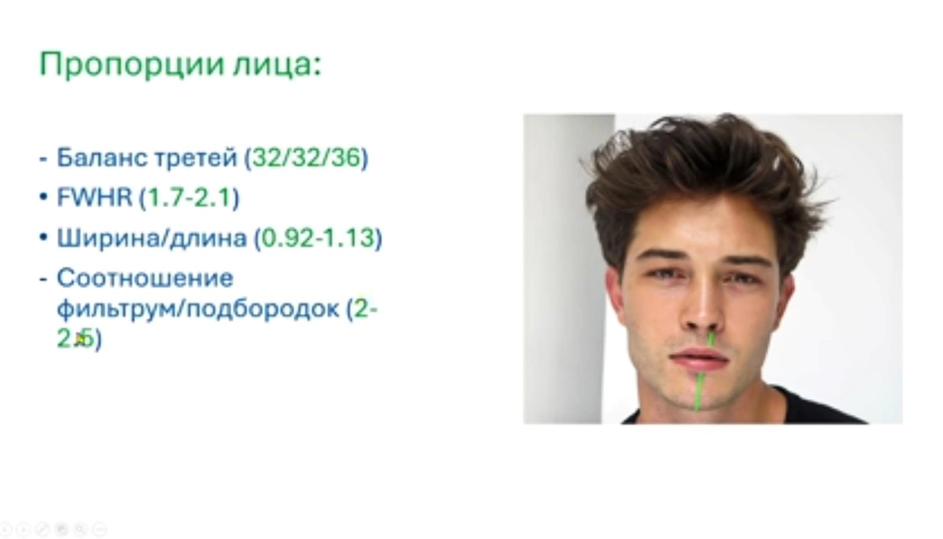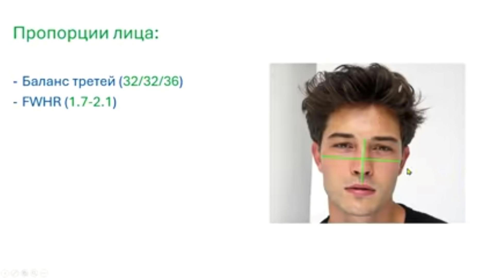 Соотношение ширины лица к длине (горизонтали к вертикали) , но рассматривается не все лицо, а см. картинку. Идеально: 1,9.