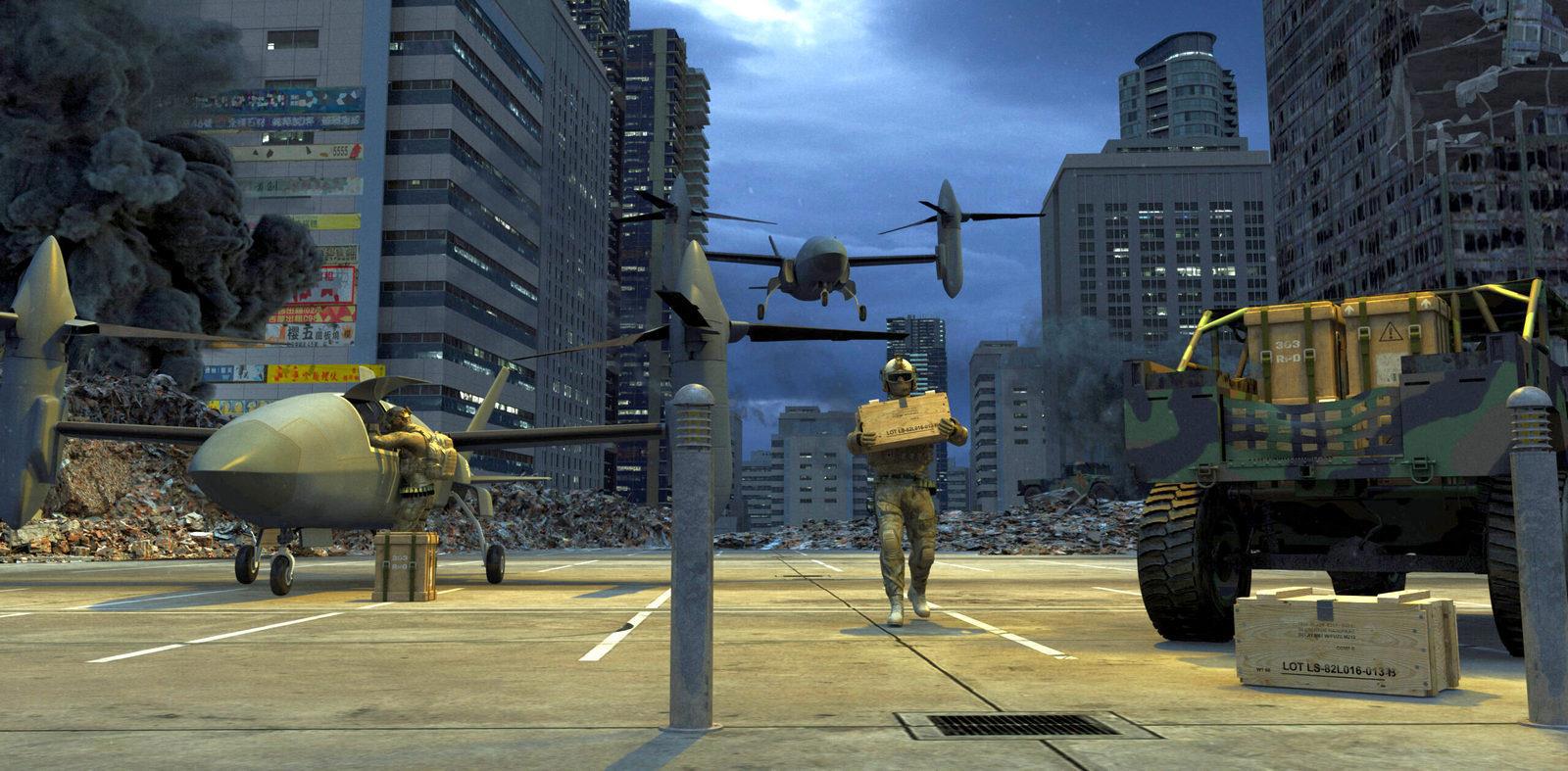 Аэродром будущего, на котором в рядок стоят грузовой «X-plane Bell», ударный «X-plane Bell» и дрон «X-plane Bell». Фоном служат горы и небо как символ величия и недосягаемости изделий компании «Bell». Позади фантастических «X-plane Bell» виден грузовик «Геркулес», стоящий на вооружении сейчас и конвертопланы «Осплей», славящиеся своей неподражаемой… аварийностью.