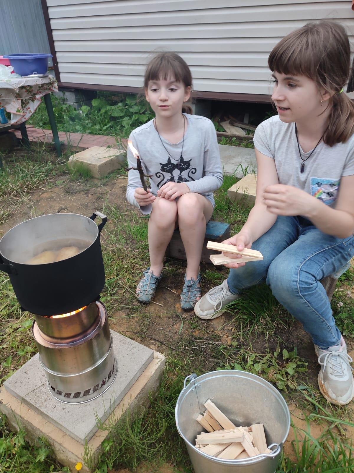 Словом, рекомендую эту фиговинку, хорошая вещь. Превзошла мои ожидания. Удивительно, насколько мало она потребляет дров, причем не таких качественных, как на фото (это я для внучек специально приготовил), а мелких веточек, сосновых шишек и прочей ерунды, каковую и топливом-то назвать неловко.