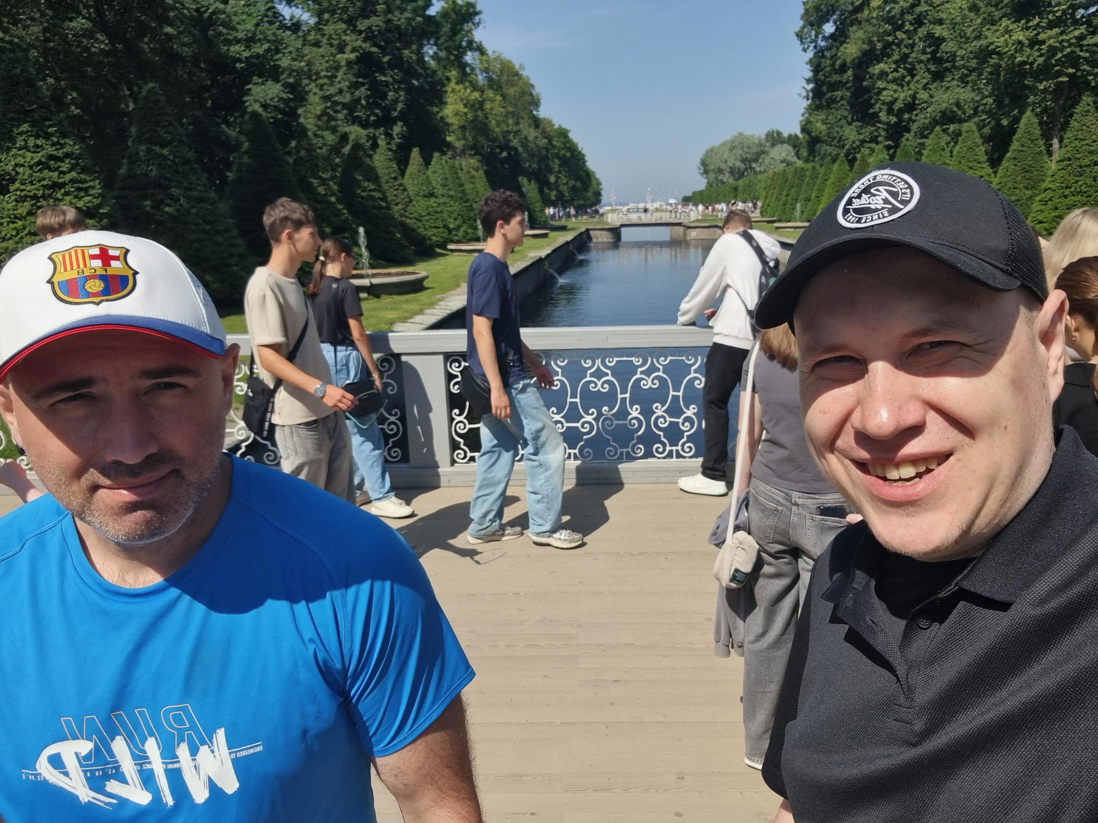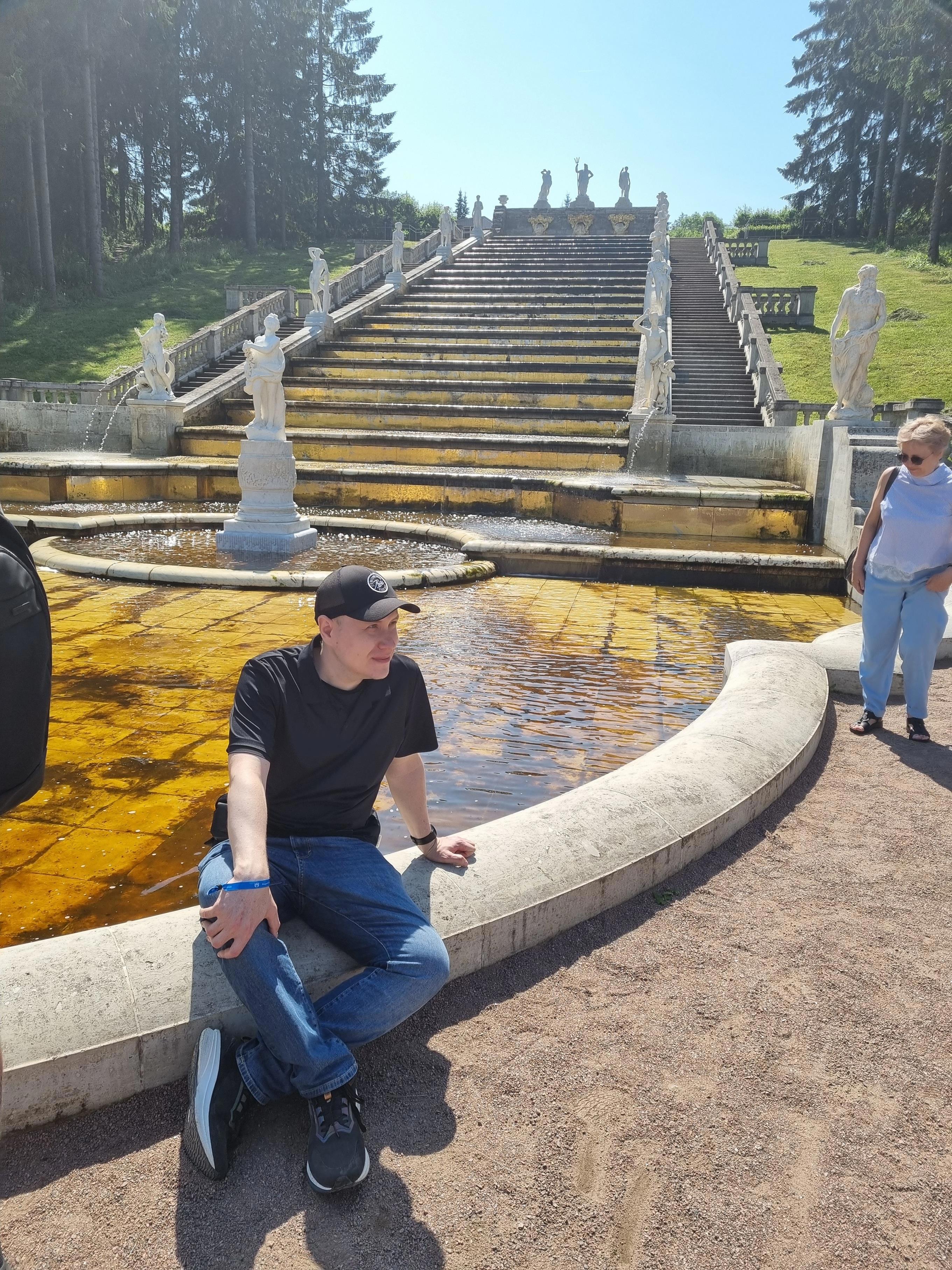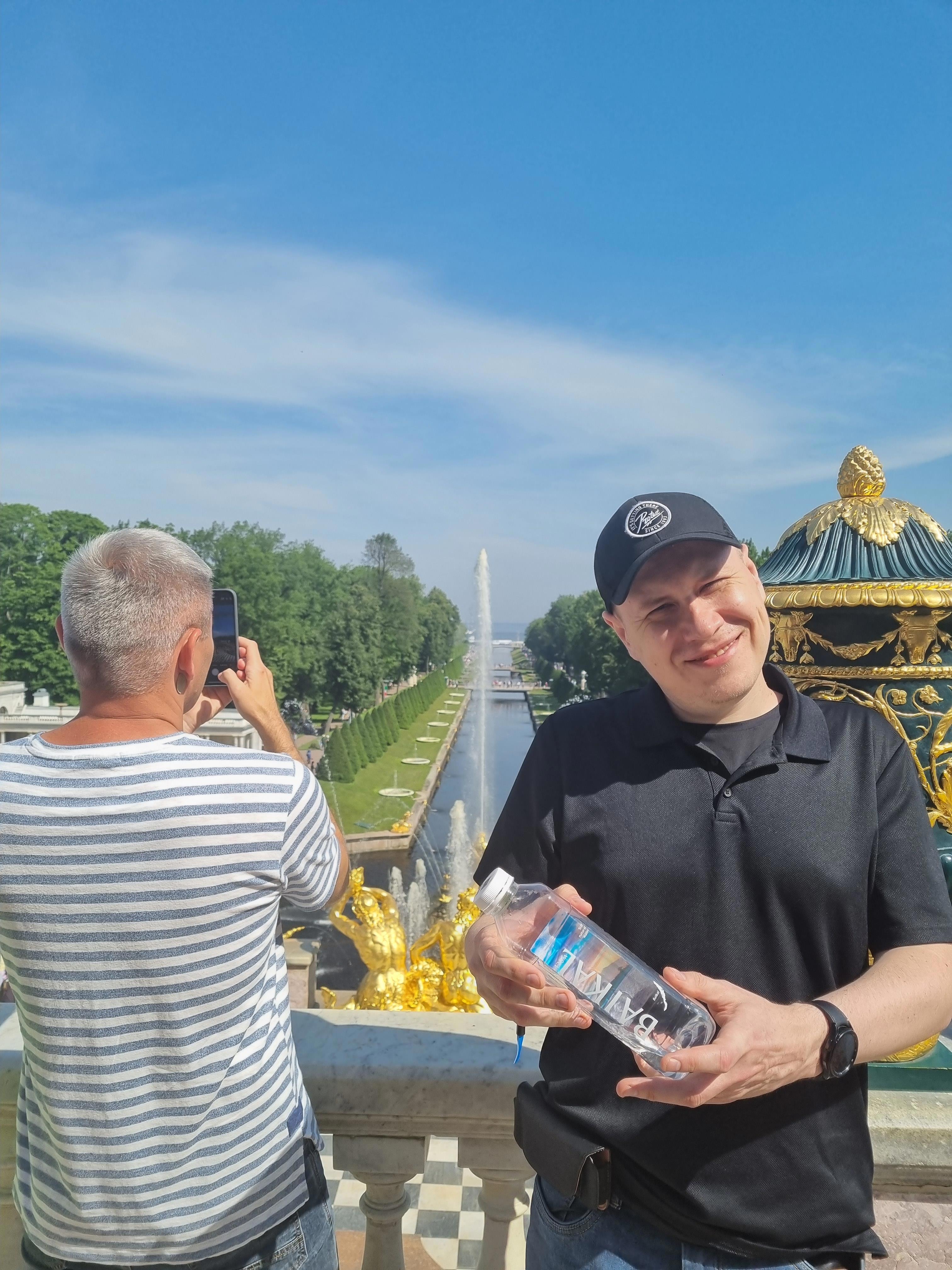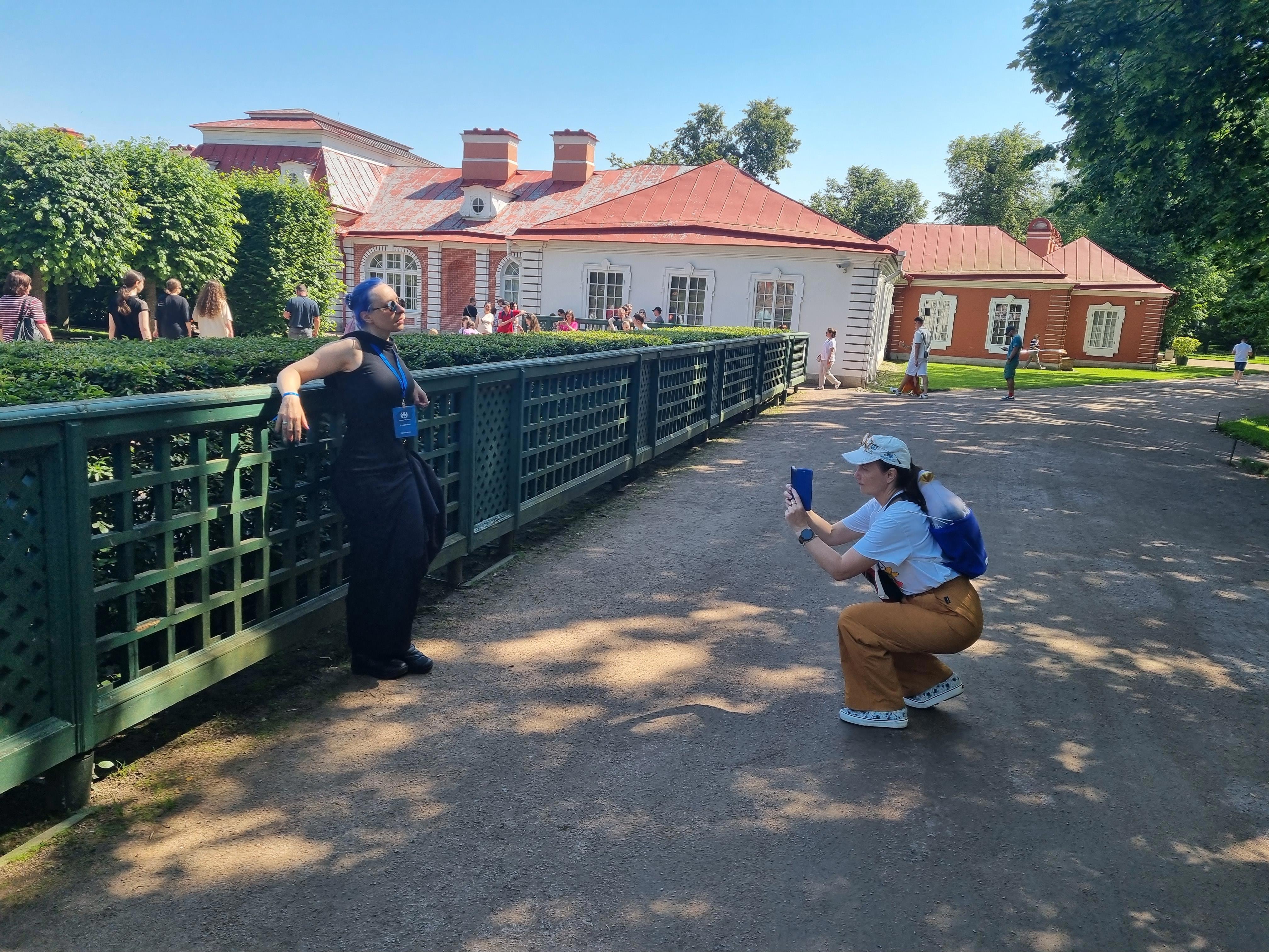 В какой-то момент мы дошли до аллеи с шутихами - фонтанами, которые некогда включались в рандомное время, чтобы замочить гуляющих придворных. Тут из ниоткуда вынырнул АТ-шный фотограф и устроил нам фотосессию.