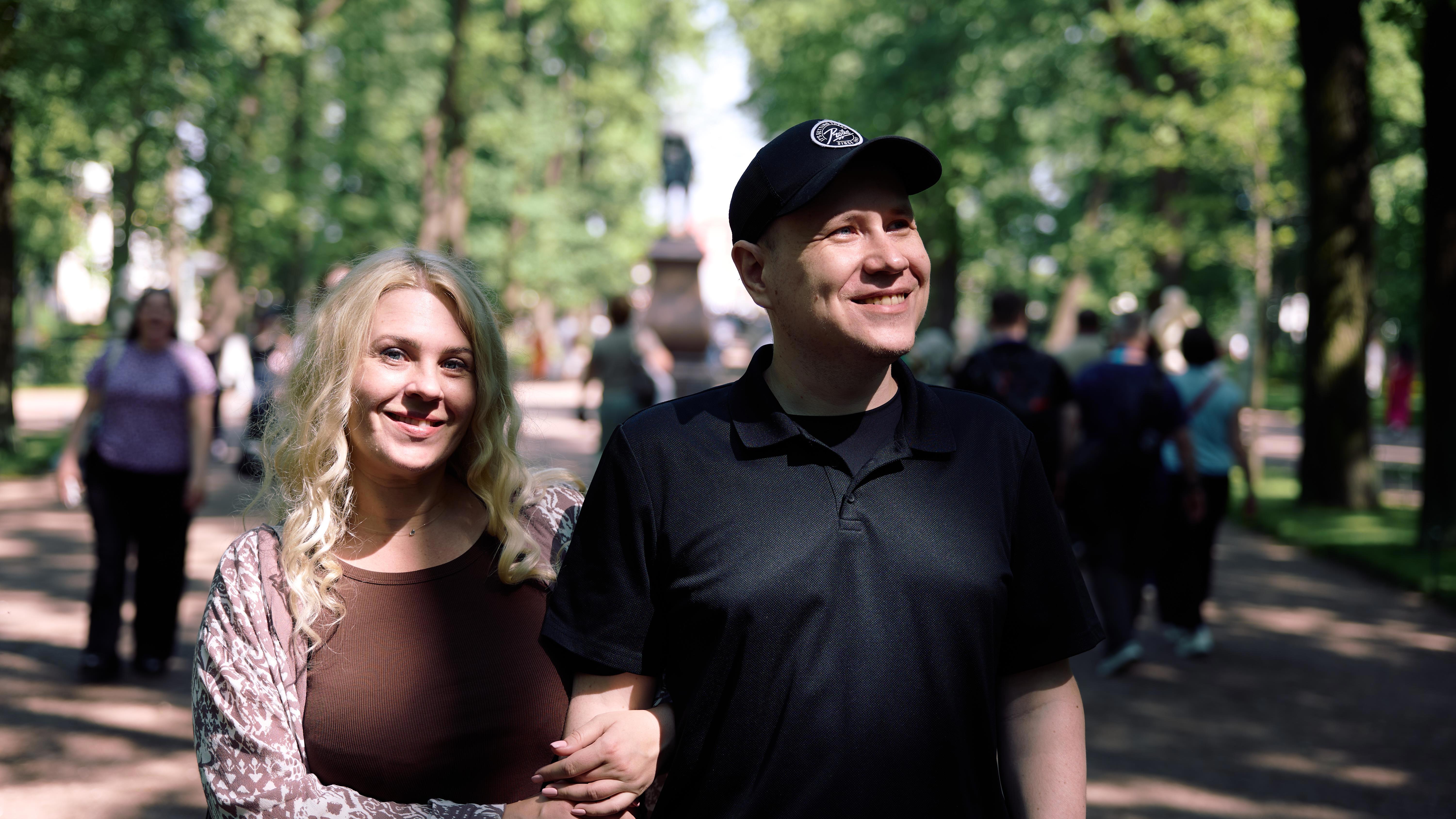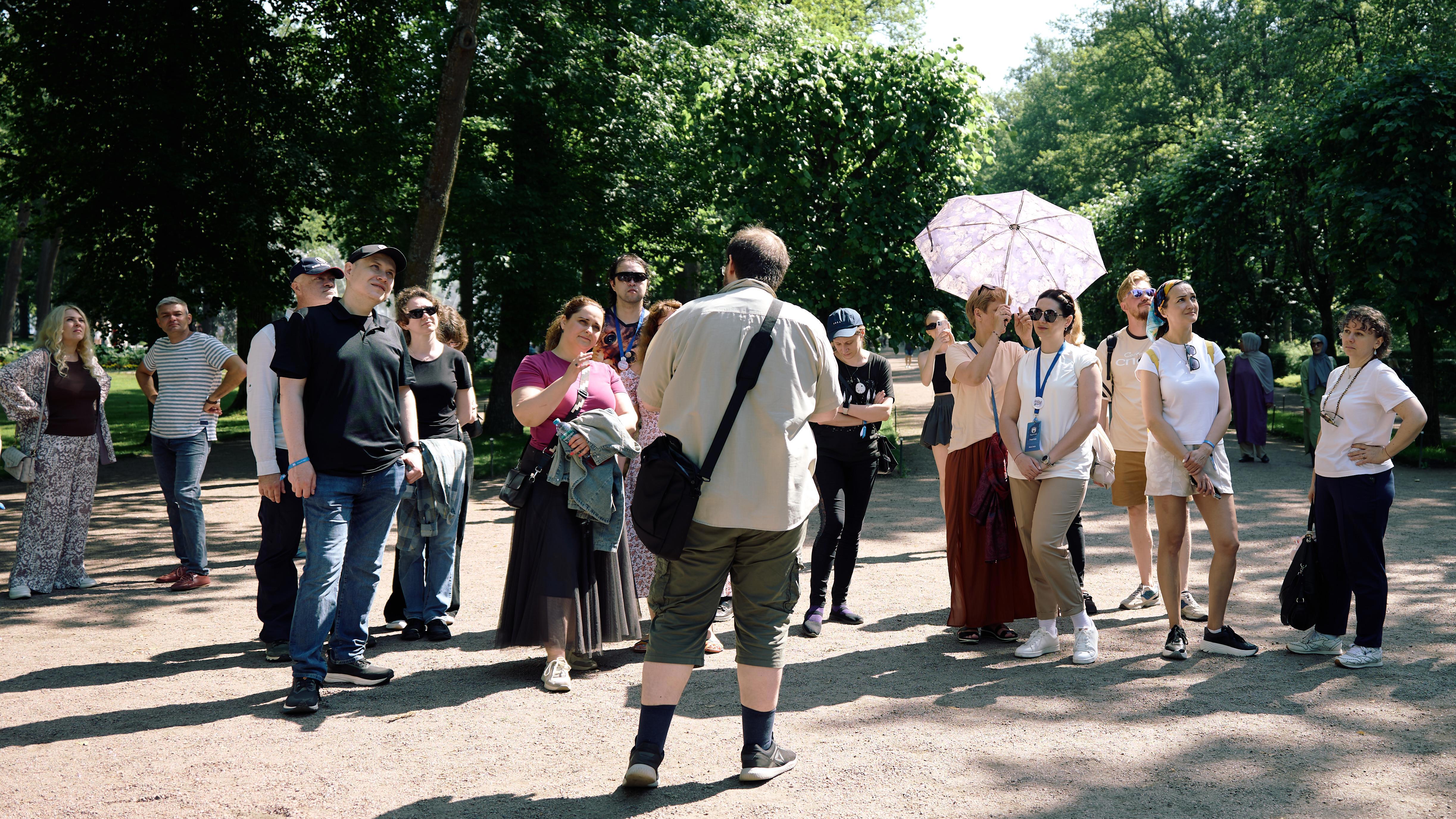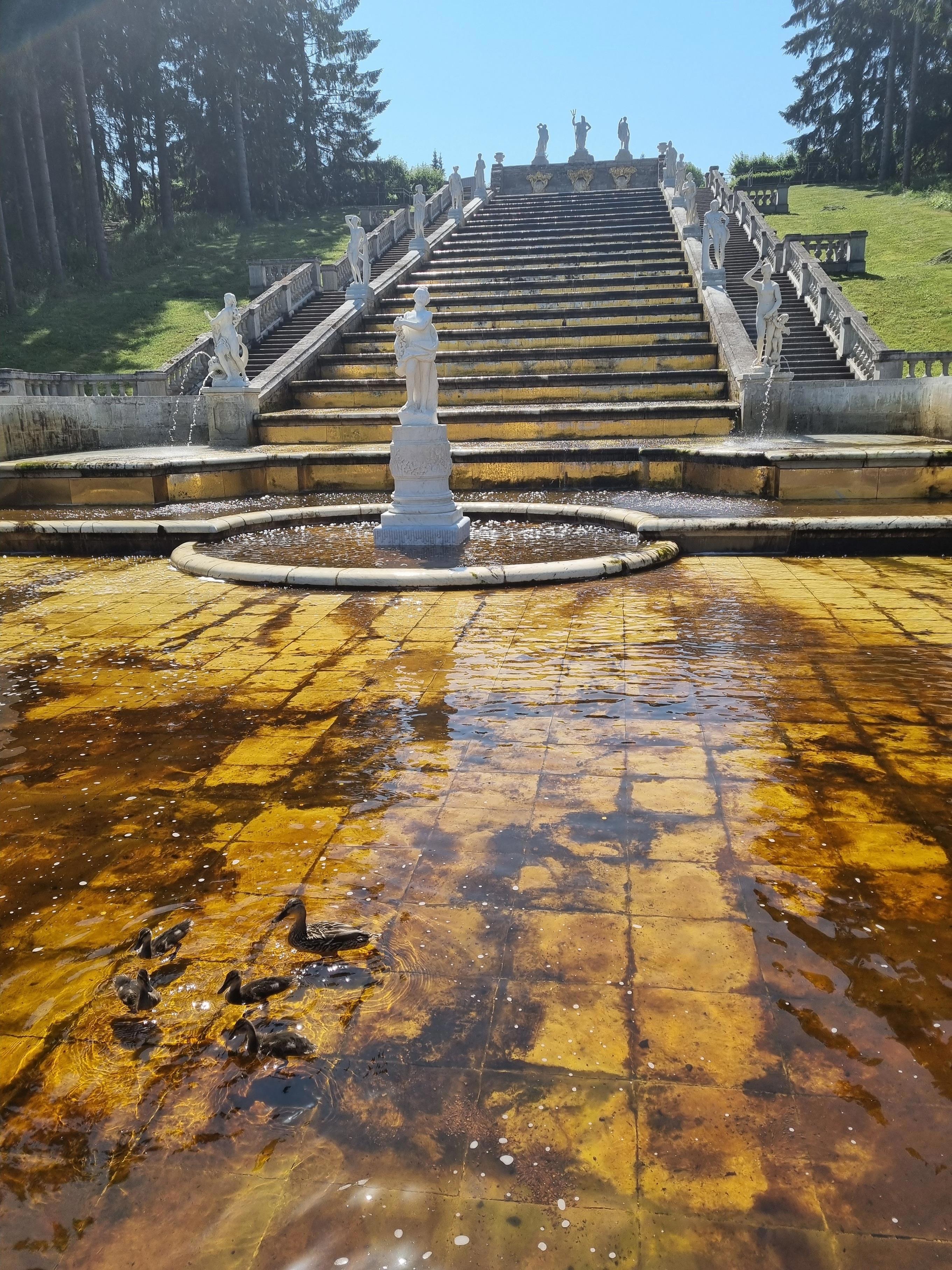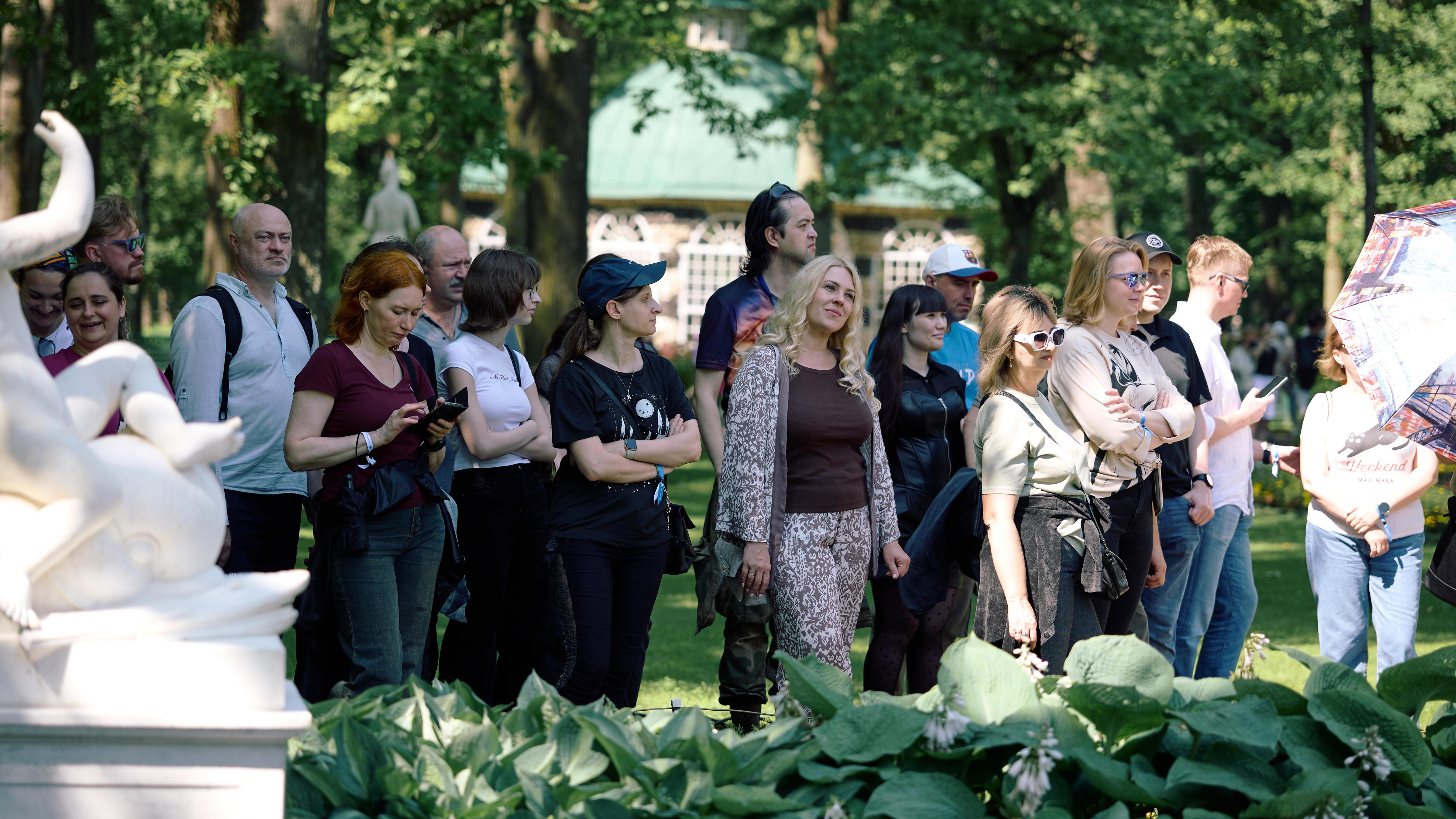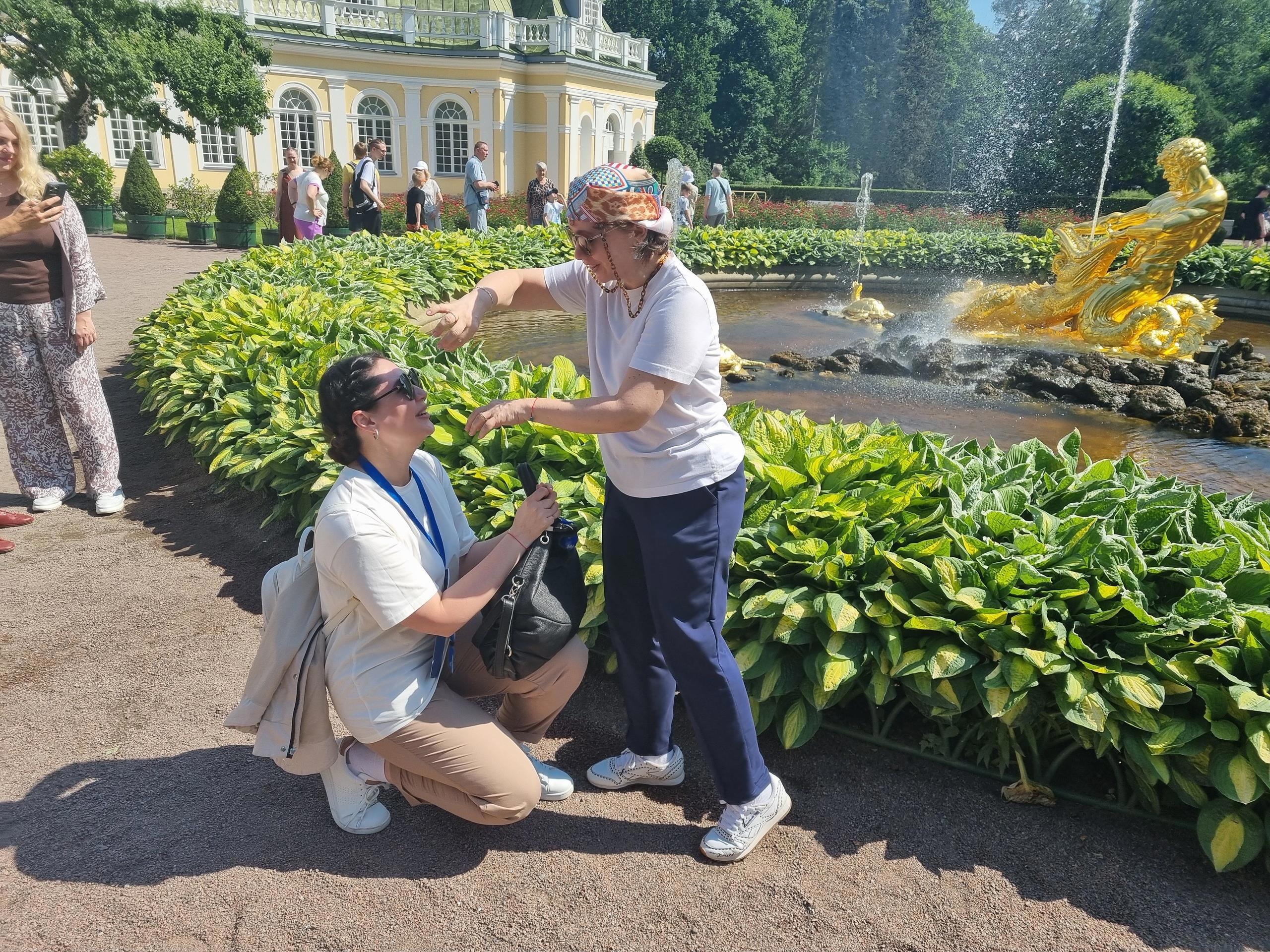 В какой-то момент мы дошли до аллеи с шутихами - фонтанами, которые некогда включались в рандомное время, чтобы замочить гуляющих придворных. Тут из ниоткуда вынырнул АТ-шный фотограф и устроил нам фотосессию.