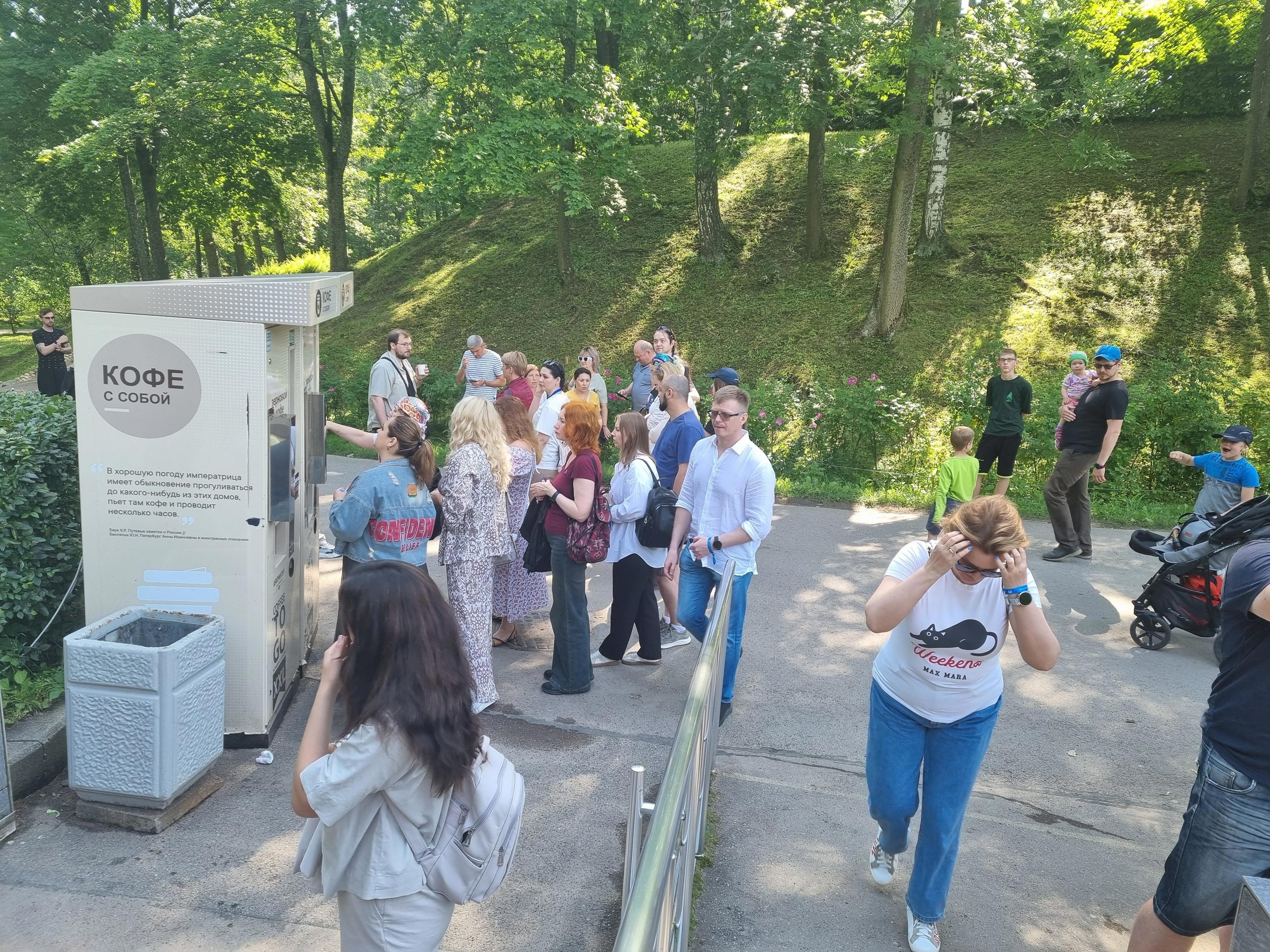 Затем нас впустили внутрь парка, довели до стратегического бункера, с туалетами и кофейным автоматом. К последнему быстро организовалась очередь. И я тоже купил кофе - последним, поэтому пришлось догонять группу бегом.