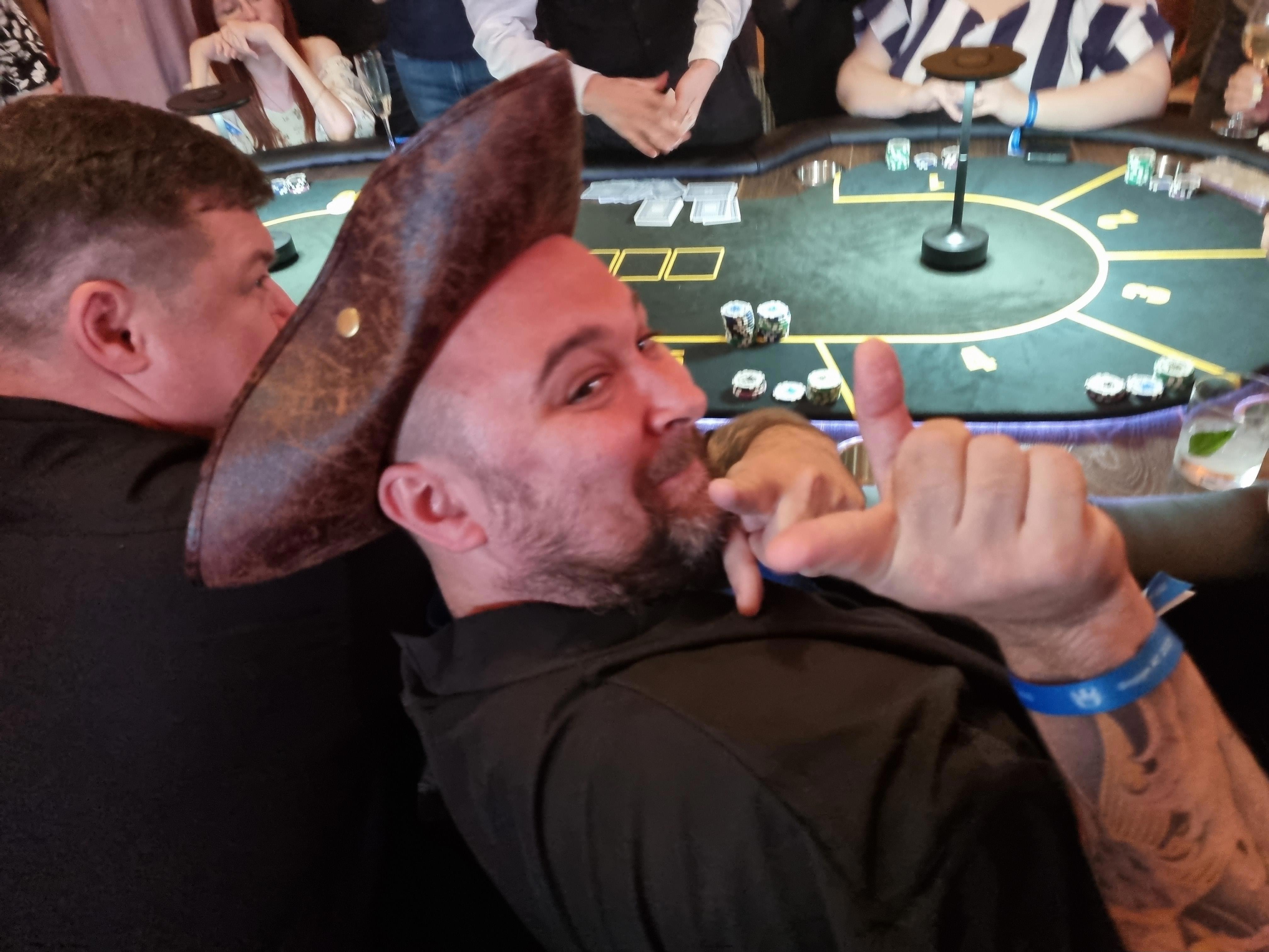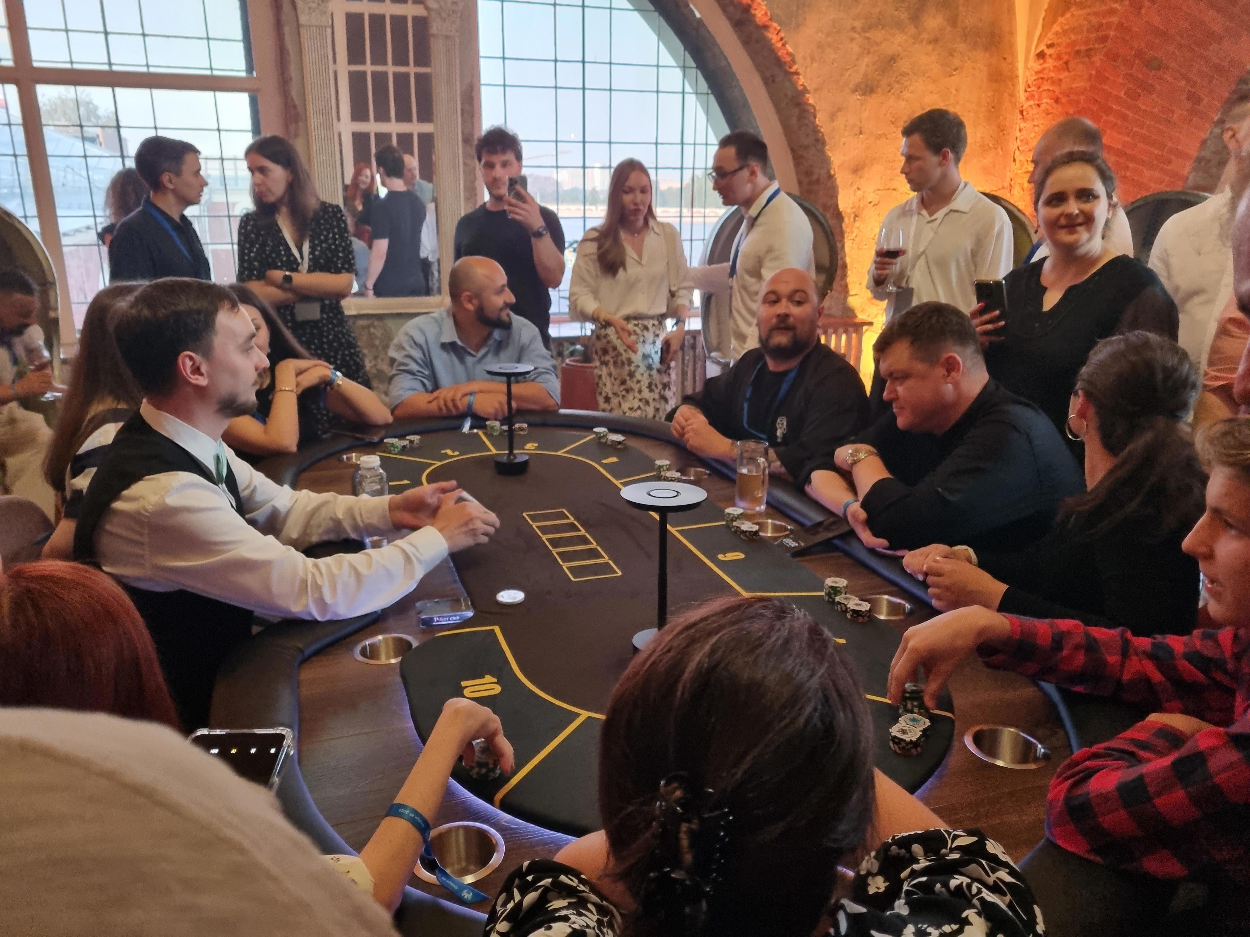 Играли просто на фишки, без денег, само собой. Но с крупье и прочими прелестями. Я сыграл одну партию (продул, не добрав стрит) и ушел, потому что была техническая пауза - и больше к нему особо не возвращался. Тут же, к слову, позже был и кальян. И немалая часть авторов тусовались вокруг покерного стола :)
