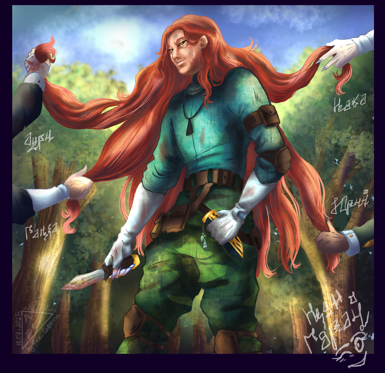 Покончив с делом, Лусиа отрапортовал другу о готовности. Шуроку глубоко втянул воздух, встал с земли и проверил прочность закрепленного. Переплел локоны в тугой нижний хвост. Нэкома не дюжим удивлением сопроводила мощную алую копну, спускавшуюся аж до бедер парня.