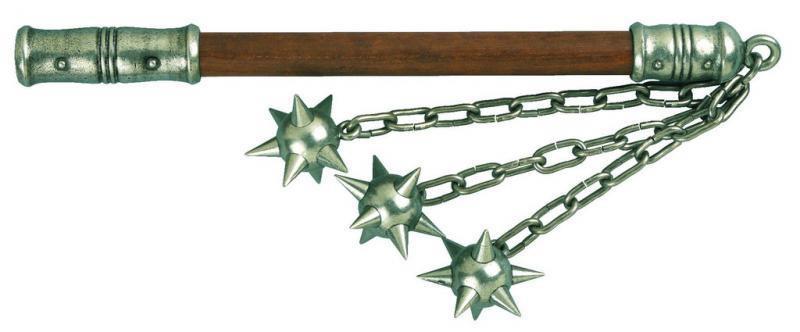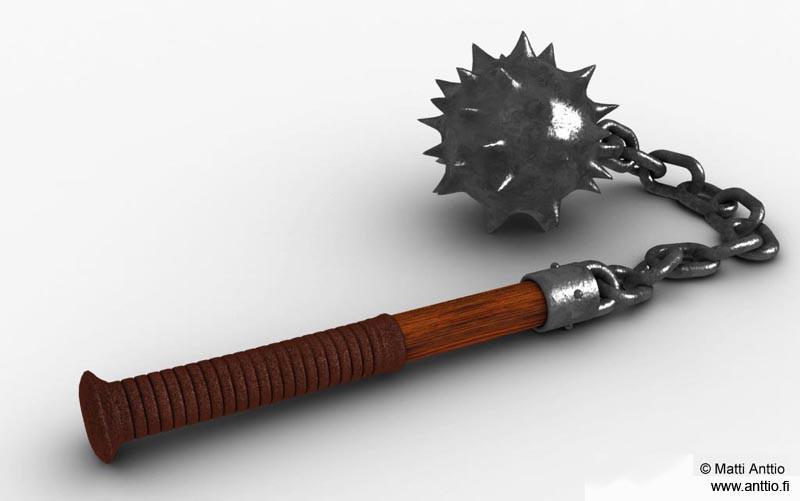 Но поговорим еще об одном виде гибкого оружия. Это кистень. Который существует в трех основных формах: грузик на веревке/ремне, плеть с гирькой на конце и, наконец, разновидность цепа с более компактным ударным элементом, обычно металлическим. Первая разновидность не является боевым оружием. Последнюю разновидность часто именуют моргенштерном. Появившейся из одноимённой дубины, усаженной длинными шипами. Когда кто-то перенасадил боевой цеп с ремня на цепь, и снабдил его круглой боевой частью с шипами, в чью-то умную голову пришла мысль о сходстве. И это оружие назвали цепным моргенштерном, по-немецки Kettelnmorgenstern.
