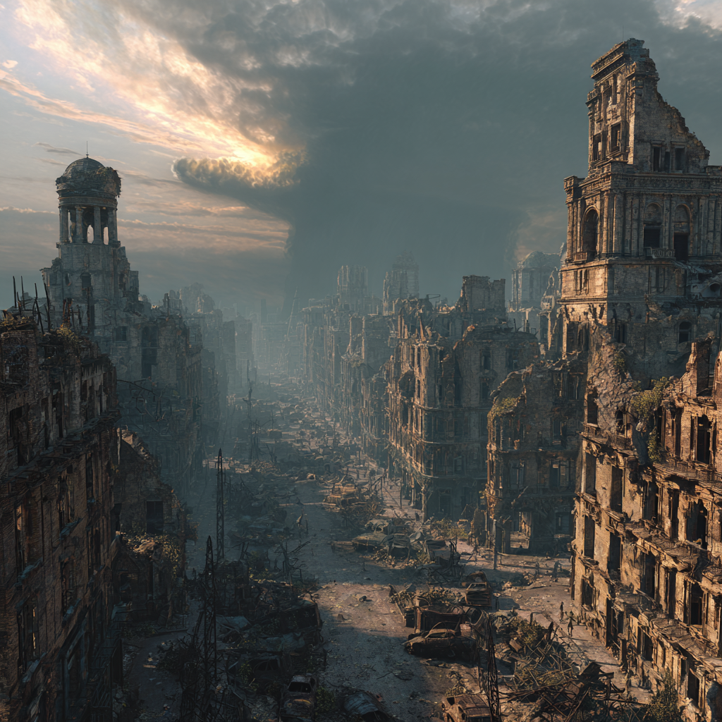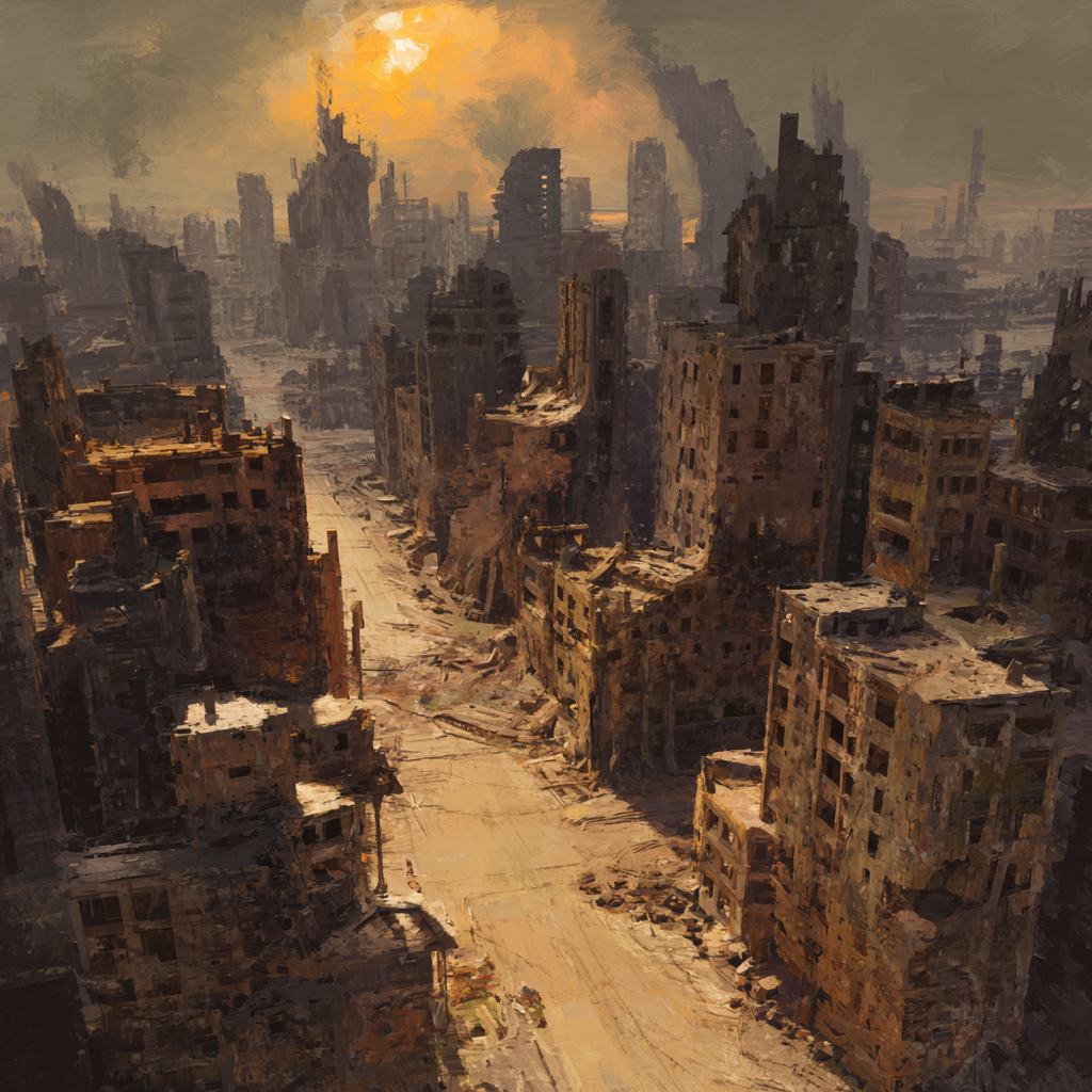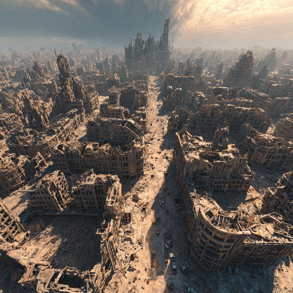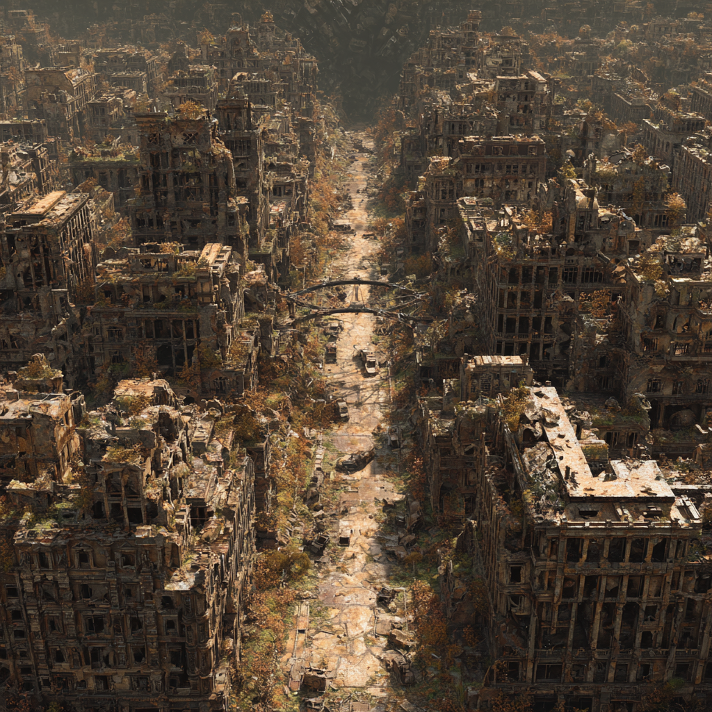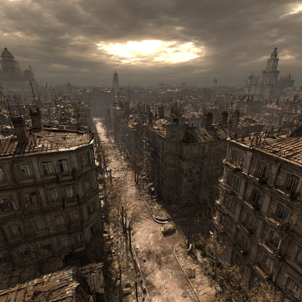 Бесконечное море мертвых зданий, остовы мостов, просевшие башни. Улицы, заросшие сухим бурьяном. Дома без крыш. Разбившиеся стёкла. Мёртвые перекрёстки.