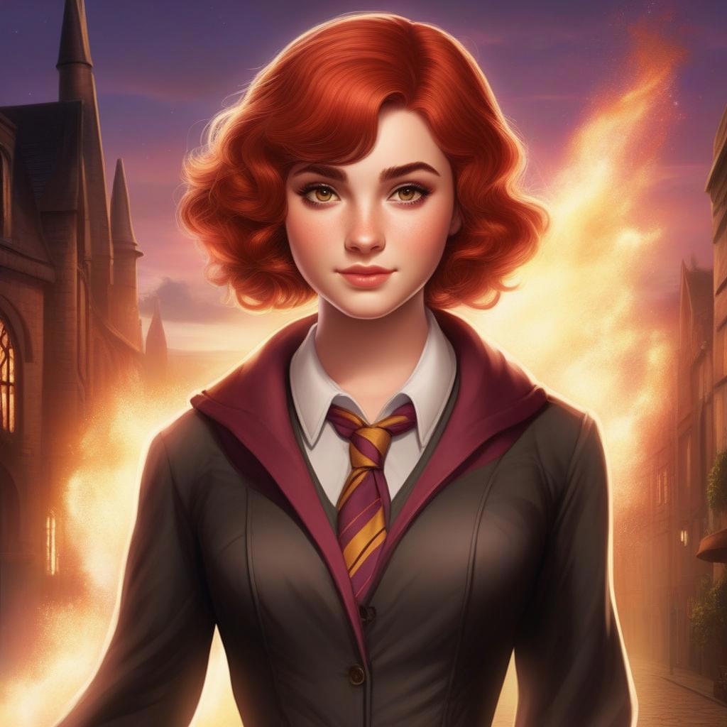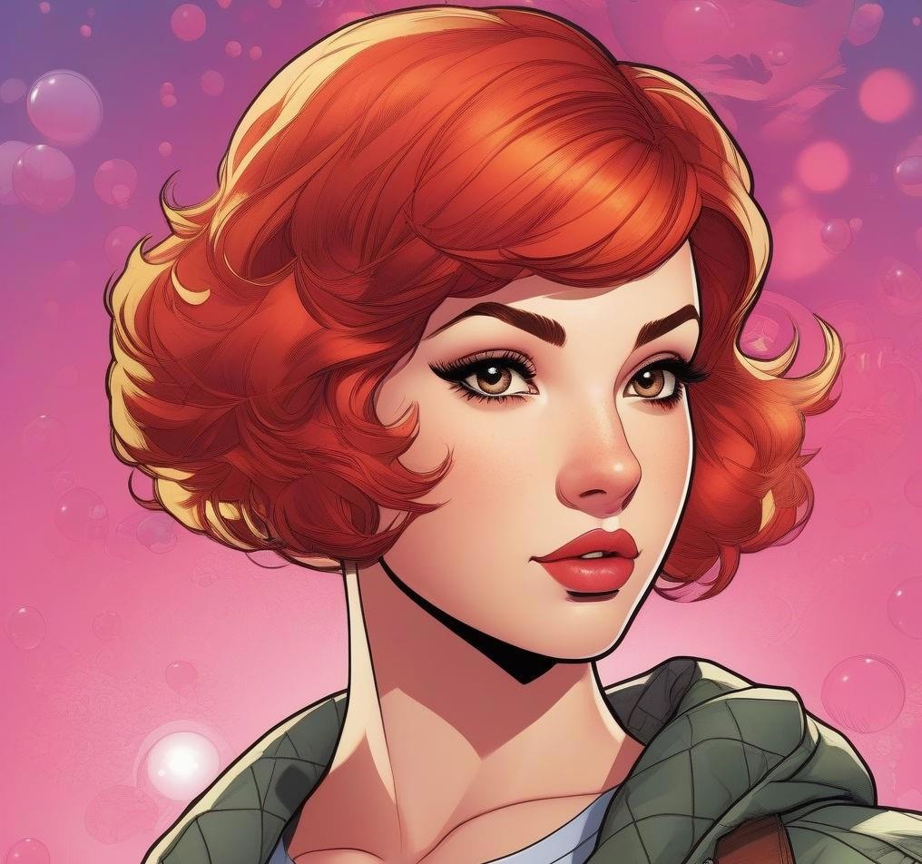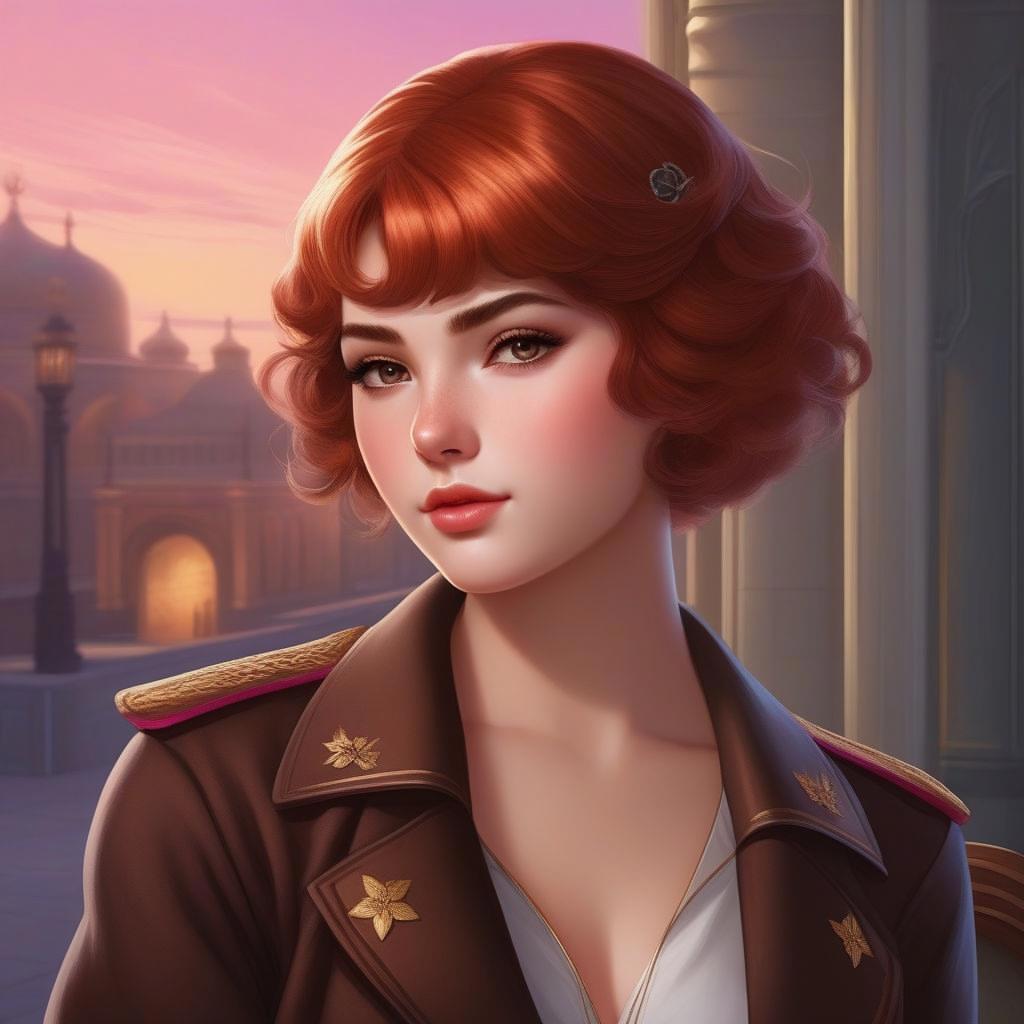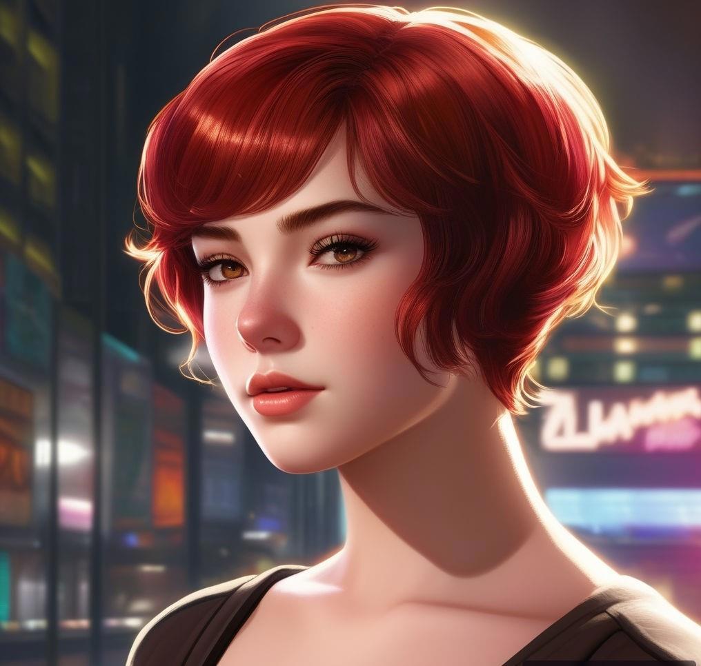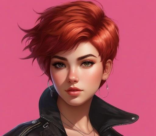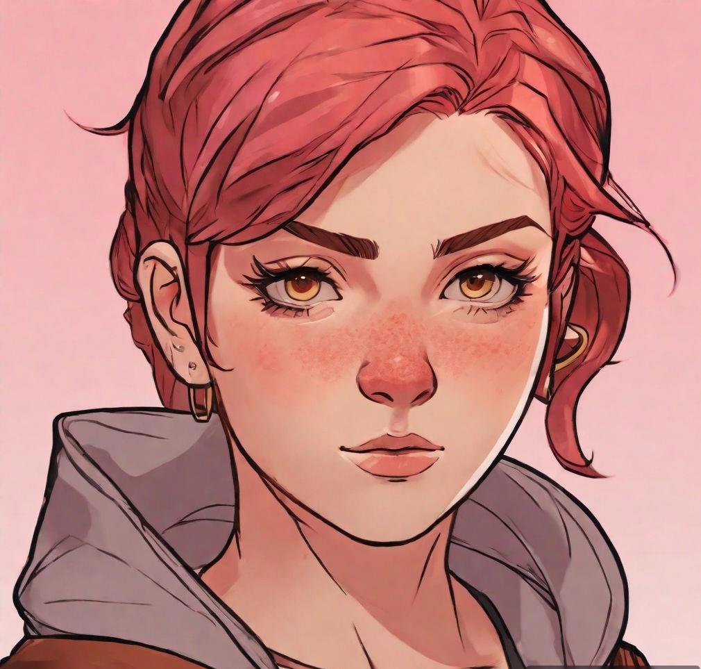 Девятнадцатилетняя коренастая девушка с розовой кожей, с красно-коричневыми глазами, вздернутым носом и огненными короткими волосами, которые стоят торчком