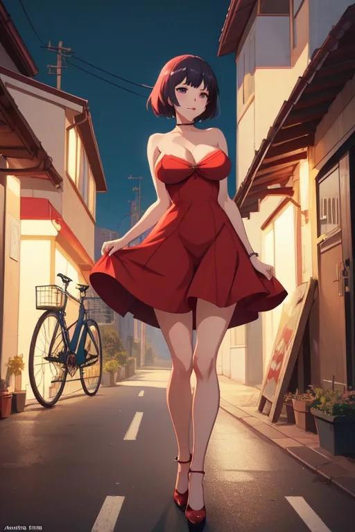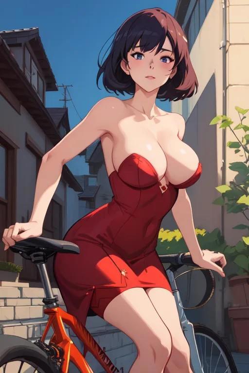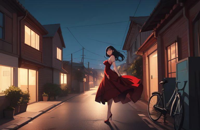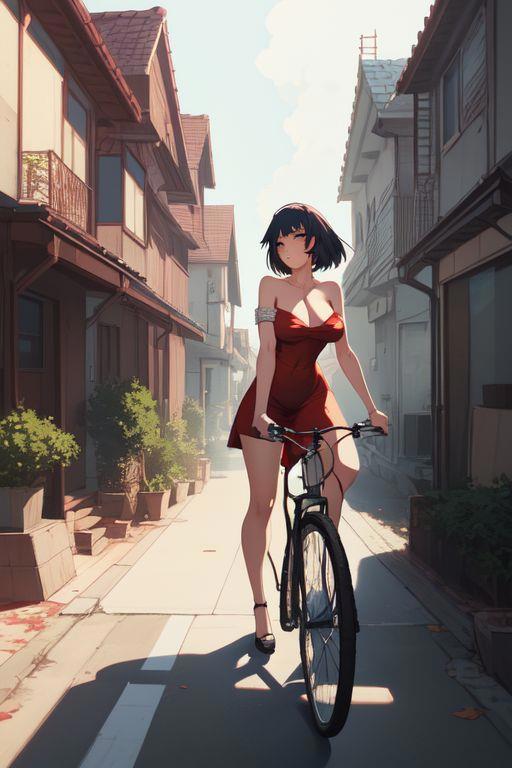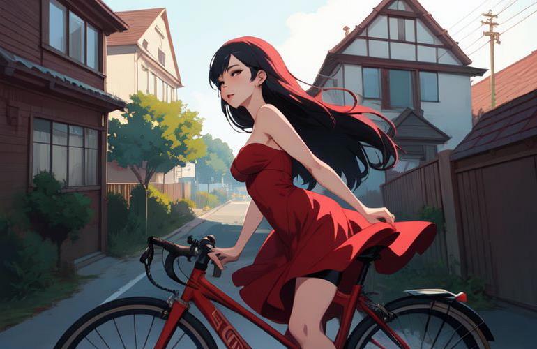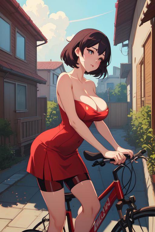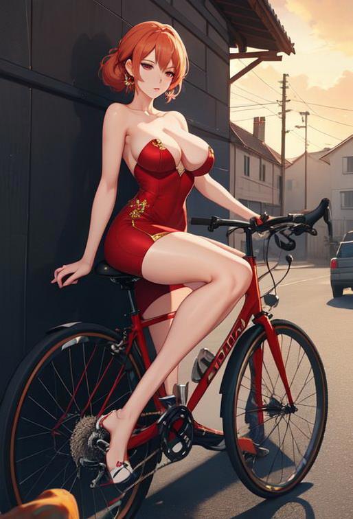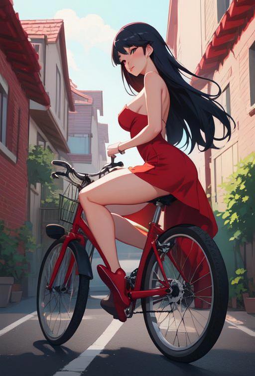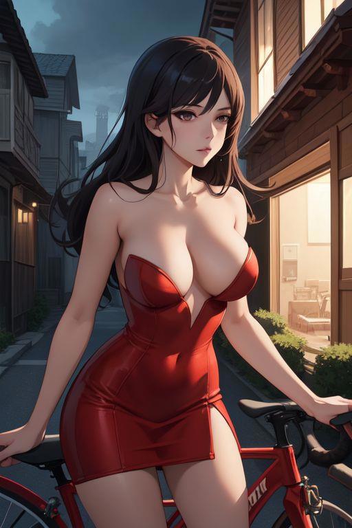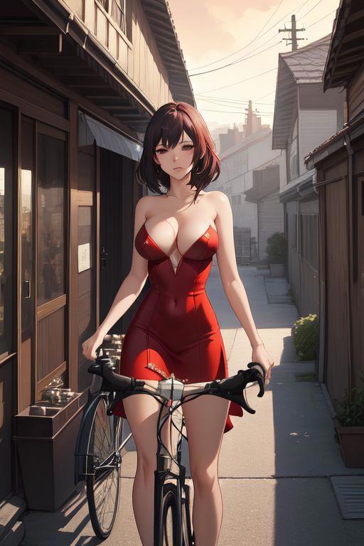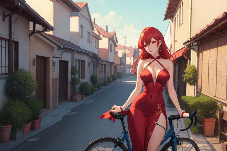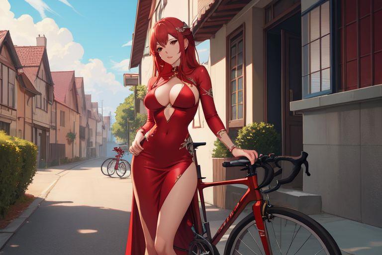 1) girl, sexy red dress, erotic, street, house behind, bicycle