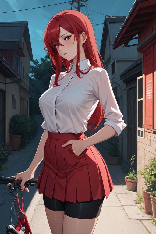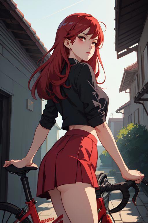 3) girl, sexy red skirt, erotic, naked breast, red hair, street, house behind, bicycle