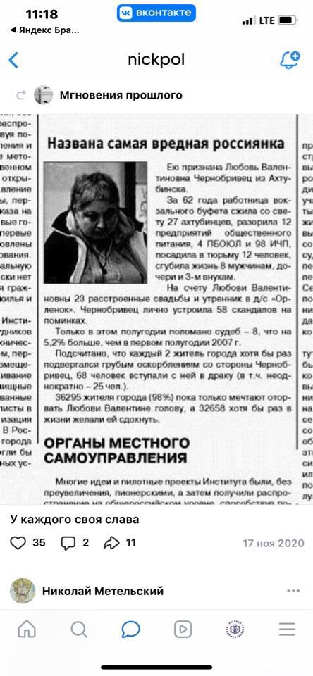 За 62 года работница вокзального буфета сжила со свету 27 ахтубинцев, разорила 12 предприятий общественного питания, 4 ПБОЮЛ и 98 ИЧП, посадила в тюрьму 12 человек, сгубила жизнь 8 мужчинам, дочери и 3-м внукам.