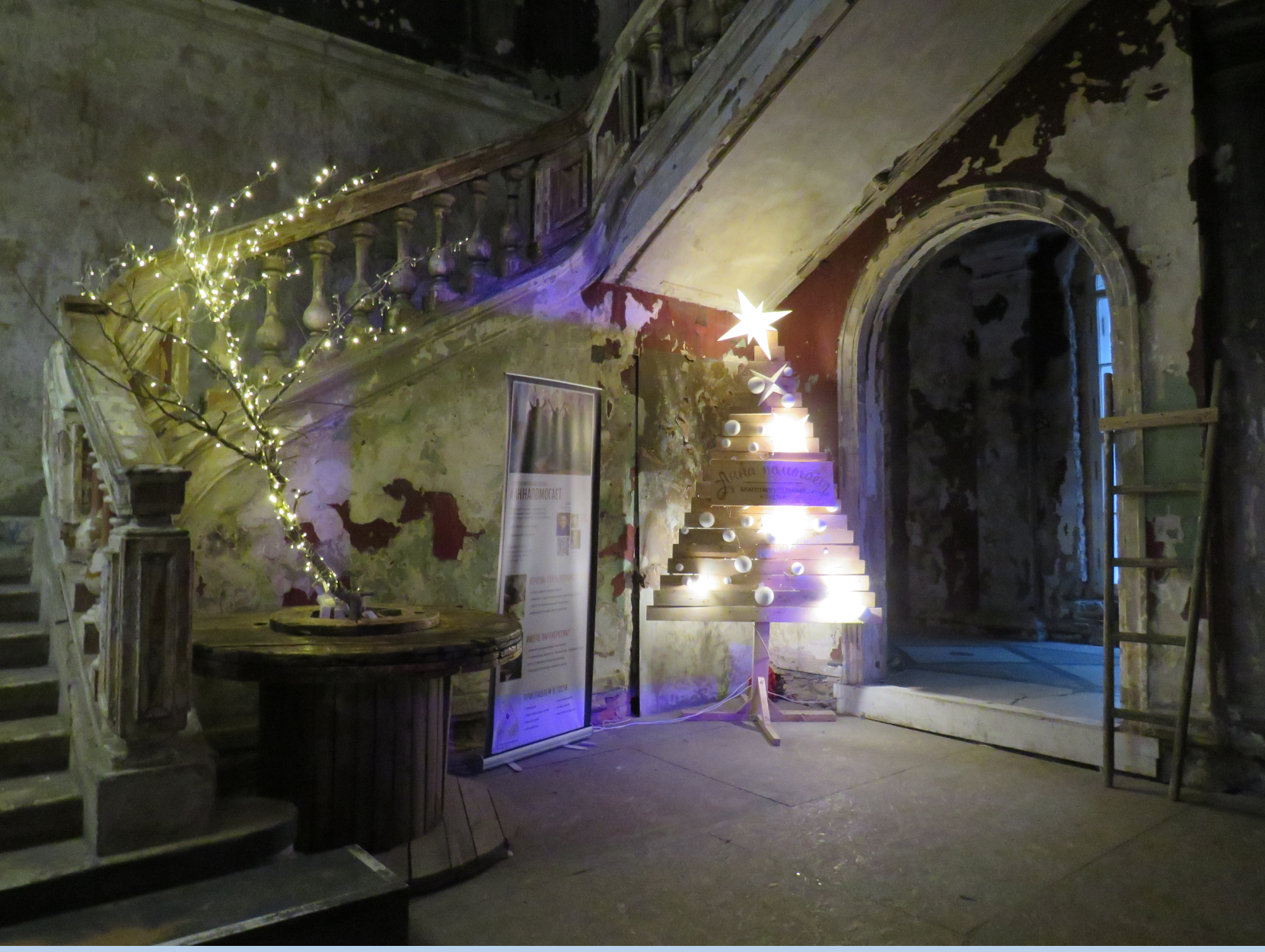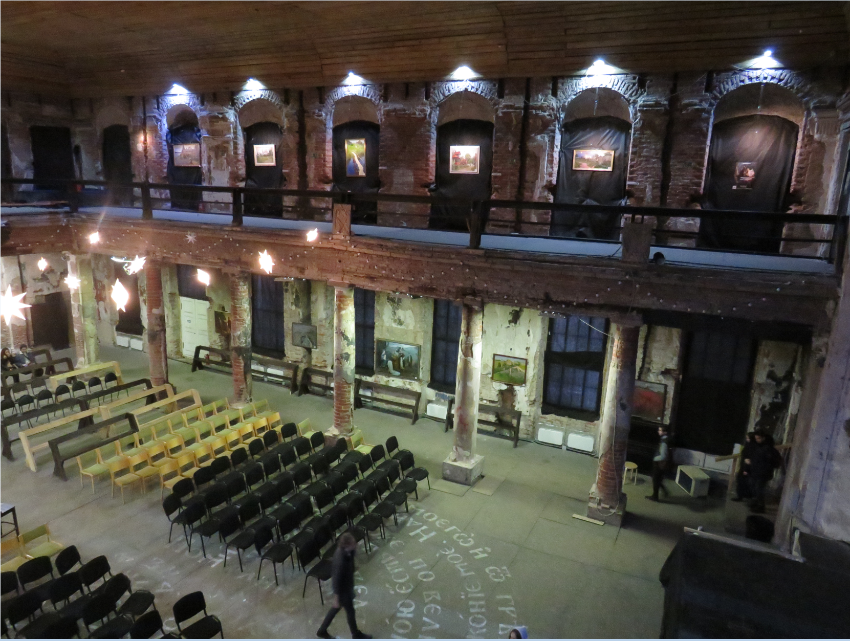 Остатки паркета застелены прессованным картоном, наружу торчат огрызки кирпичей. На колоннах остатки штукатурки под мрамор.