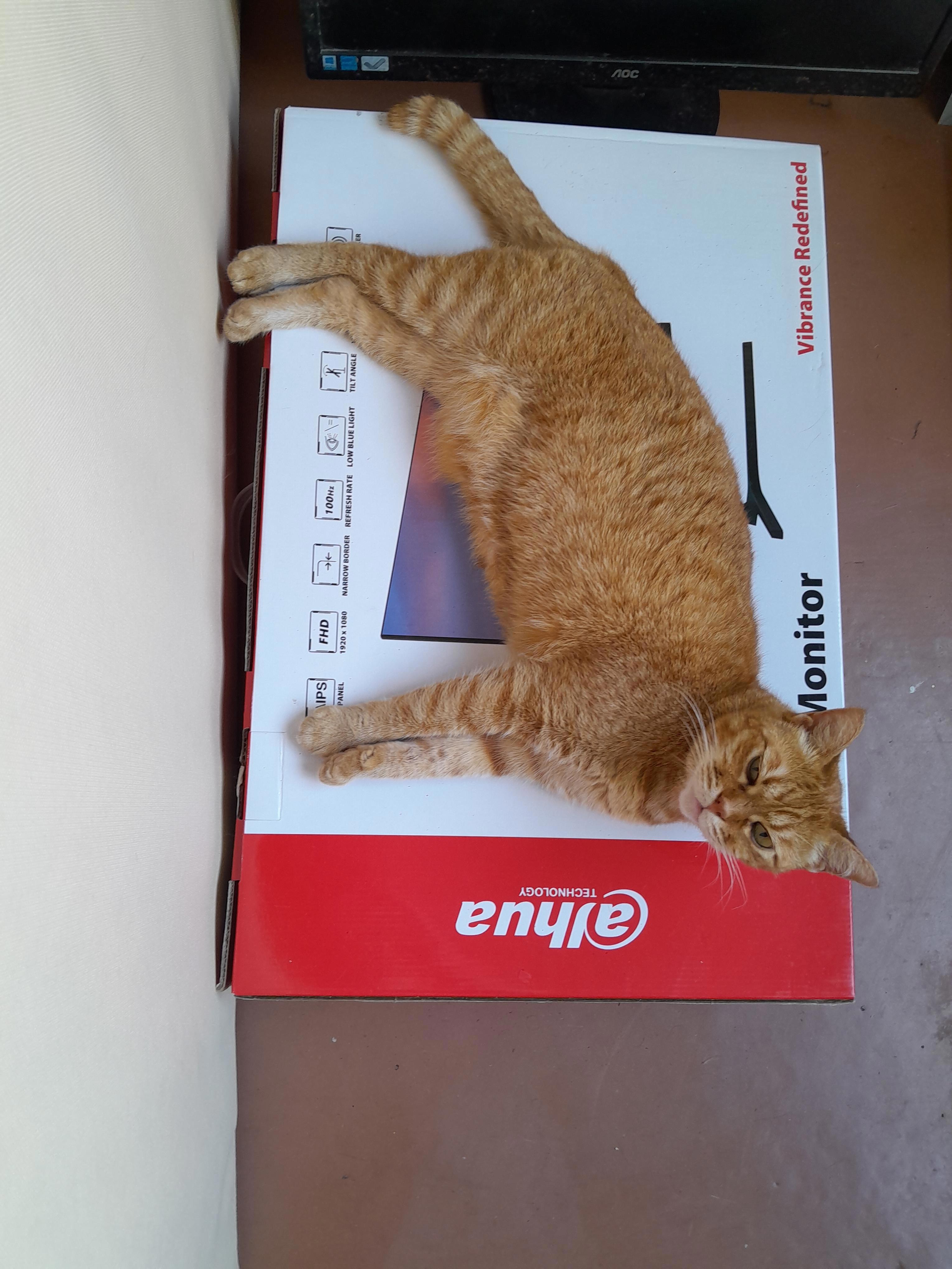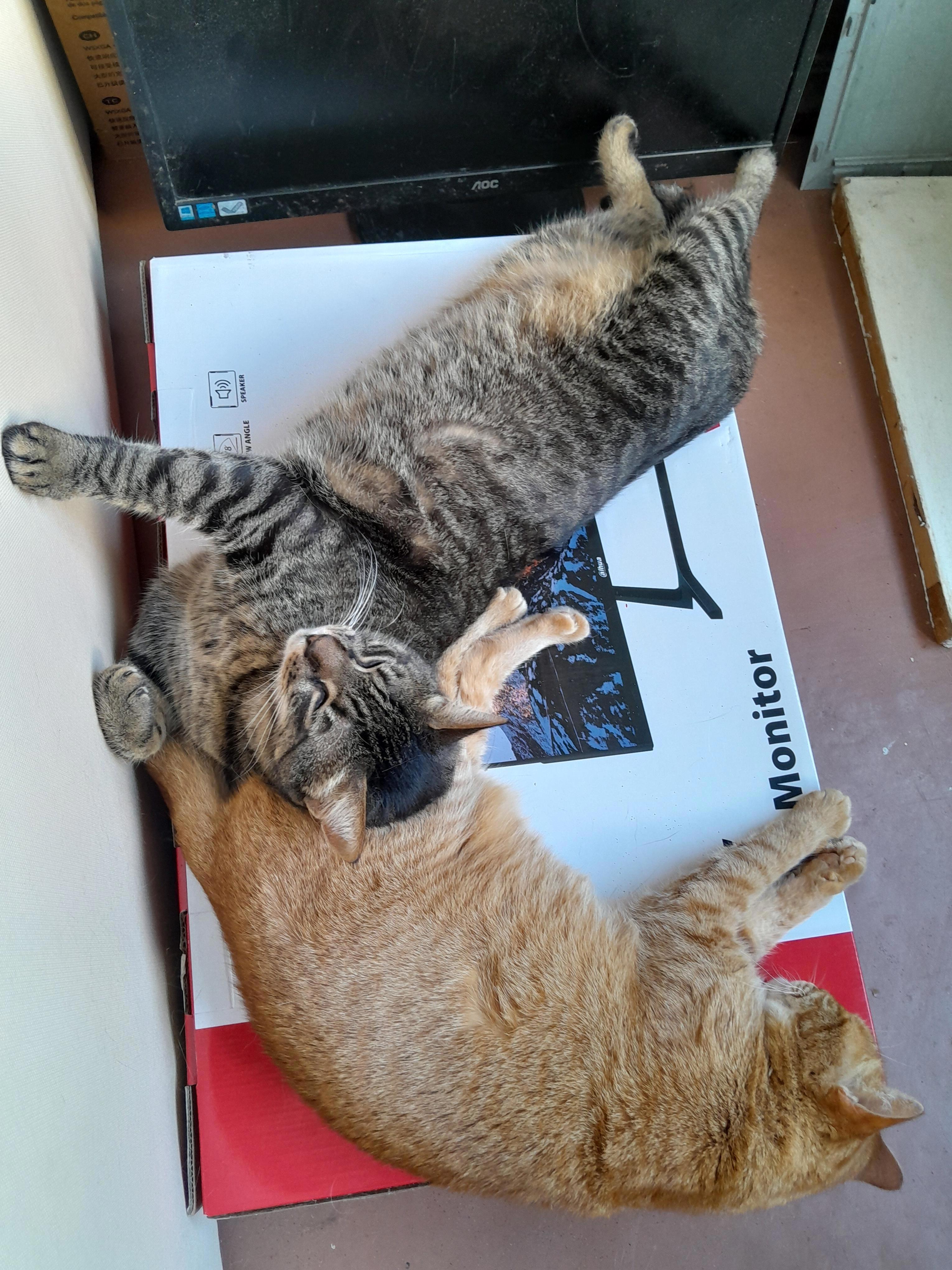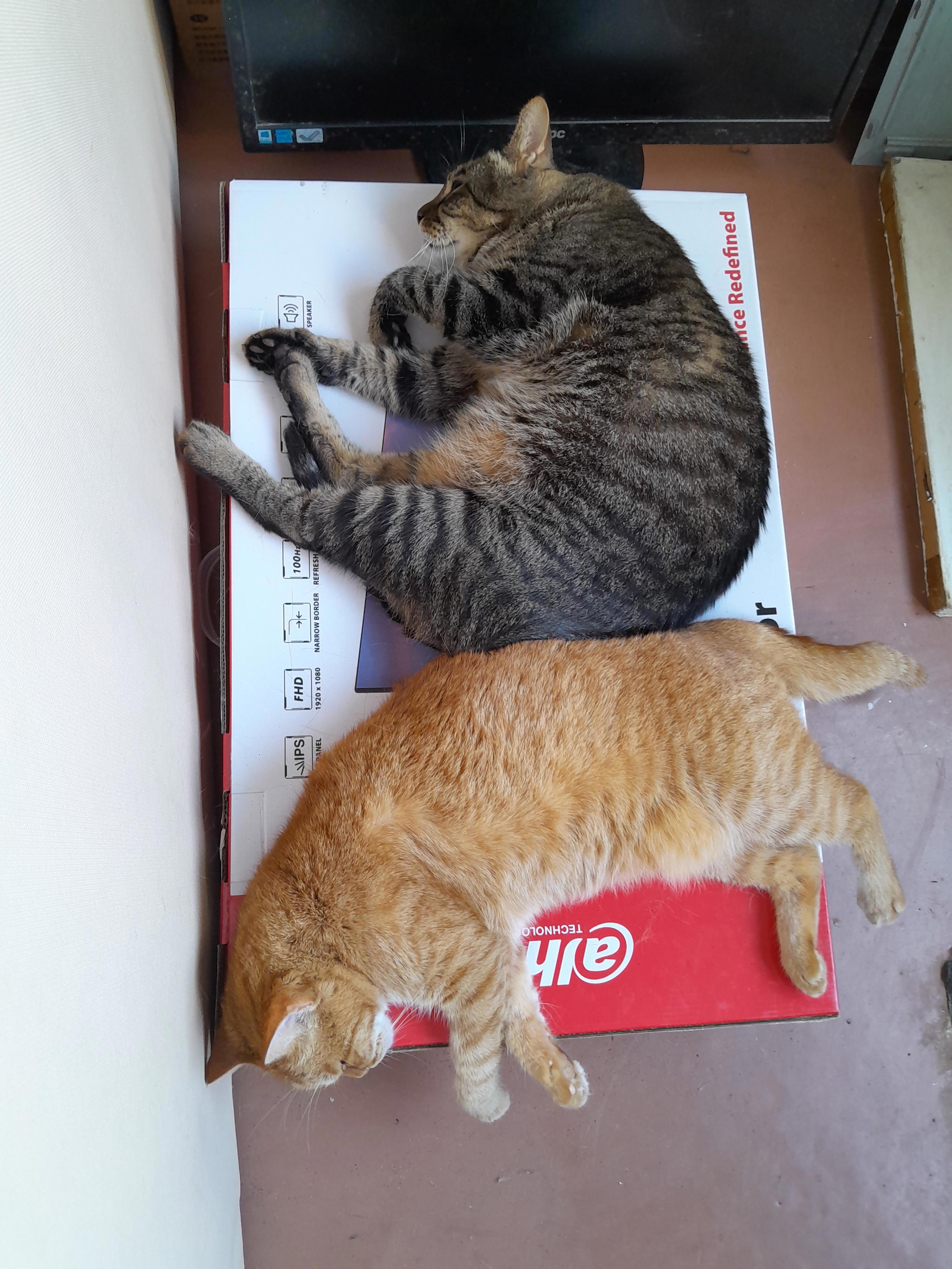 Наглая рыжая кошка свалила коробку на землю и улеглась на ней спать! А потом к ней подтянулся и серый... Так что они теперь вдвоём на неё спят, а если я пытаюсь их выпнуть, даже пиная ногами, мгновенно возвращаются, снова скидывают коробку плашмя и дрыхнут! >:(