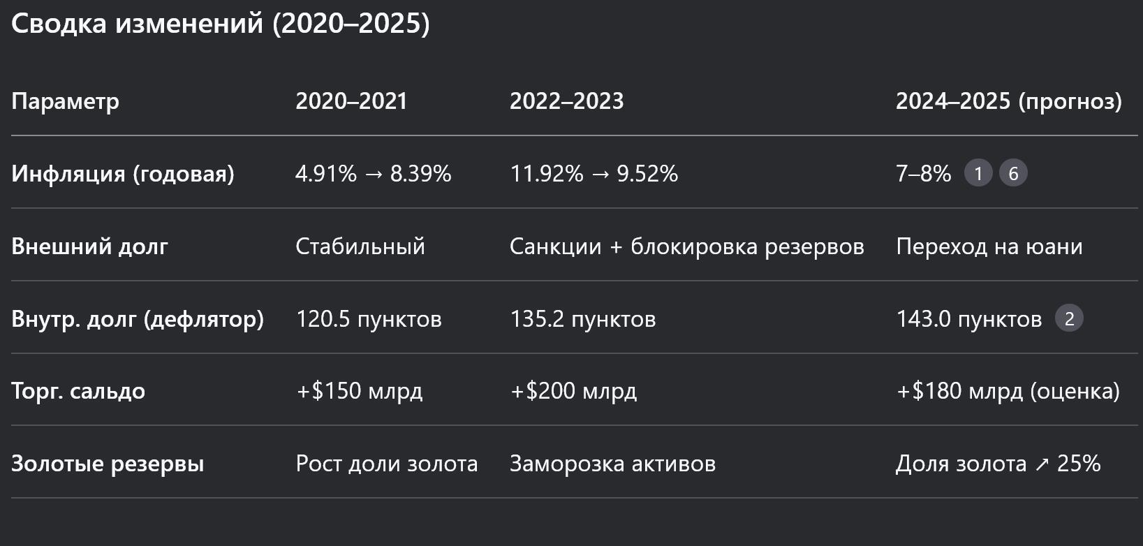 Кризисы 2020–2024 выявили парадокс устойчивости: даже при инфляции 9–12% Россия сохранила торговое сальдо и контроль над долгами через резервы в альтернативных активах (золото, юани). Однако для снижения инфляции до целевых 4% к 2026 году требуется сокращение бюджетного дефицита и глубокая перестройка цепочек поставок