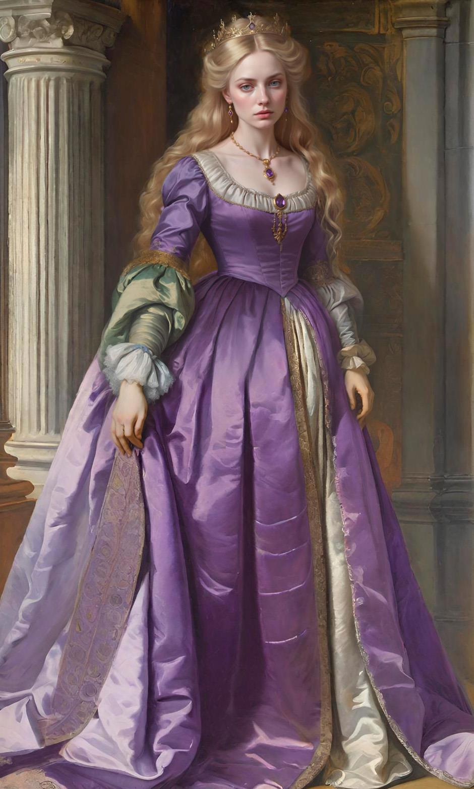 Автор: Анна МиолайКоролеве Иоленти хоть и посвящено в книге гораздо меньше глав, чем той же Мэй или Таре с ее компанией, однако ее портретов у меня почему-то нагенерилось прямо много. Вот например, максимально в стиле барокко, даже мятое платье прям в тему:
