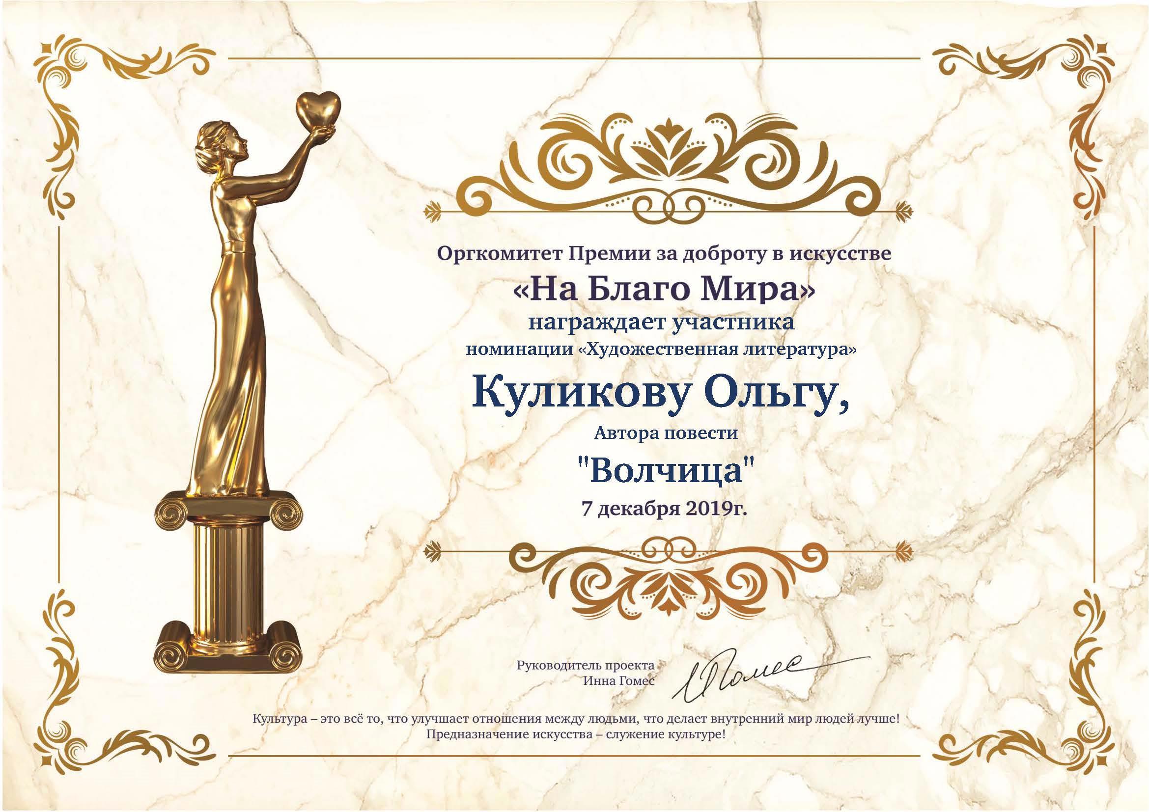 Мы, с моей любимой повестью «Волчица» удостоены диплома премии «На Благо Мира» за доброту в искусстве, и почётного 66 места из 195. Это большая радость для меня и моего творения, ведь мы были услышаны, и надеюсь, внесли свою крошечную лепту в одно большое дело — доброе искусство. Ведь повесть именно об этом — о добре, любви, верности, счастье, красоте и гармонии природы. И мне очень хочется верить, что нашим читателям удалось отдохнуть душой, отогреться и немножечко отвлечься от повседневной рутины — это и было главной целью написания повести.