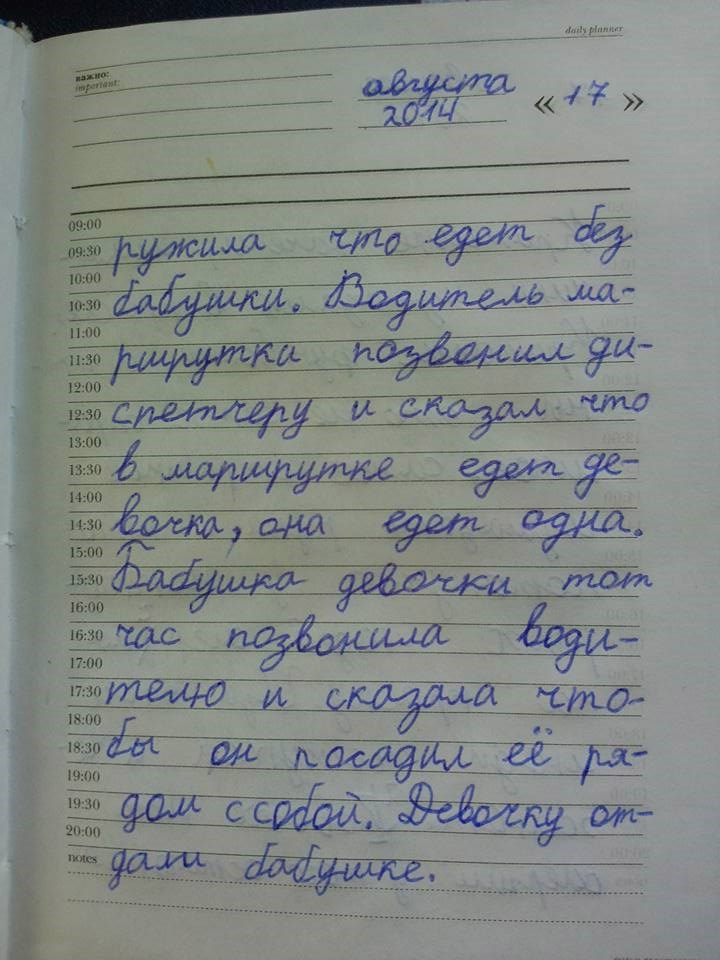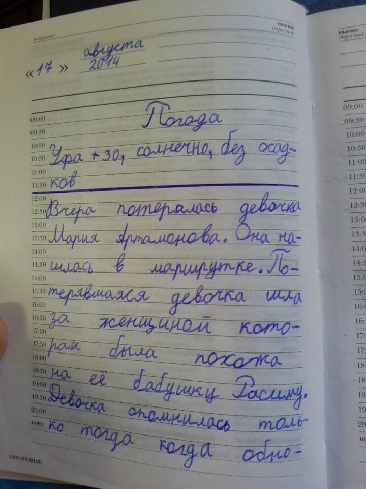 Вчера потерялась девочка Маша Артамонова. Она нашлась в маршрутке. Потерявшаяся девочка шла за женщиной которая была похожа на ее бабушку Расиму. Девочка опомнилась только когда обнаружила что едет без бабушки. Водитель маршрутки позвонил диспетчеру и сказал что в маршрутке едет девочка, она едет одна. Бабушка девочки тотчас позвонила водителю и сказала чтобы он посадил её рядом с собой. Девочку отдали бабушке.