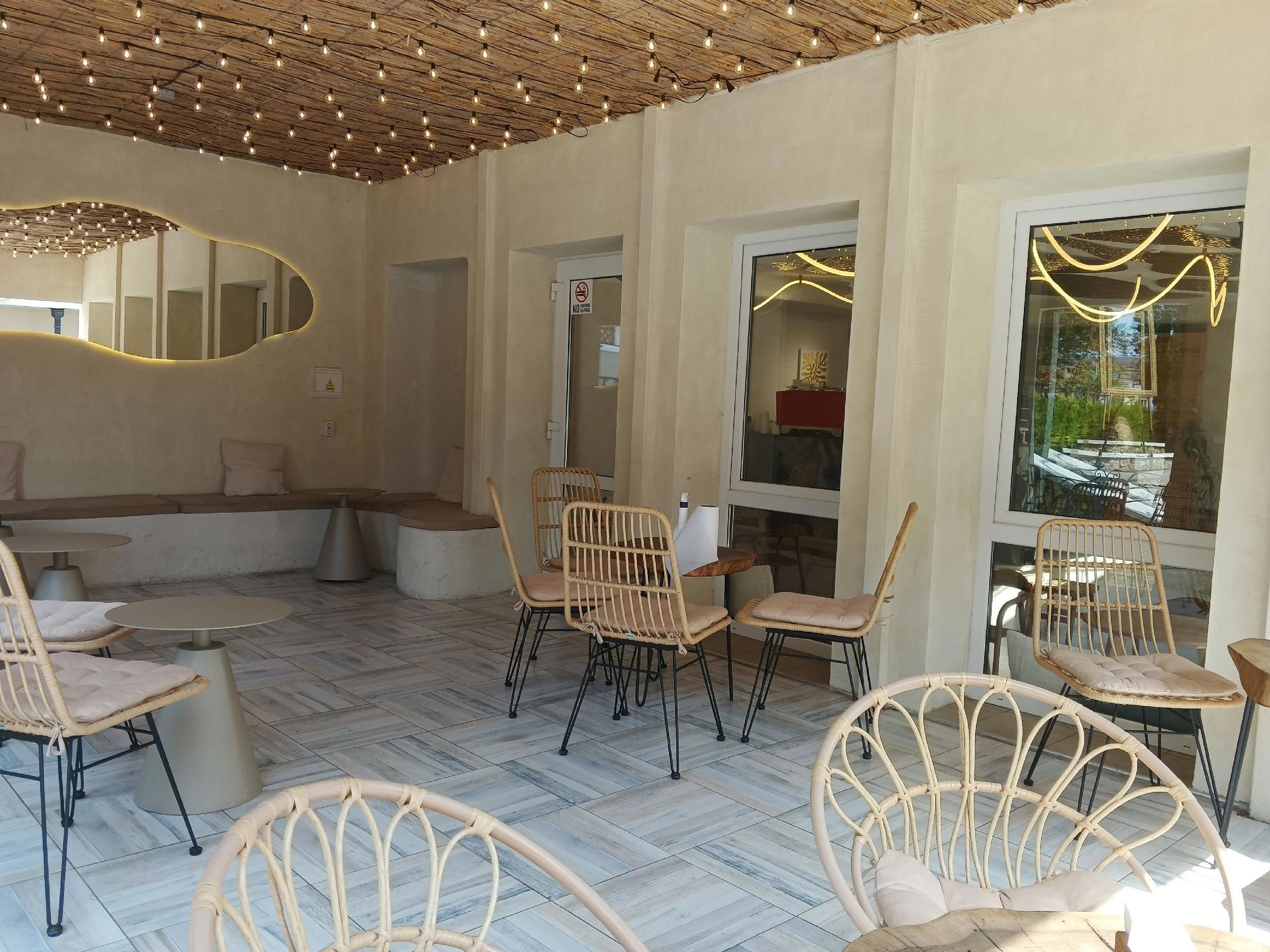 Открытая терраса очень приятное место. Тень, ветерок, в зной не жарко, в дождь - не мокро. Если прохладно, предлагают пледы. Лепота.