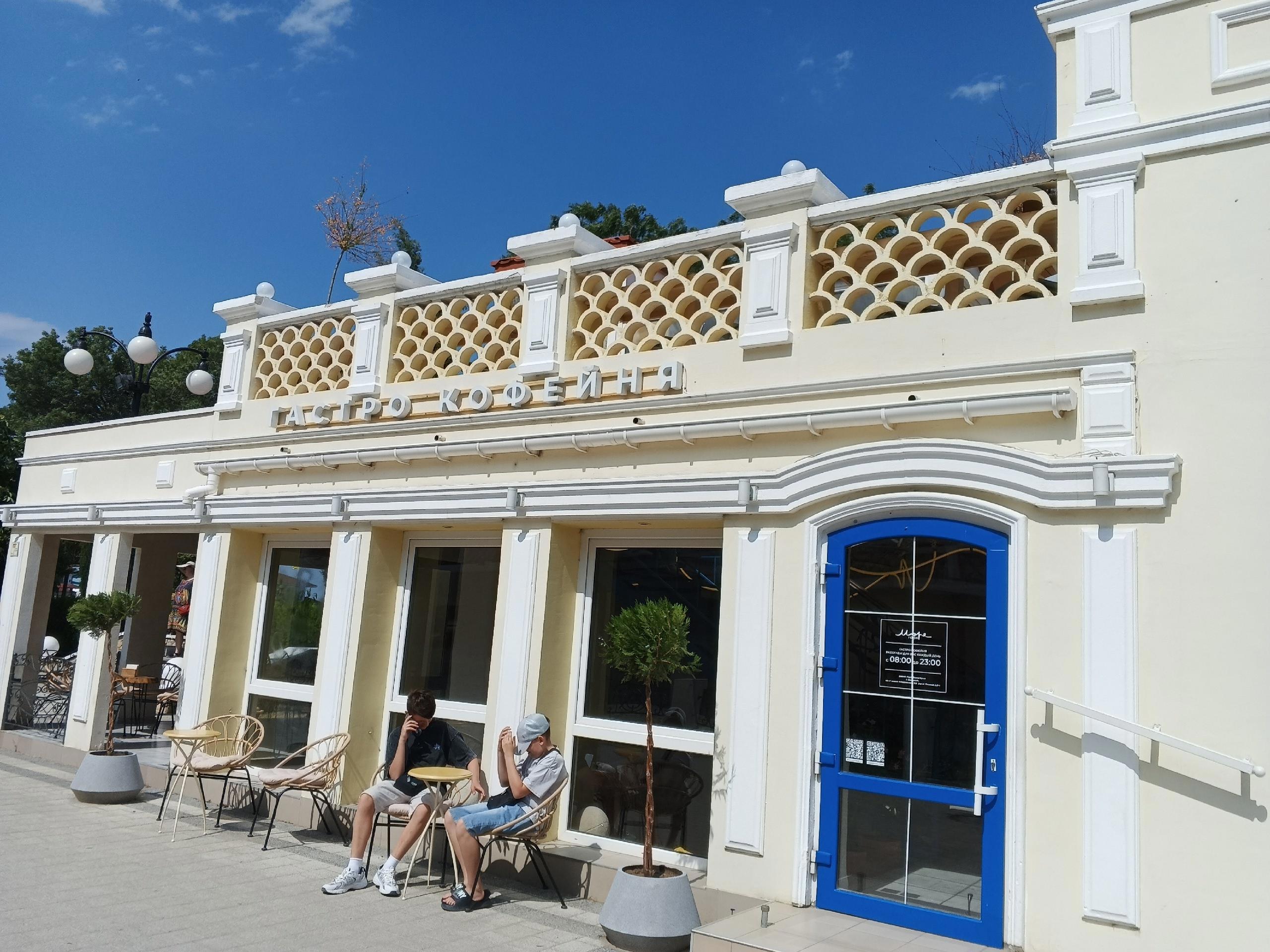 Так что, начнём с нового кафе на проспекте Айвазовского. Оно расположено ровно напротив галереи. Еще в прошлом году здесь был ресторан морепродуктов, немыслимо дорогой и с большой претензией. Претензия, как я понимаю, его и притопила. Теперь на его месте Гастро кофейня.