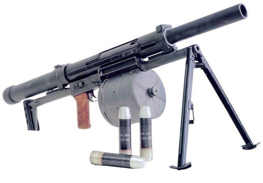 Патроны те же – от АГС-17. Вес гранатомёта без патронов – 10 кг. Питание от коробчатых магазинов на 5 патронов или дискового на 10 патронов, но огонь только одиночными. Этот гранатомёт неофициально называют «снайперским» за высокую точность. Не знаю, стоит ли он сейчас на вооружении, или наши военные начальники, как всегда, ждут поклёвки от жаренного петуха.