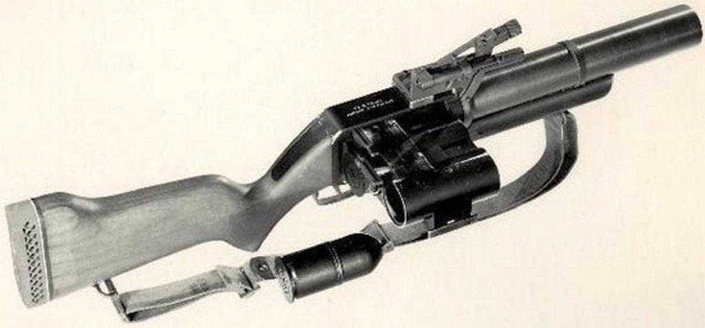 Но была ещё одна попытка. На этот раз в 1967 году за основу конструкции Alfred F. Kermode (Альфред Кермод) взял обычный помповый дробовик. Получилось вот такое ружьё «China Lake NATIC» с тремя гранатами в магазине и одной – в стволе: