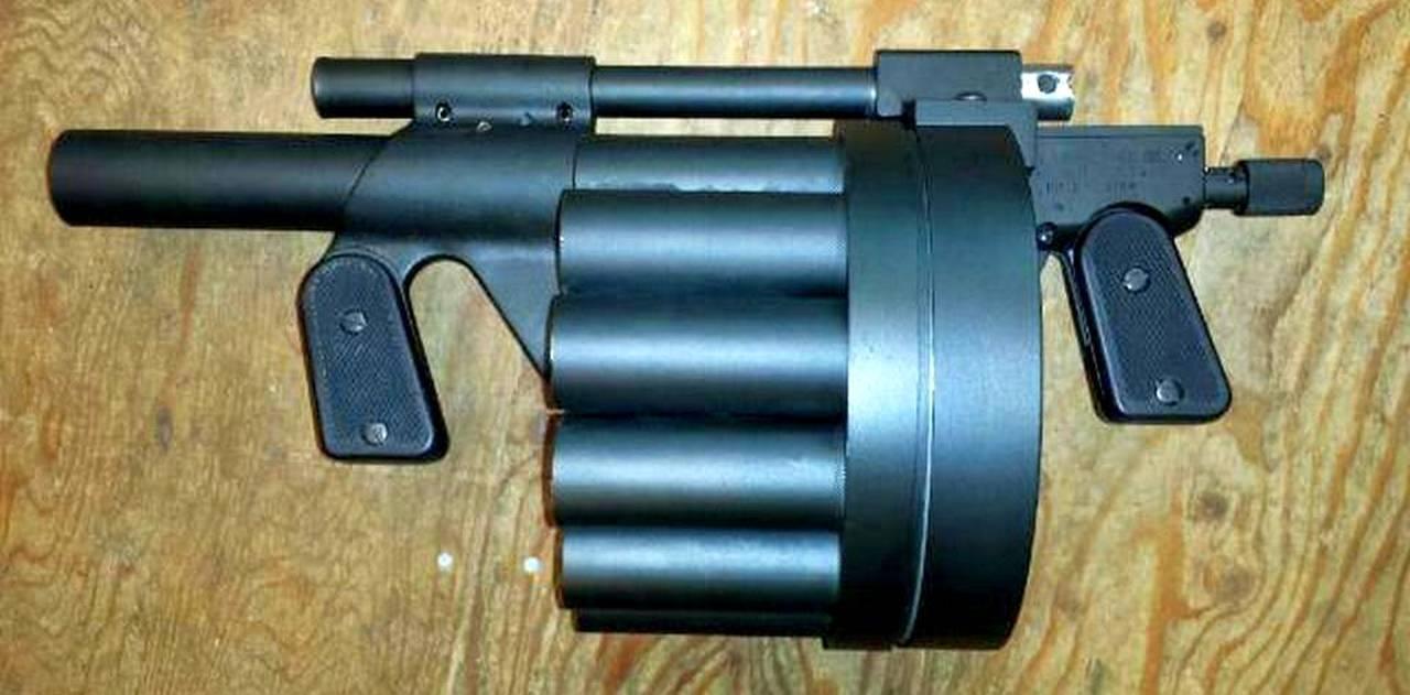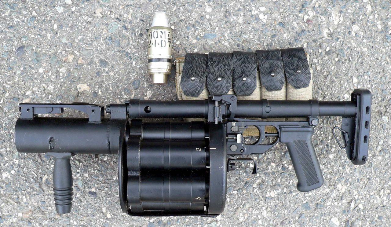 Характеристики: Калибр: 40 мм, барабан на 6 патронов, вес без патронов – 5,6 кг, дальность выстрела 100-380 м. Патроны безгильзовые от подствольника, поэтому ячейки барабана являются и стволами одновременно. У ручной пушки получились небольшие размеры: