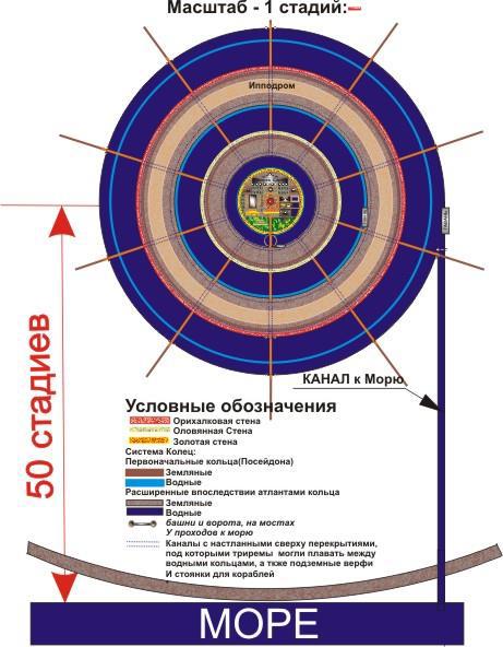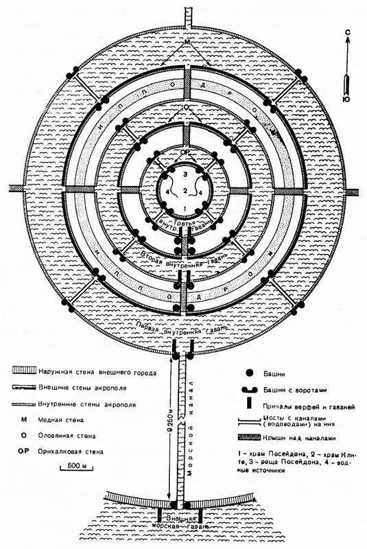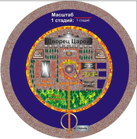 В центре нее был остров-Акрополь, диаметром 965 м (5 стадий), который был окружен 2-мя земляными валами (внешний - покрыт медью, внутренний - литьем из олова, стена самого акрополя - орихалком) и 3-мя водными каналами (самый большой - ширина 579 м (3 стадия), средний - 386 м (2 стадия), вокруг Акрополя - 193 м (1 стадий)), имел два родника - теплый и холодный (вокруг которых организованы были купальни) и соединялся с морем каналом, длиной 9, 7 км (50 стадиев) и ширина - 96 м (3 плетра). В состав Акрополя входили: святой Храм Клейто и Посейдона (обнесенный золотой стеной - «дом матери») и «варварски» выглядевший Храм одного Посейдона (со статуей самого бога на колеснице с 6 конями, 100 нереид на дельфинах и другими статуями). Снаружи вокруг храма стояли изображения жен и прямых родственников царей и дары от вассалов.