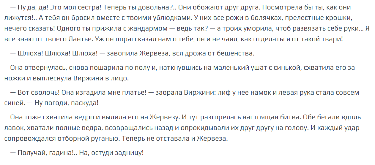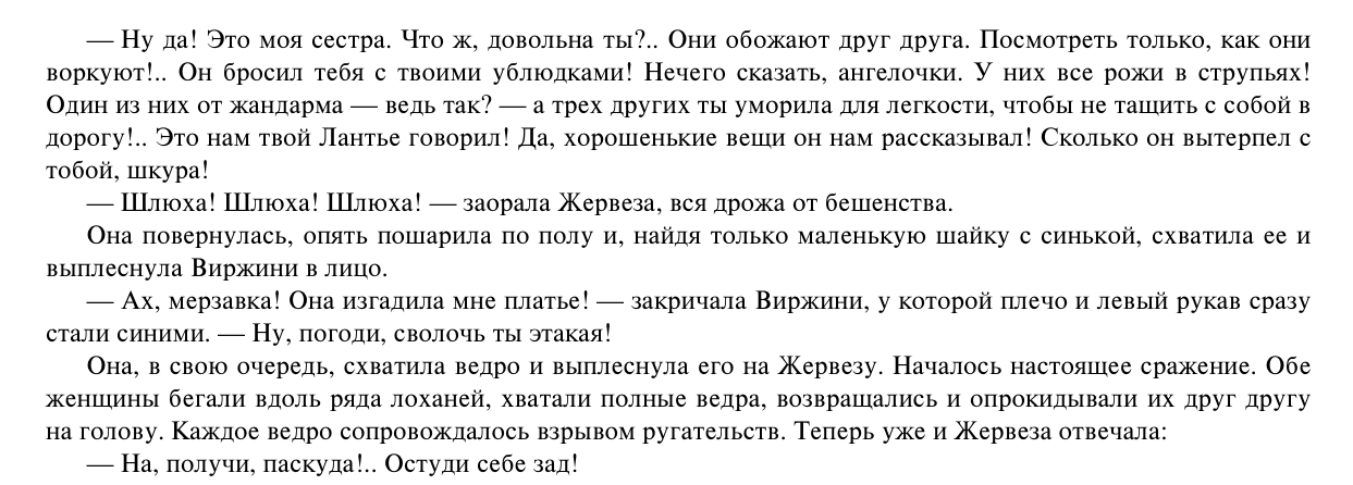 Например, по рекомендации Жаринова (видео) вы решили прочитать классику французской литературы – Эмиль Золя, шестой том (Западня). У вас есть выбор: каким-то чудом найти и скачать древний перевод Михаила Ромма (на текущий момент пережил 7 изданий). Или купить самую распространённую версию в переводах Моисеенко / Шишмарёва (крайнее издание от 2025 года). Обыватель, начитавшись восторженных отзывов, вряд ли отыщет перевод Ромма, скорее он начнёт читать или слушать по подписке в знакомых и оплаченных местах.