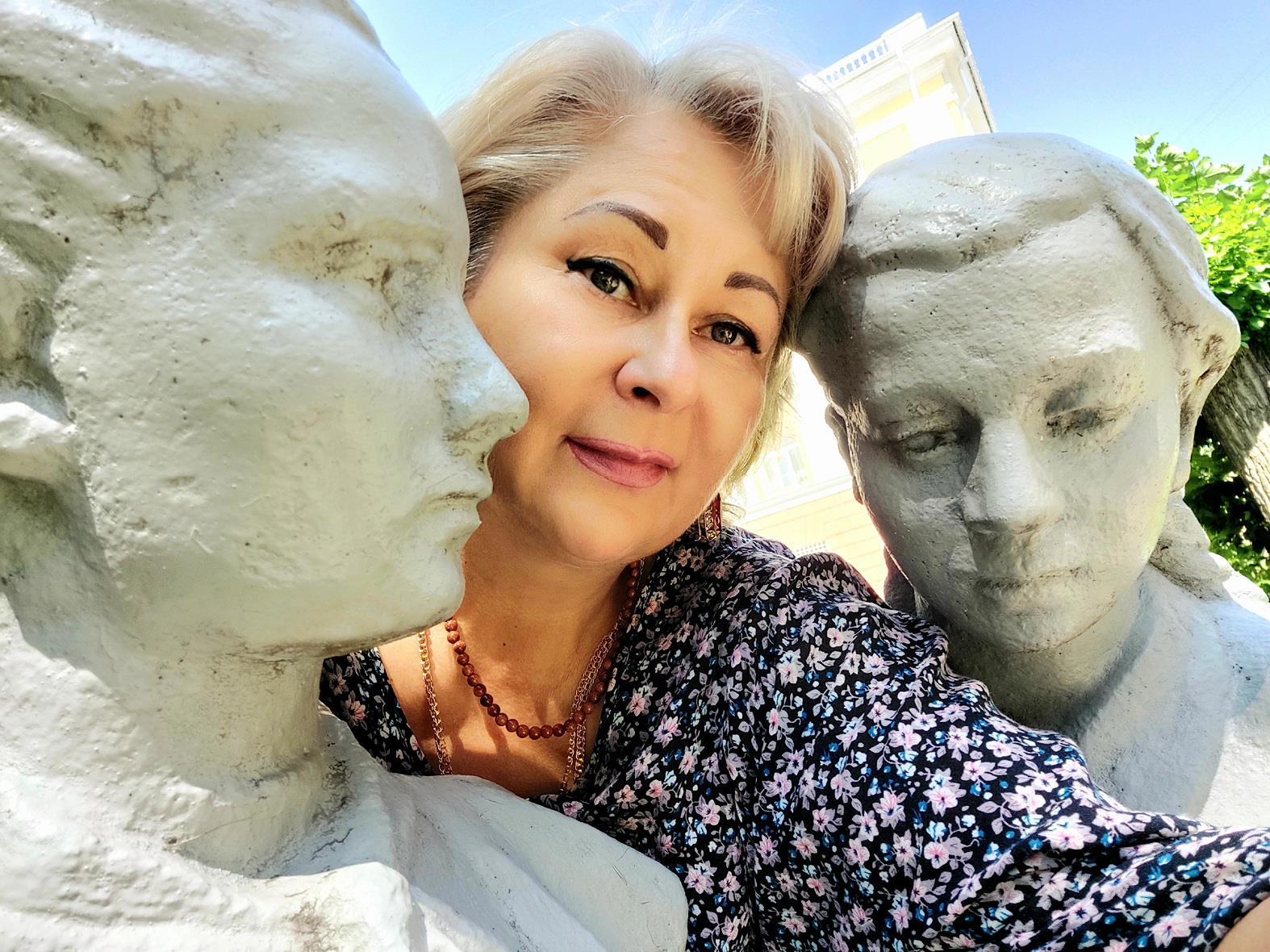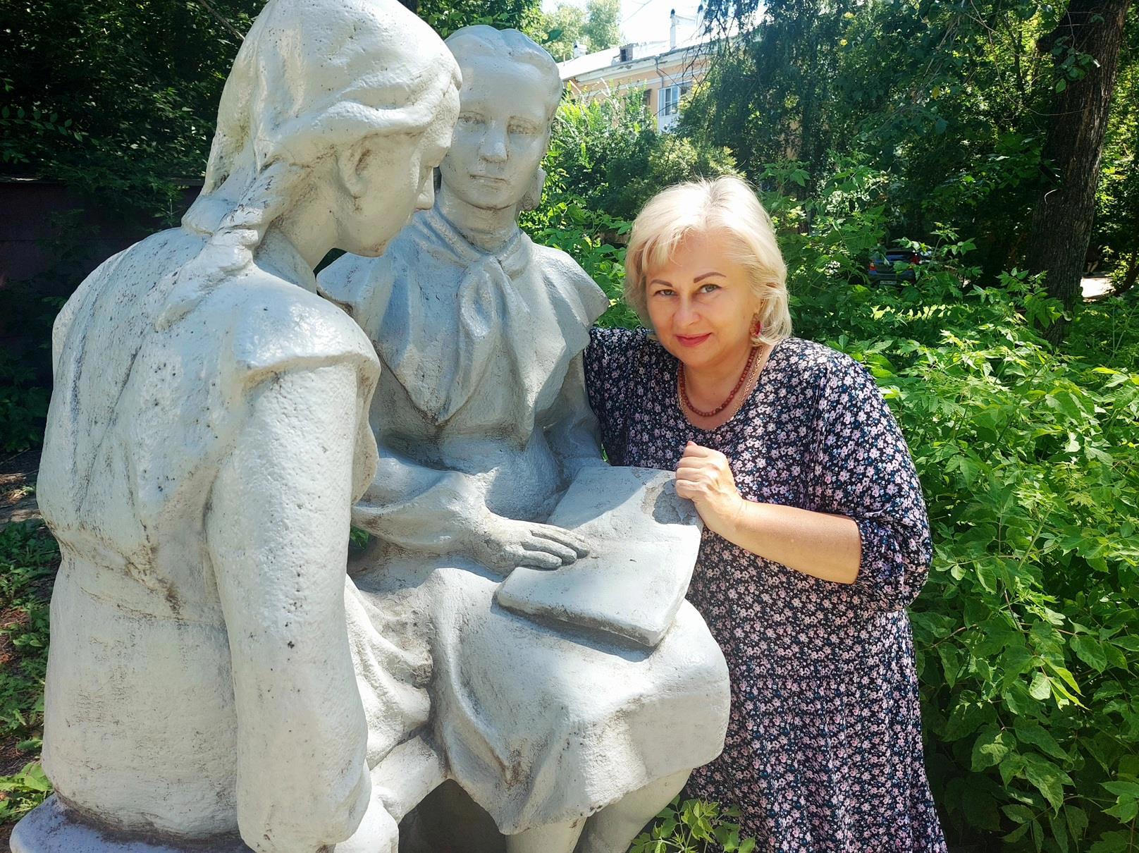 Две каменные читательницы, книга + одна живая писательница на постаменте в одном из дворов города Б.