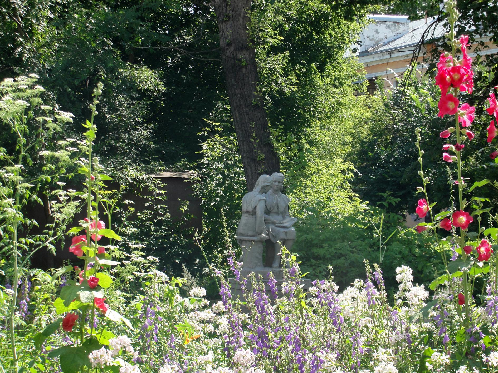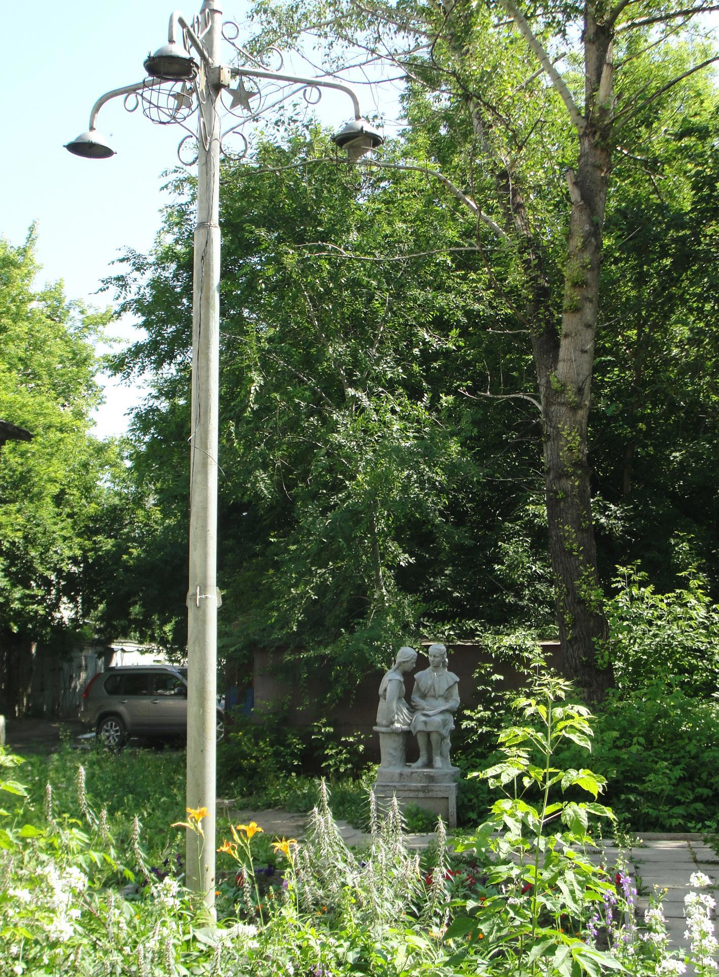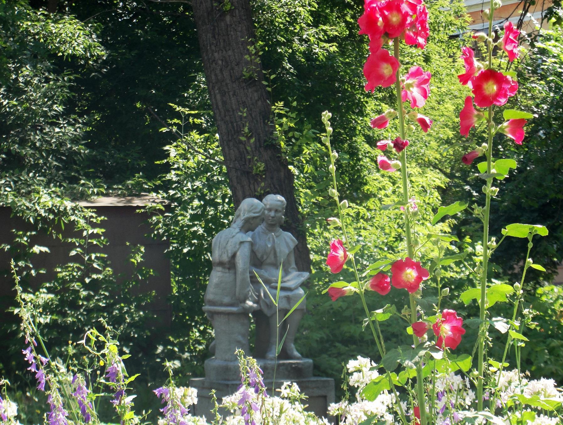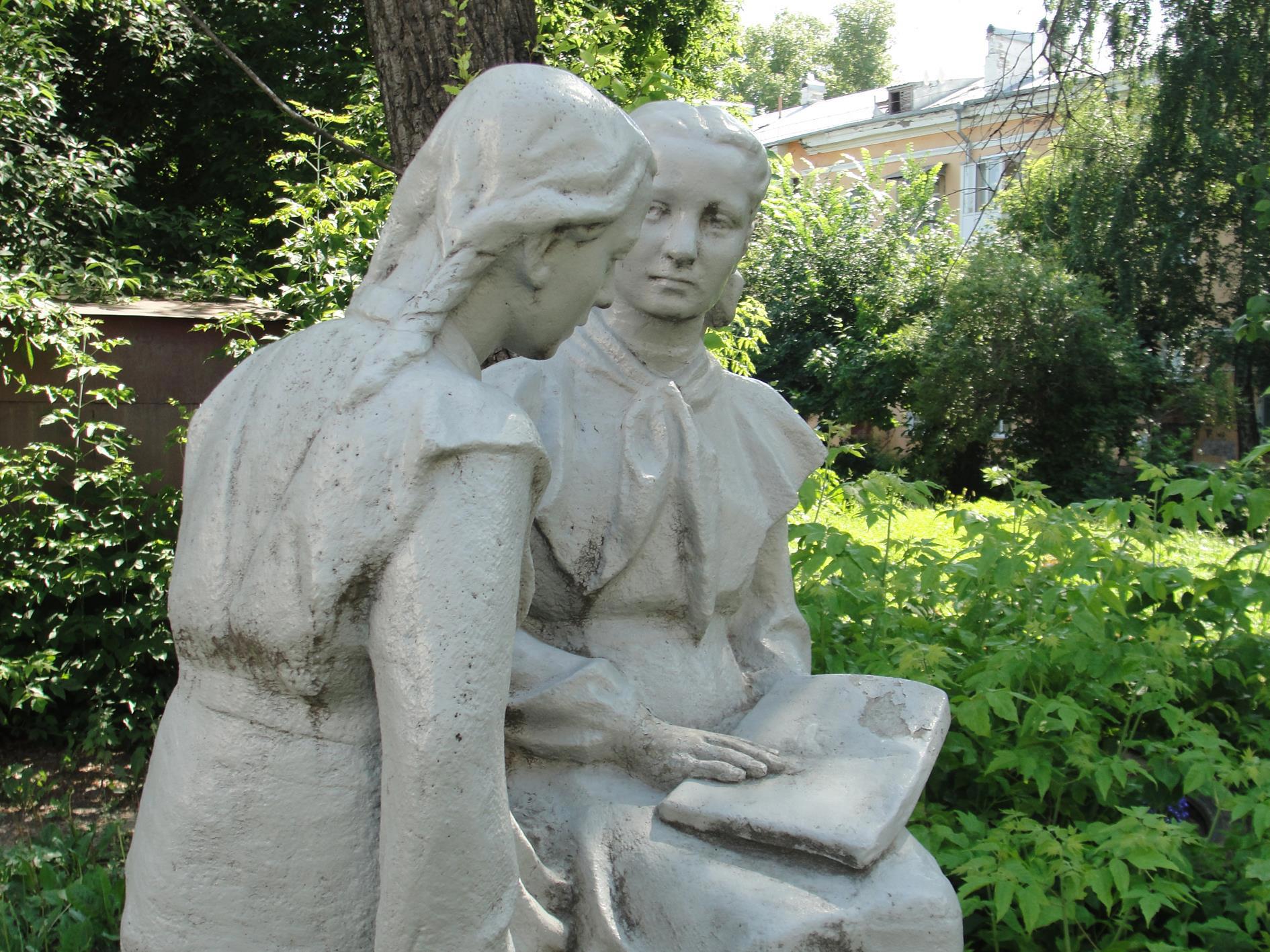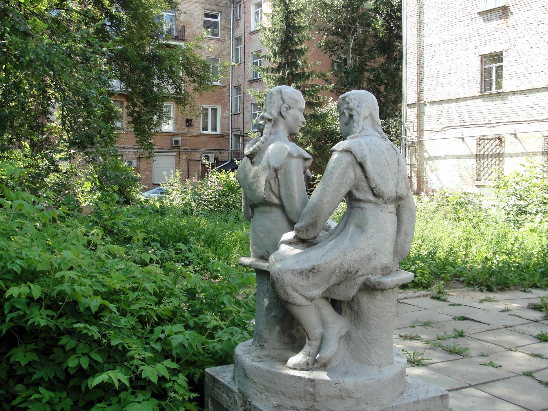 ♀Гуляя вчера по родному городу (Барнаул, Алтайский край), неожиданно в одном из его тенистых двориков в самом центре обнаружили этих двух каменных скромниц - "Пионерки читают книгу" (или даже скорее, учебник... слишком уж серьёзные у них лица...