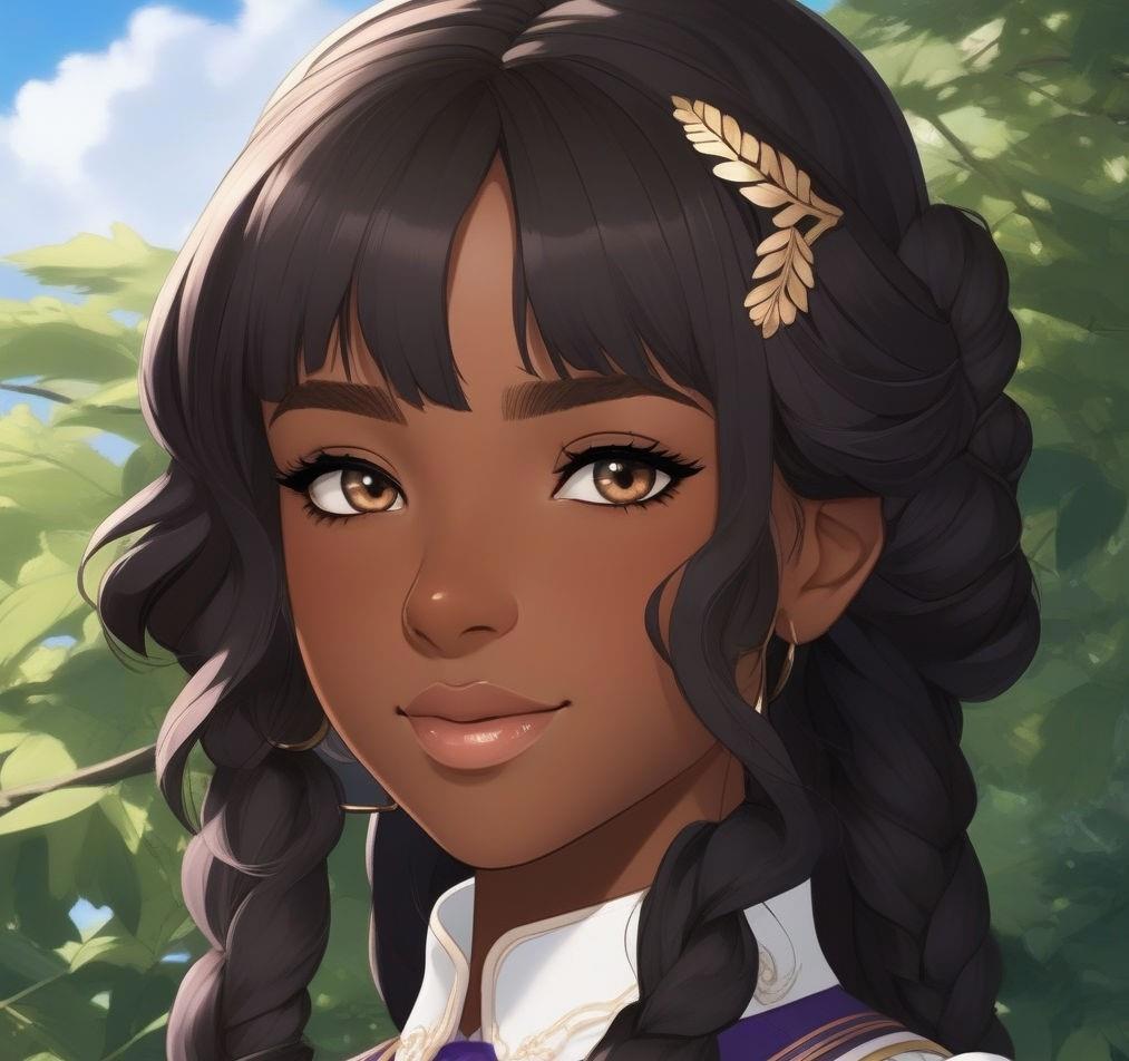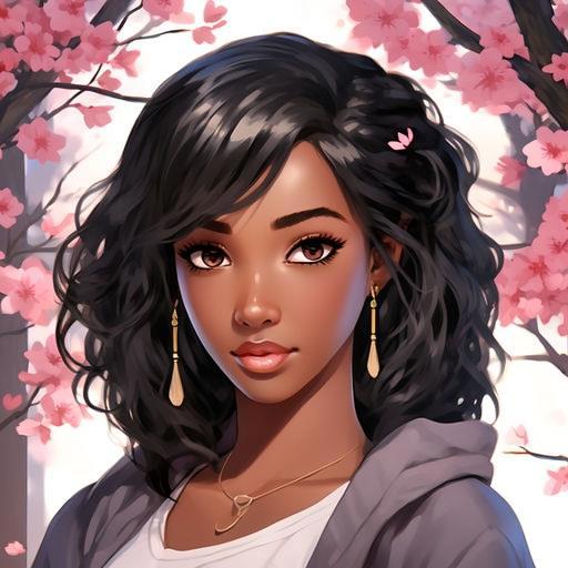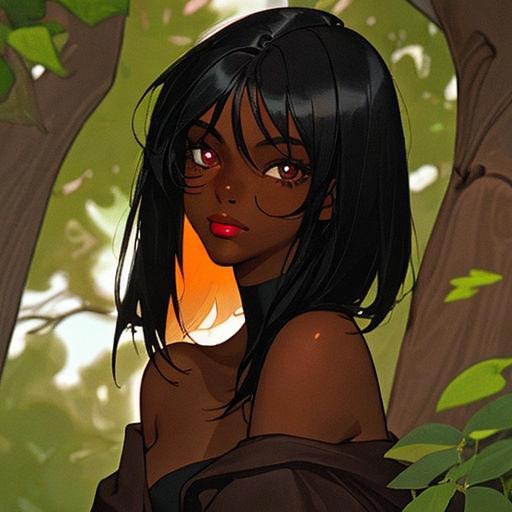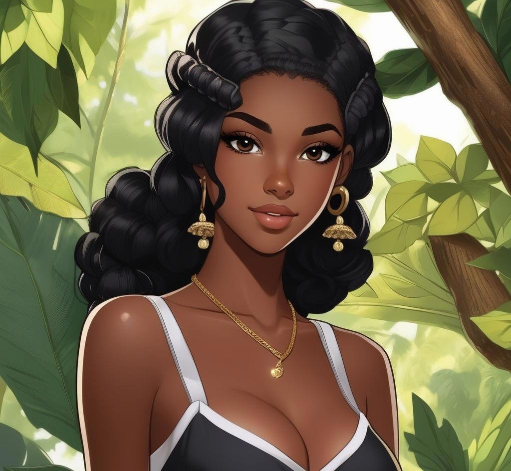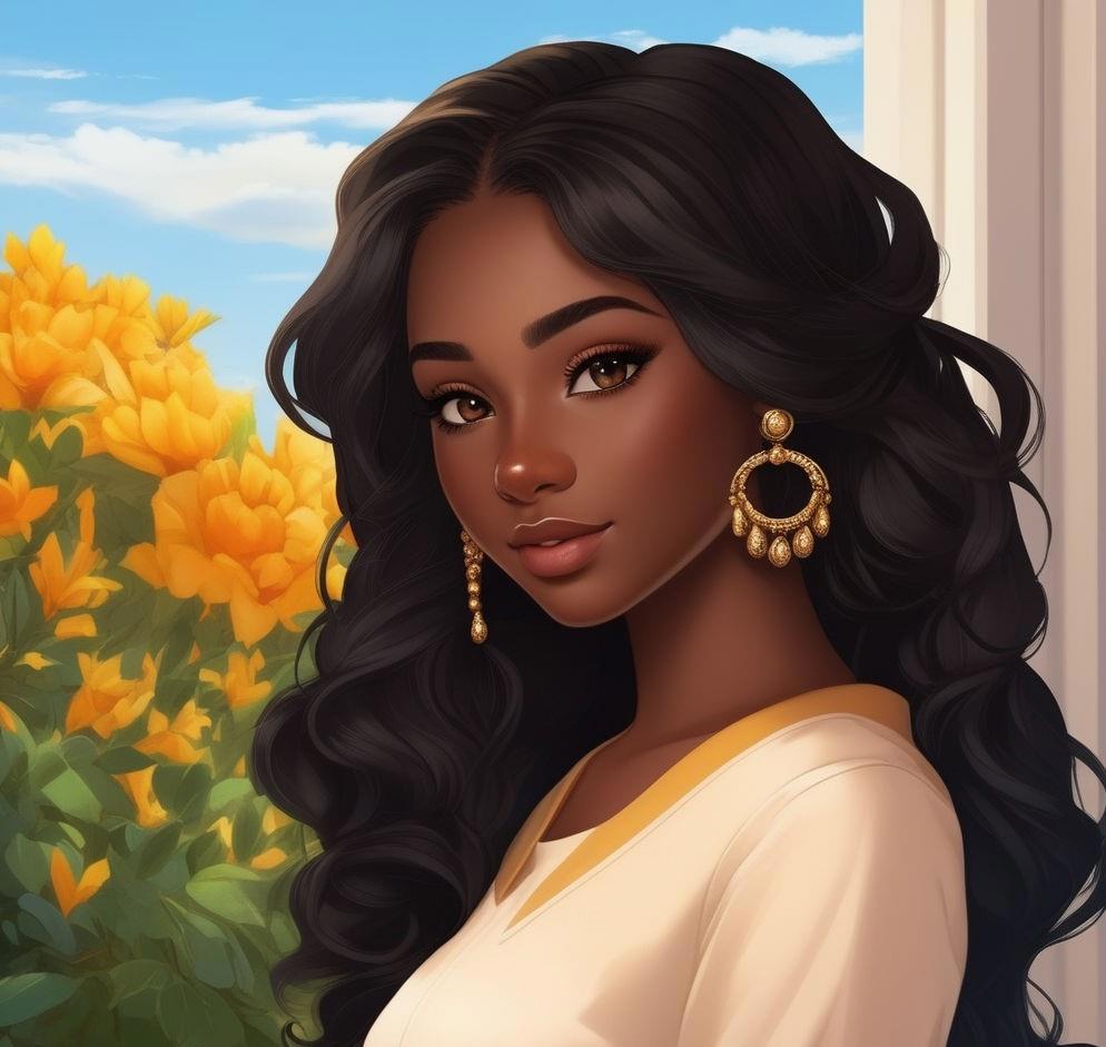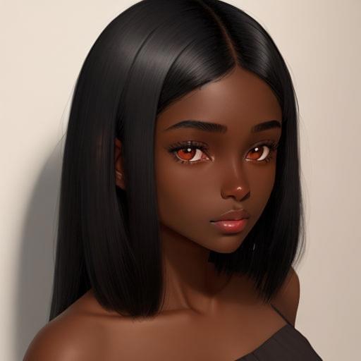 Девятнадцатилетняя девушка-афроамериканка с кожей черного цвета, с европейскими чертами лица - европейский нос, маленькие губы, прямые черные волосы ниже плеч и глазами цвета дубовой коры