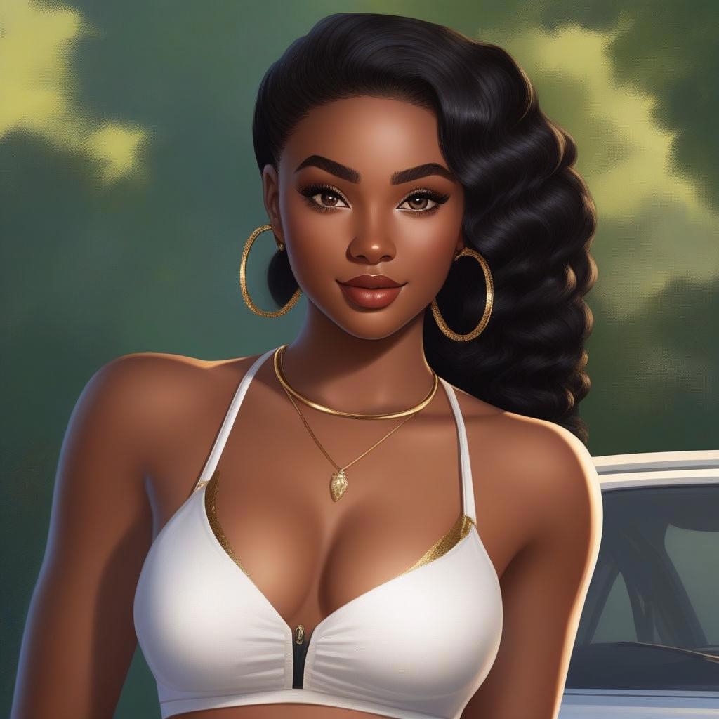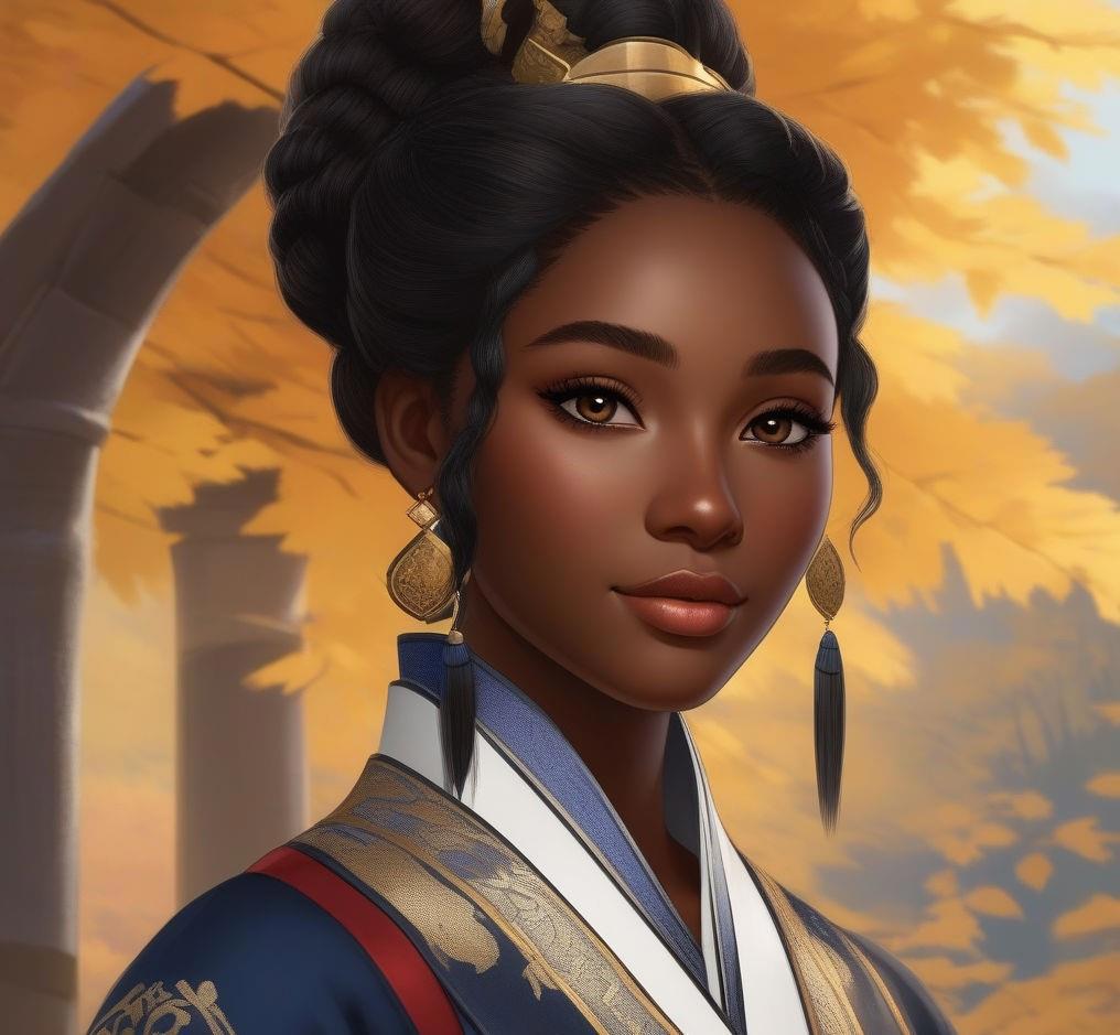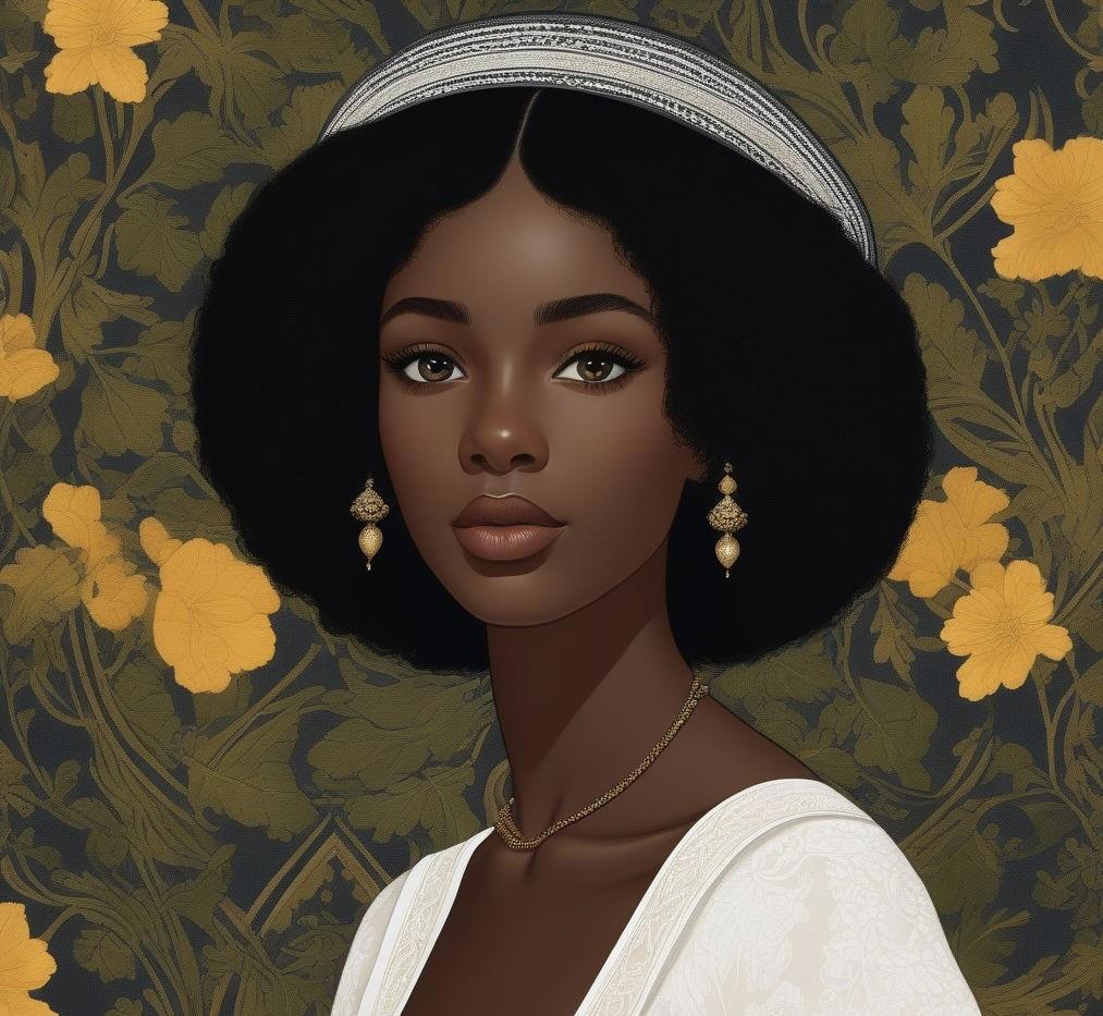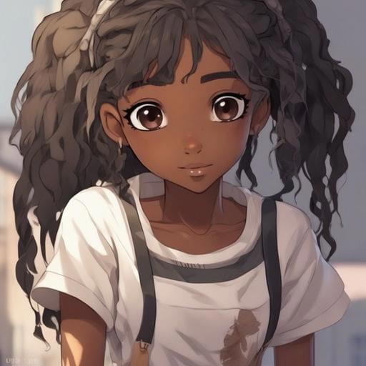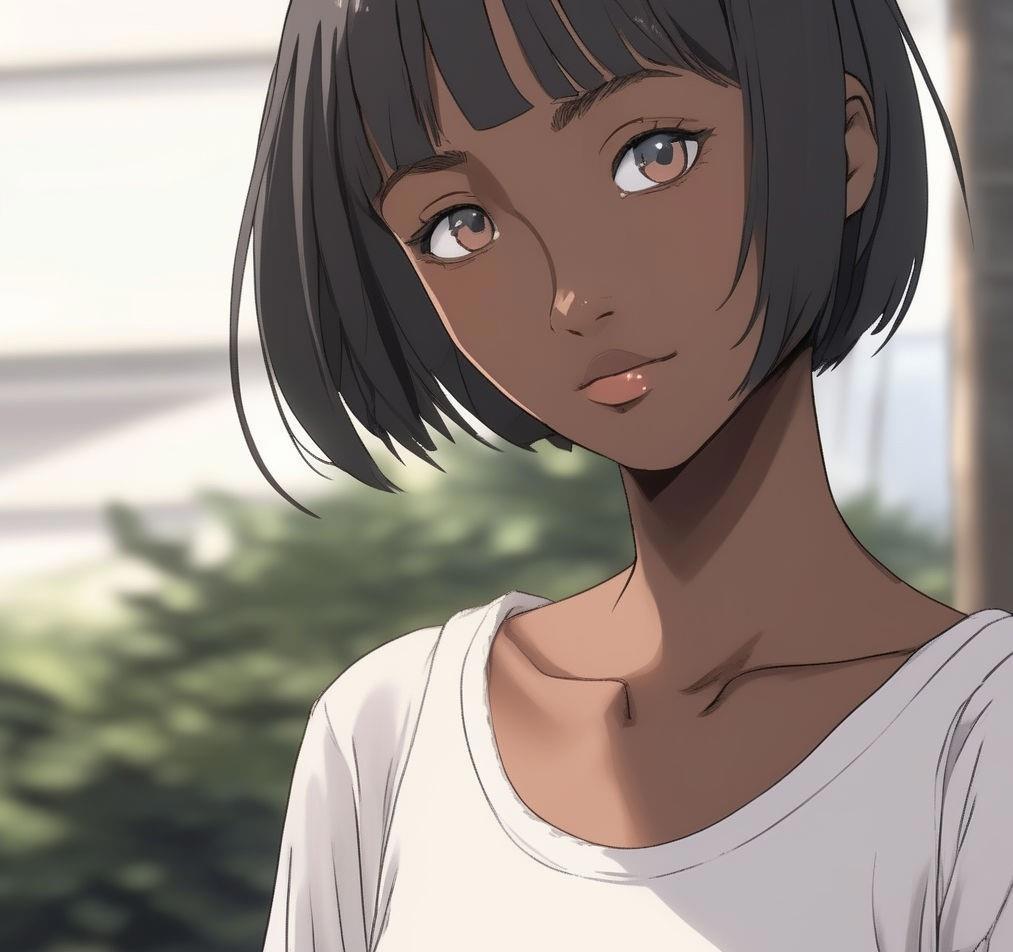 Девятнадцатилетняя девушка-афроамериканка с кожей черного цвета, с европейскими чертами лица - европейский нос, маленькие губы, прямые черные волосы ниже плеч и глазами цвета дубовой коры
