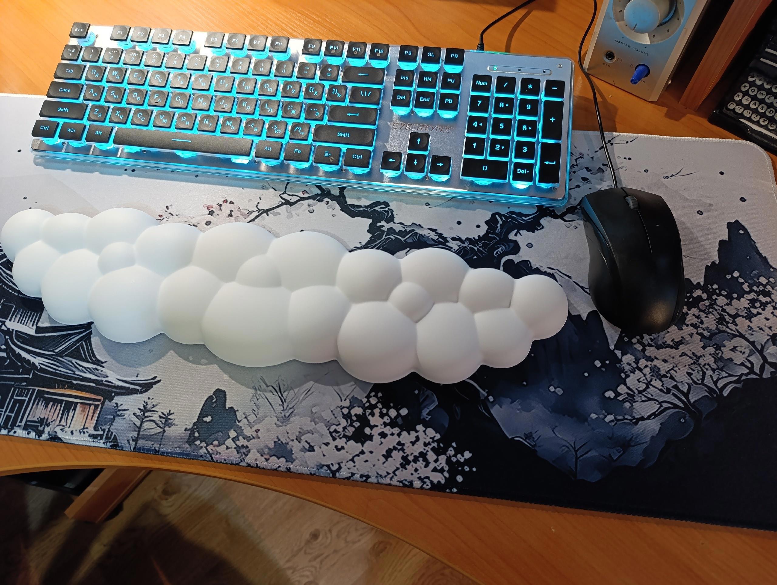 Облачко очень приятно ложится под руку, правда, только под левую. Для правой нужно что-то другое, потому что она постоянно подвижна. Светящаяся клавиатура — это не очень удобно, но яркость можно делать меньше: пока что приемлемо. Коврик под локти — вот это супер. В жару руки стали прилипать к столу, а теперь не только не прилипают, но ещё и мягко. Думаю, можно сделать лучше, в будущем займусь этим.