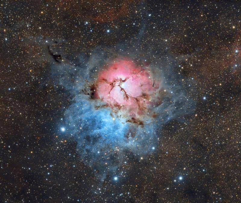Прекрасная разноцветная Трехраздельная туманность позволяет исследовать космические контрасты. Известная также как M20, она находится на расстоянии около 5 тысяч световых лет в богатом туманностями созвездии Стрельца. В этой туманности, находящейся в плоскости Галактики, расположена область звездообразования. В Трехраздельной туманности можно найти три основные известные в астрономии типы туманностей: эмиссионные туманности, красный цвет которых возникает вследствие излучения атомов водорода, отражательные туманности, голубое излучение которых объясняется отражением звездного света пылью, и темные поглощательные туманности, возникающие там, где на фоне более светлых образований появляются плотные пылевые облака. Яркая красная эмиссионная туманность разделена на три примерно равные части темными полосами пыли, поэтому туманность и была названа Трехраздельной. Столбы и струи длиной в несколько световых лет, образованные молодыми звездами, находятся выше и правее центра эмиссионной туманности. Они хорошо видны на изображениях крупным планом, полученных космическим телескопом им.Хаббла. Размер Трехраздельной туманности – около 40 световых лет. Она слишком тусклая, чтобы увидеть ее невооруженным глазом, а на небе планеты Земля занимает область, почти равную по площади диску полной Луны.